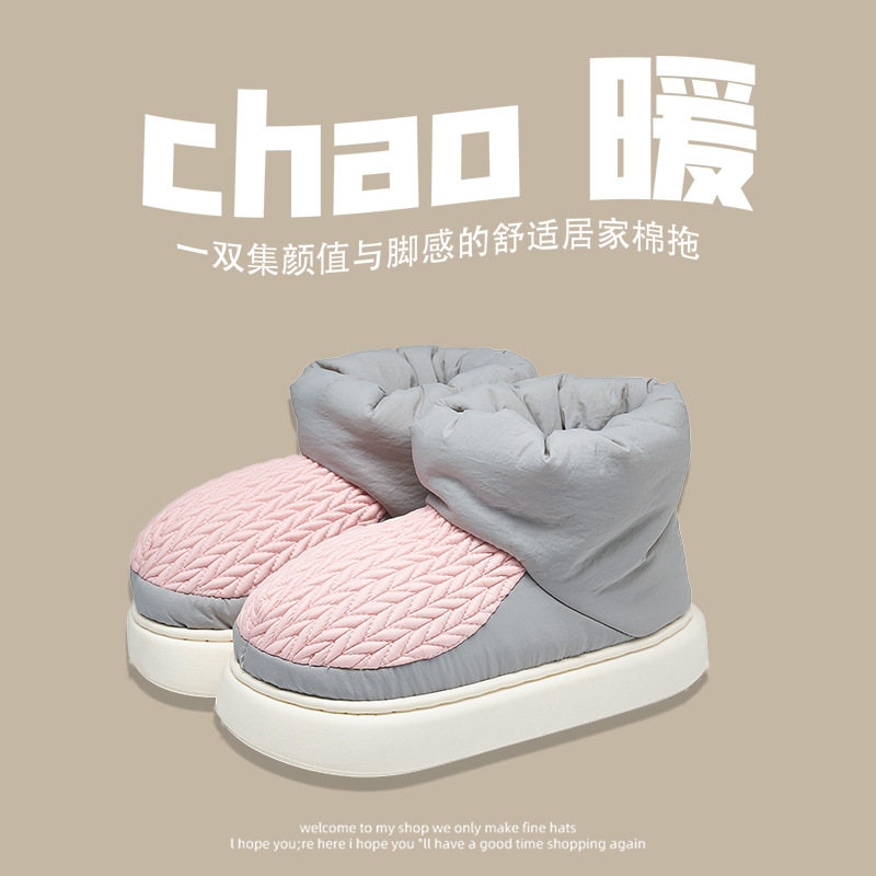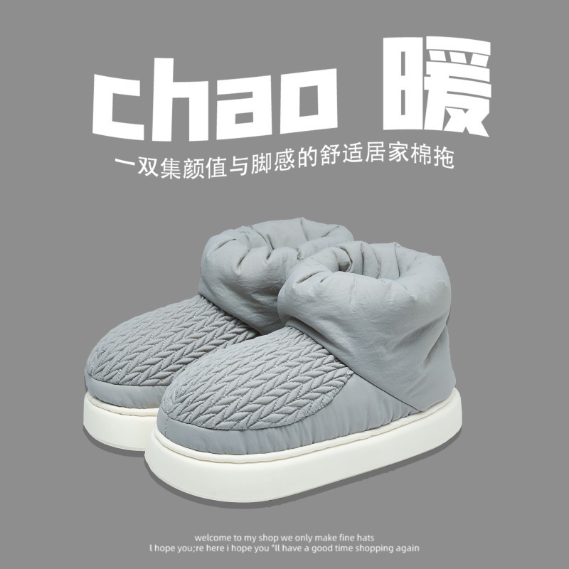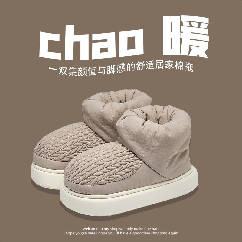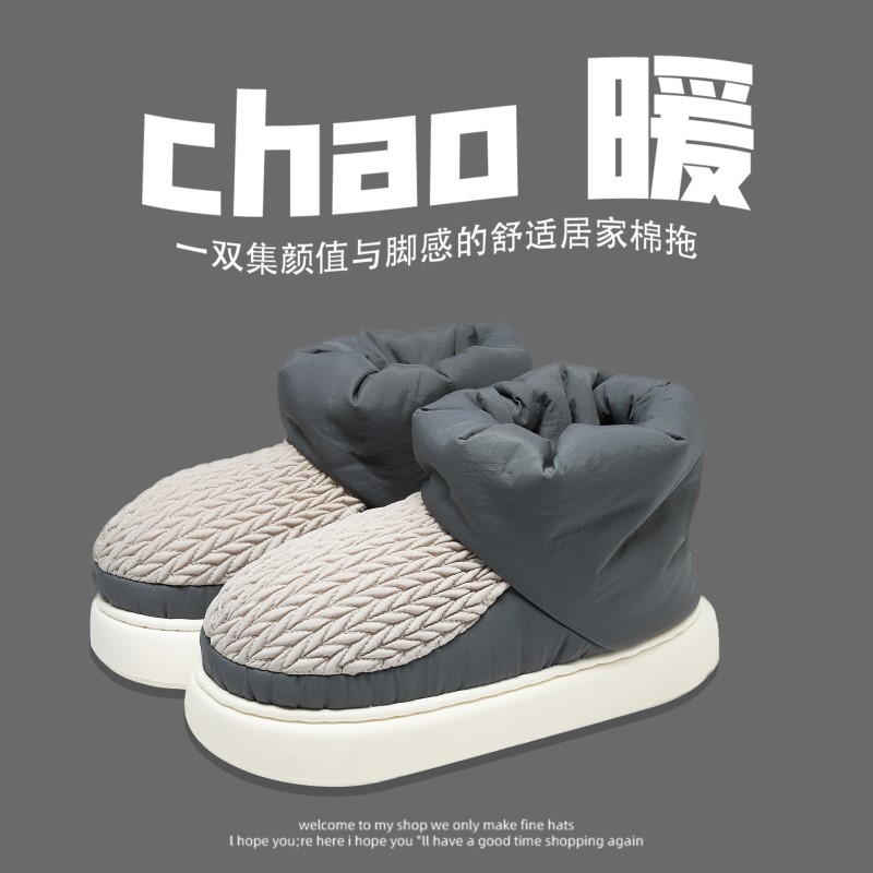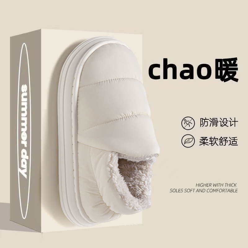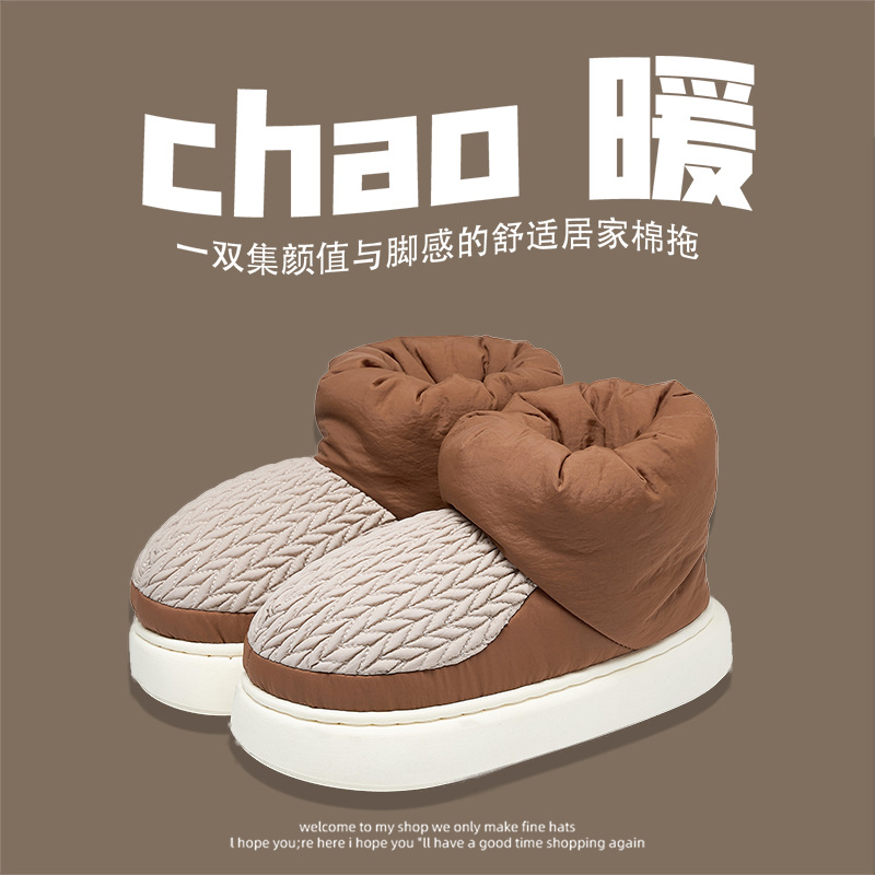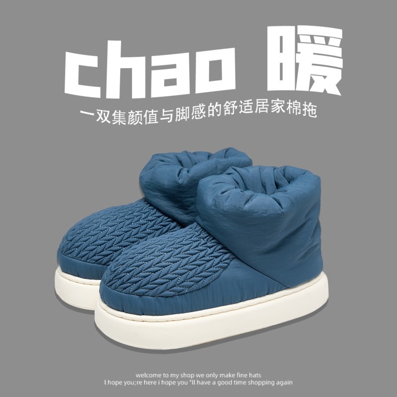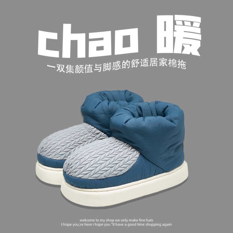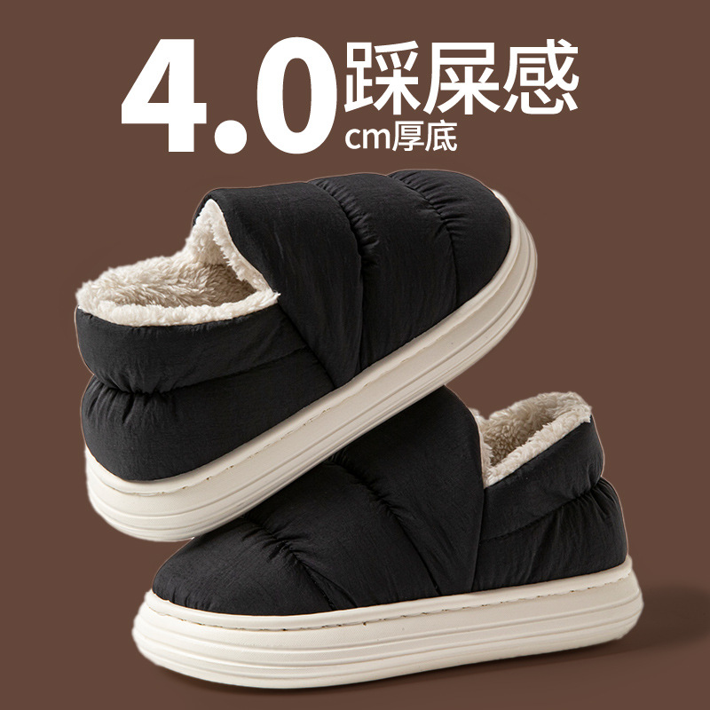 防水棉拖鞋男款冬季静音加绒保暖厚底包跟防臭羽绒布棉拖鞋女冬季
