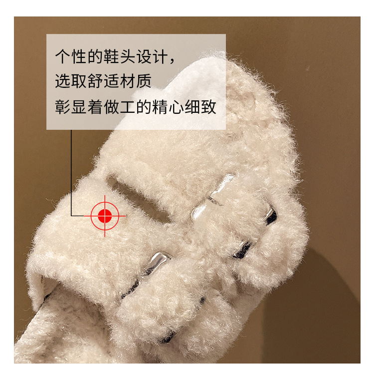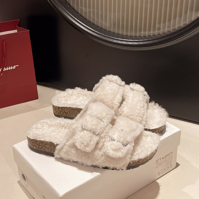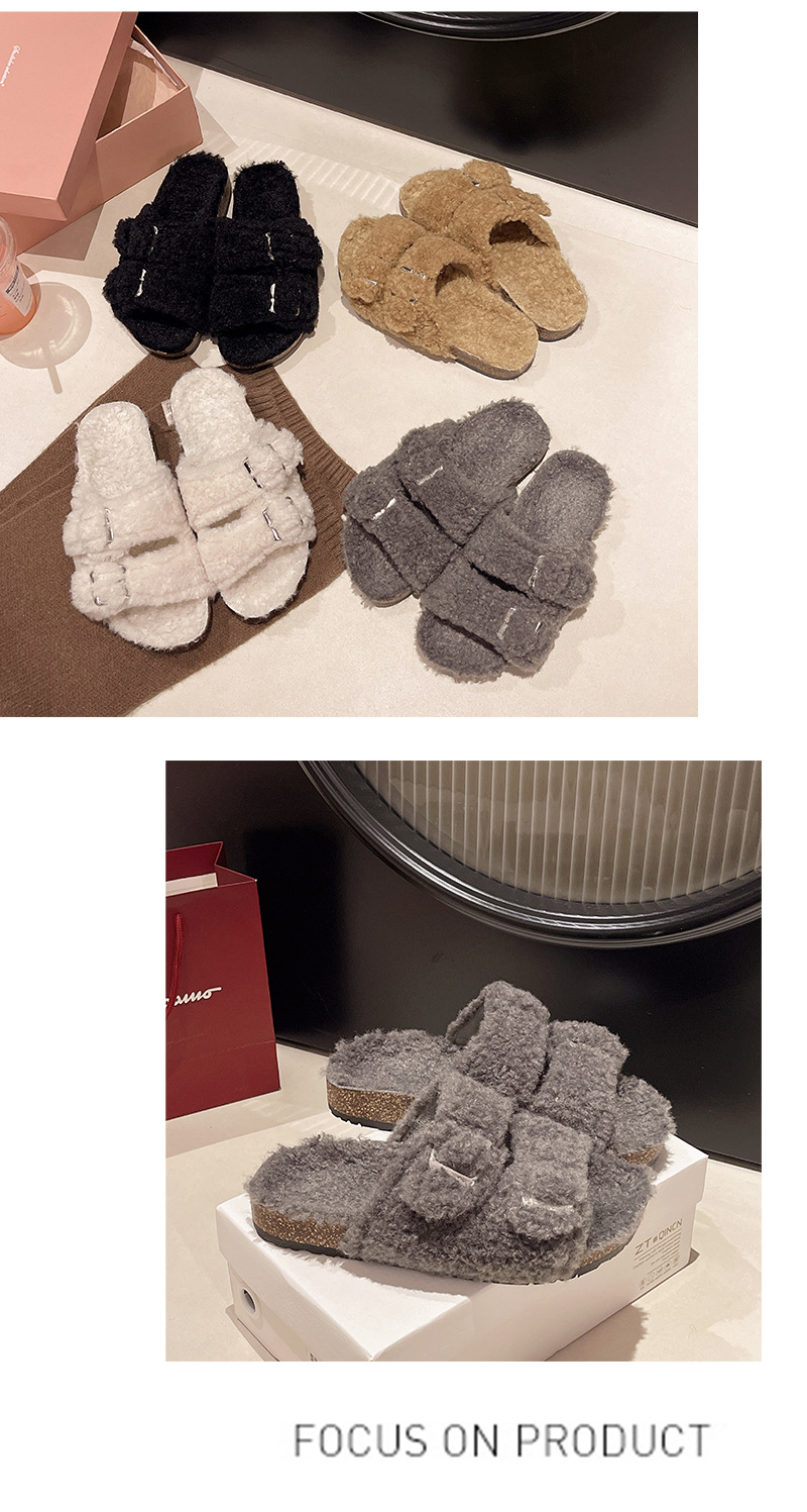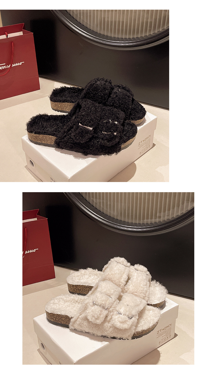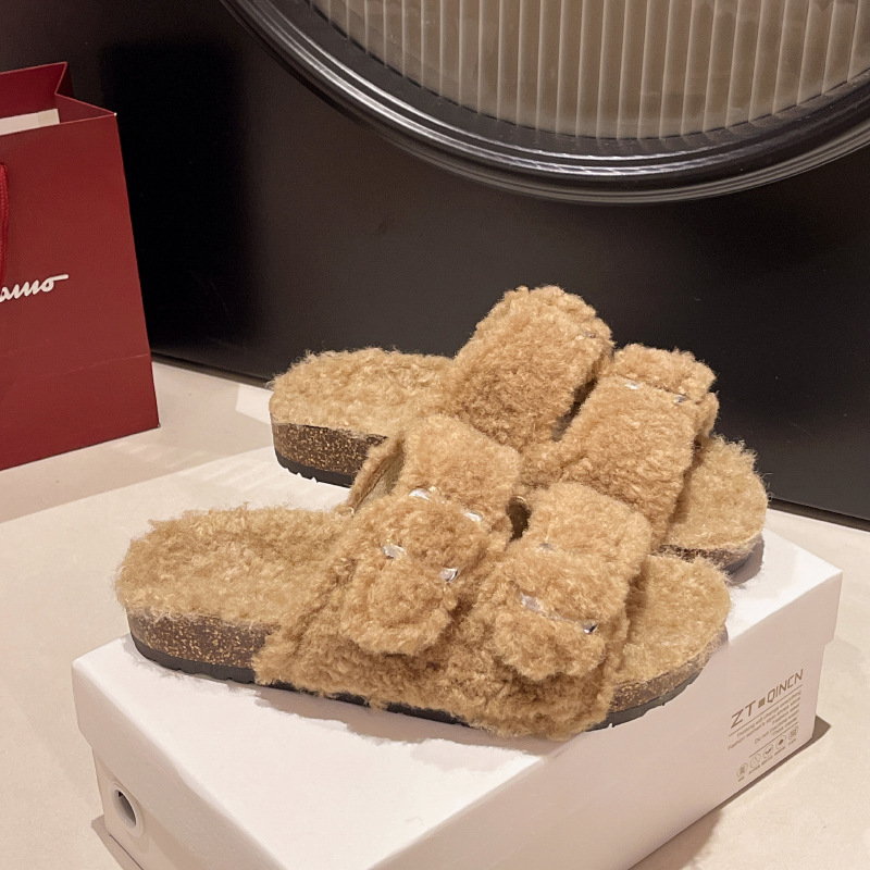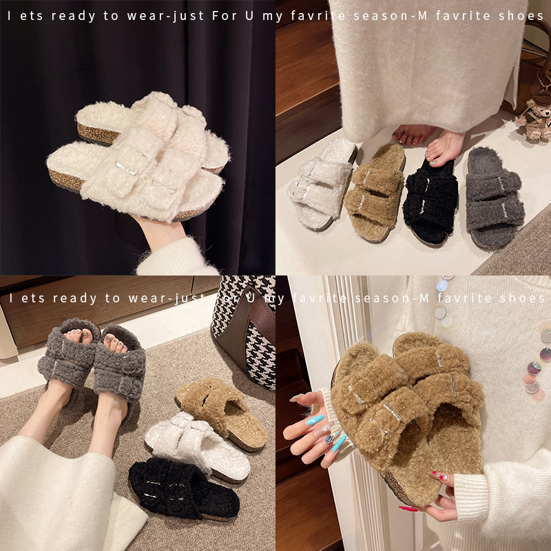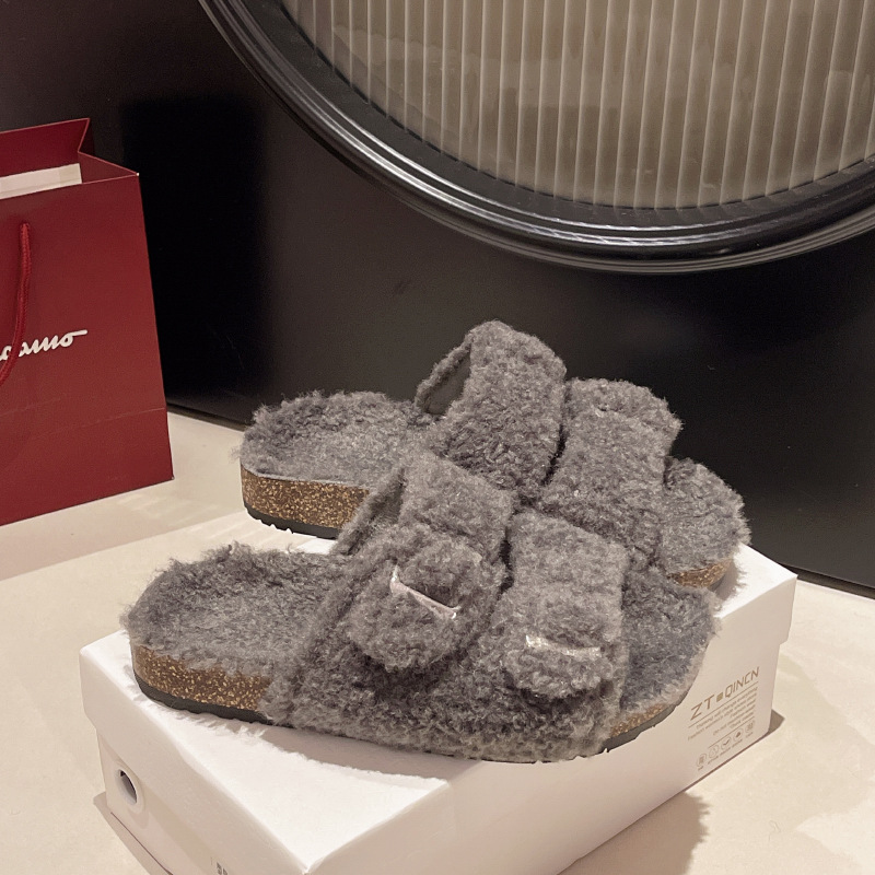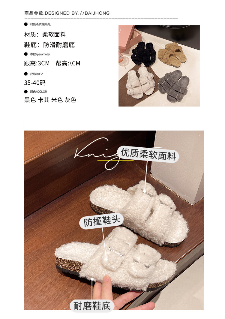 2025秋冬新款保暖加绒勃肯鞋双扣高级感羊羔绒外穿一字毛毛拖鞋女