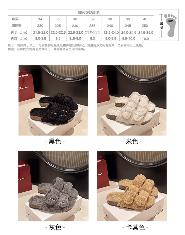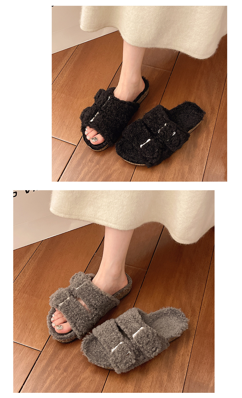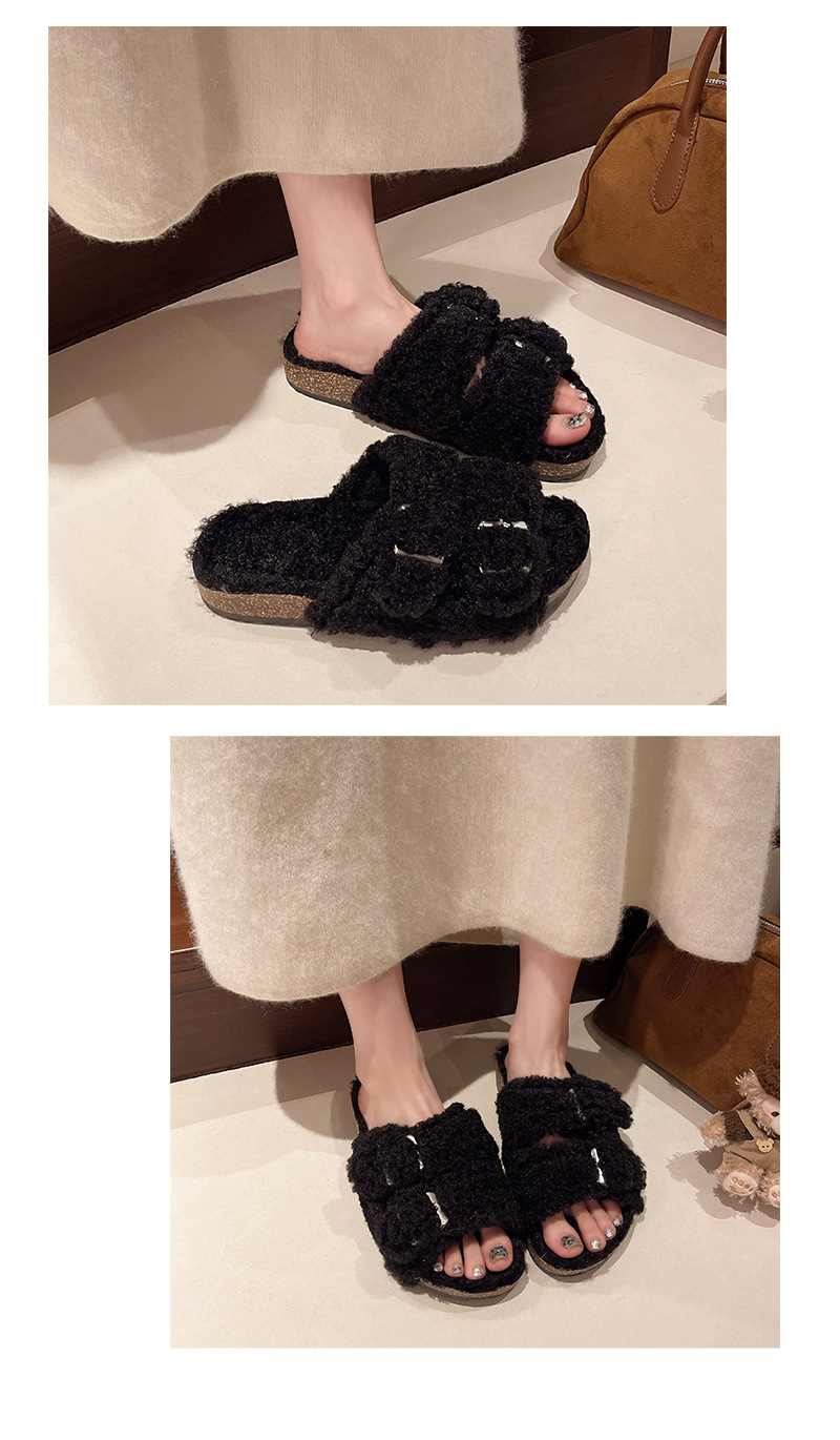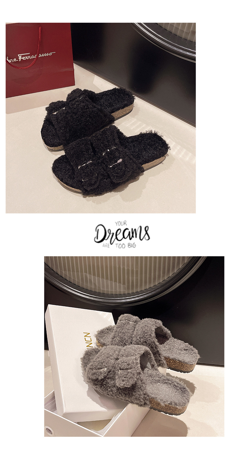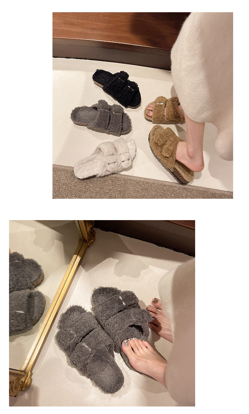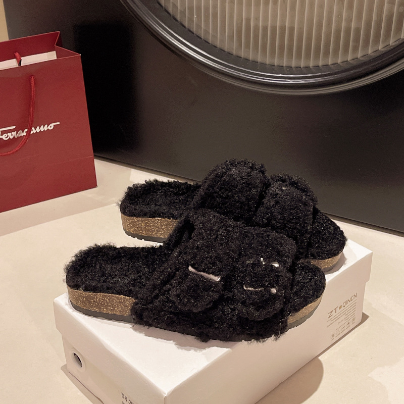 2025秋冬新款保暖加绒勃肯鞋双扣高级感羊羔绒外穿一字毛毛拖鞋女