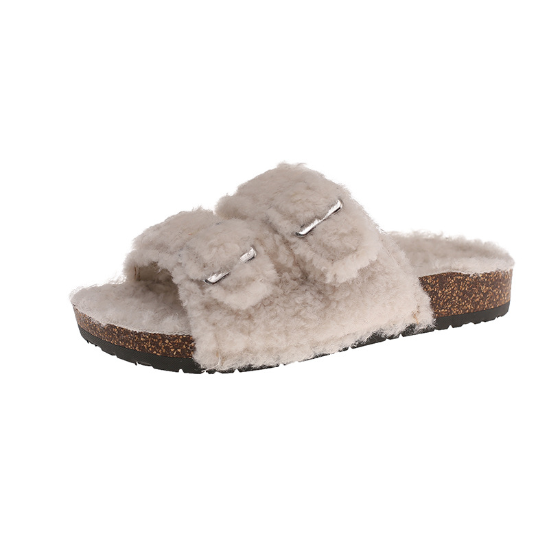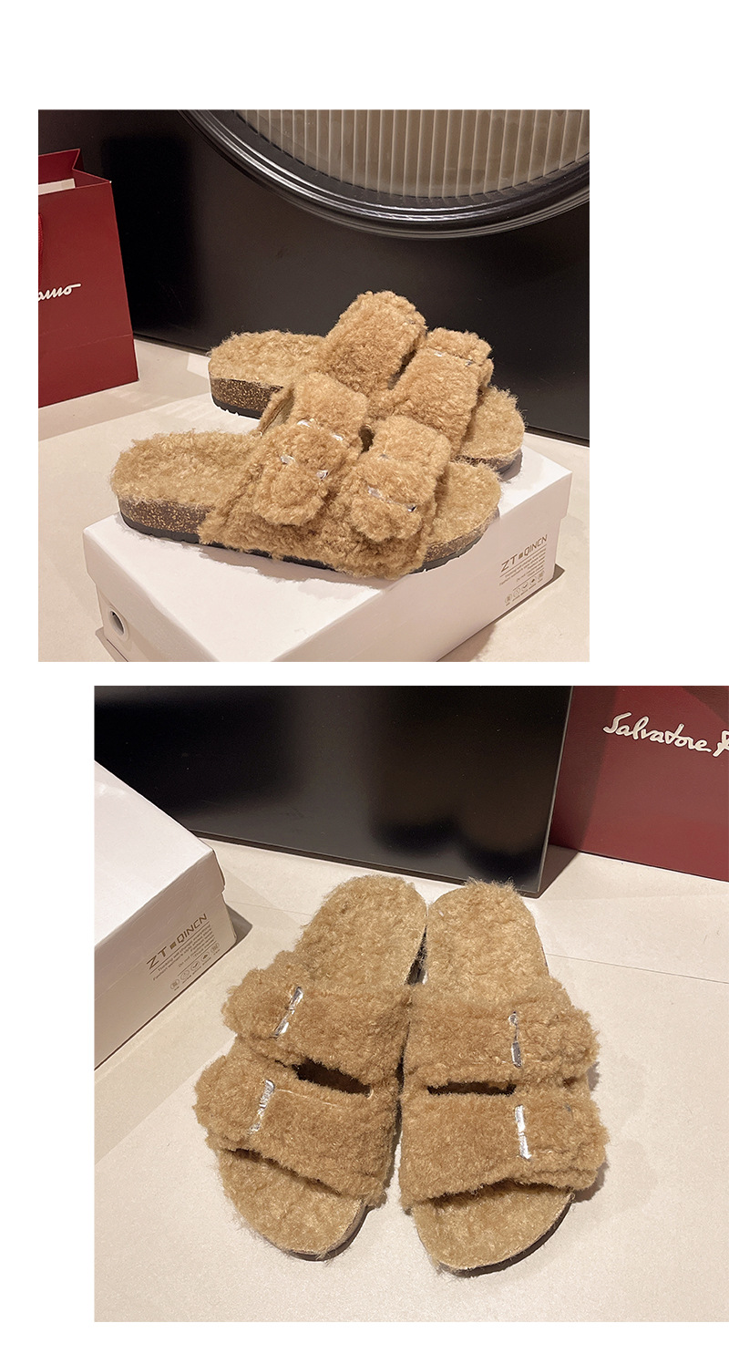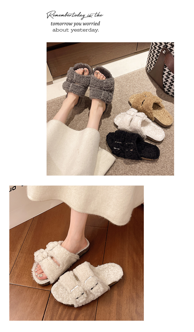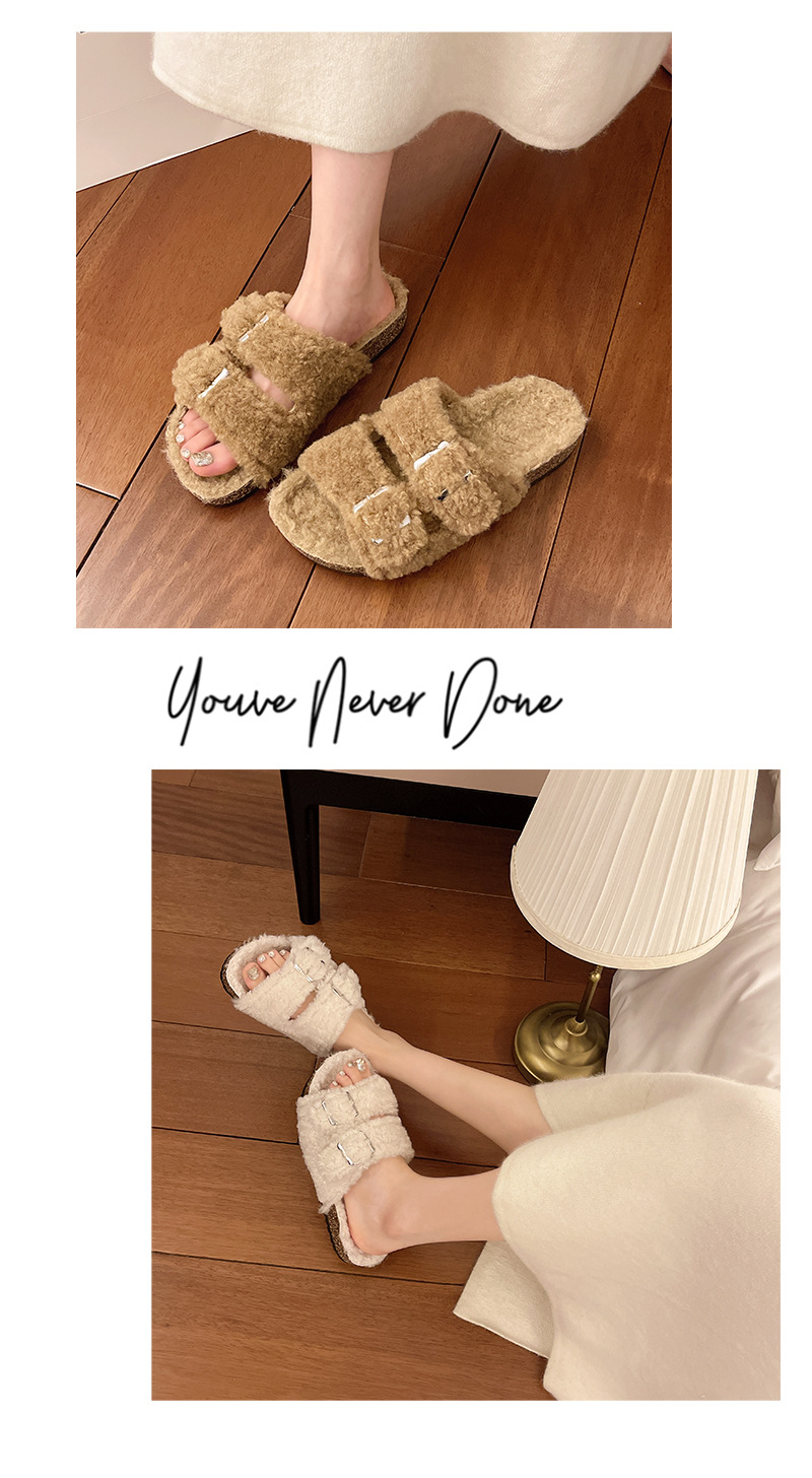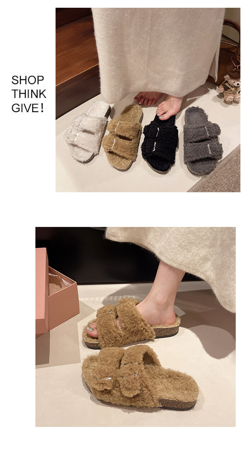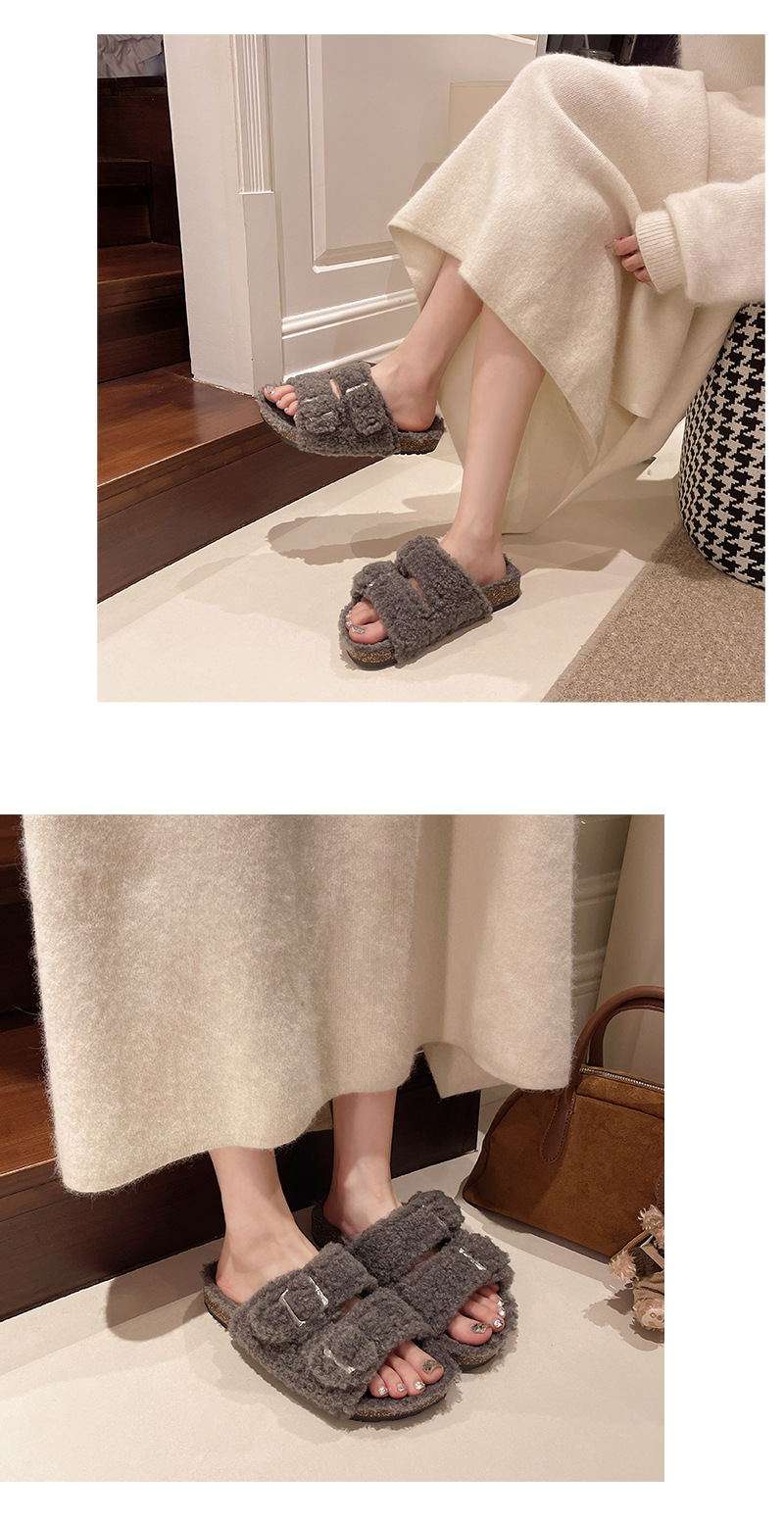 2025秋冬新款保暖加绒勃肯鞋双扣高级感羊羔绒外穿一字毛毛拖鞋女