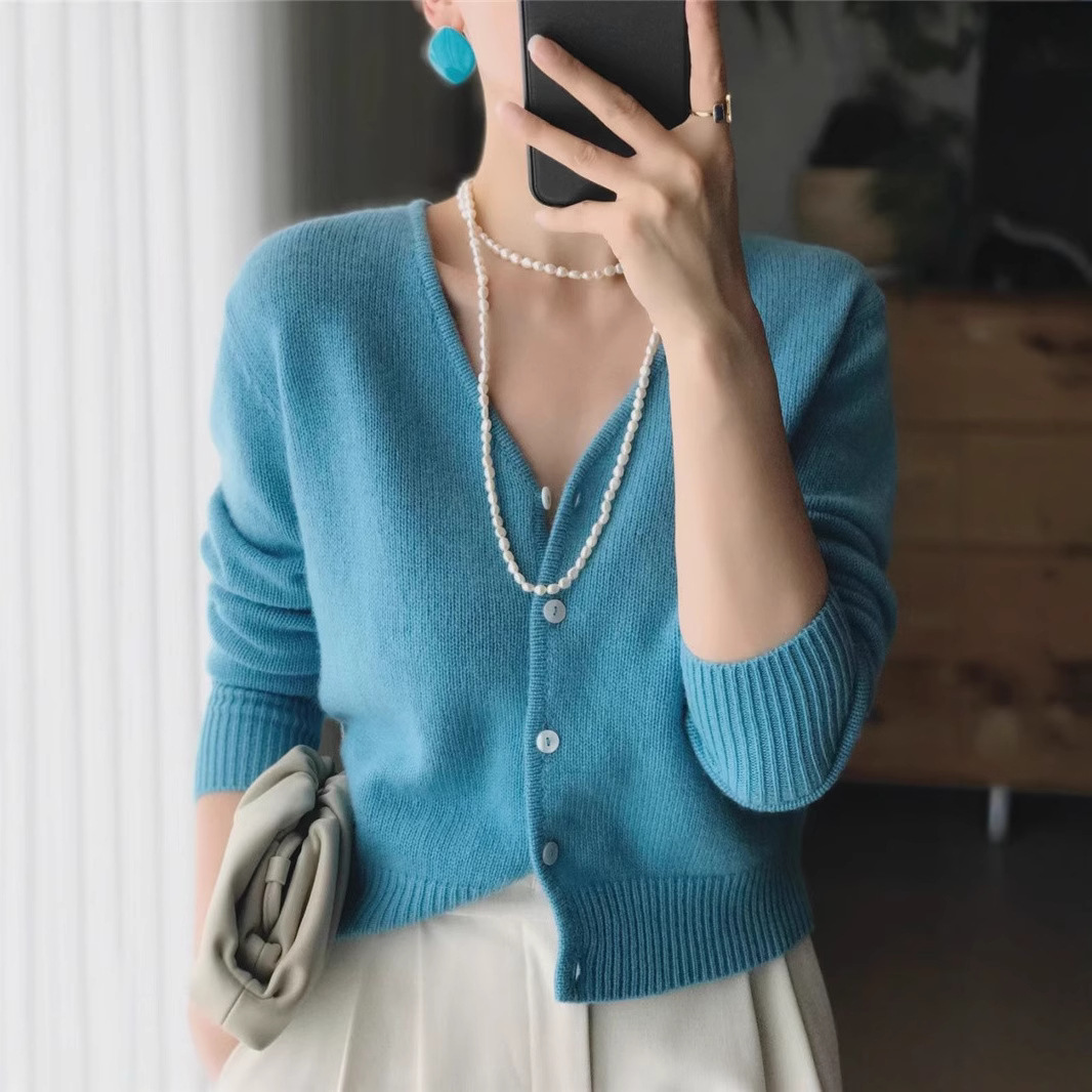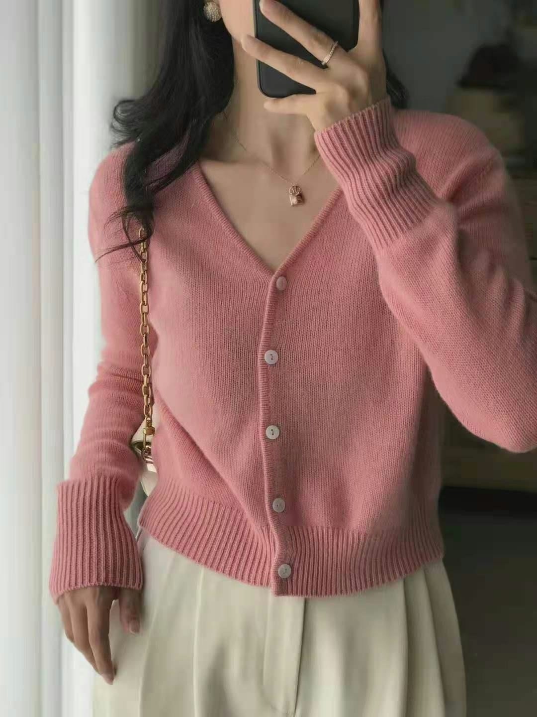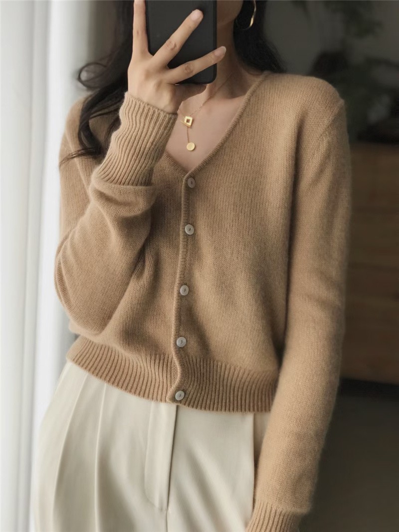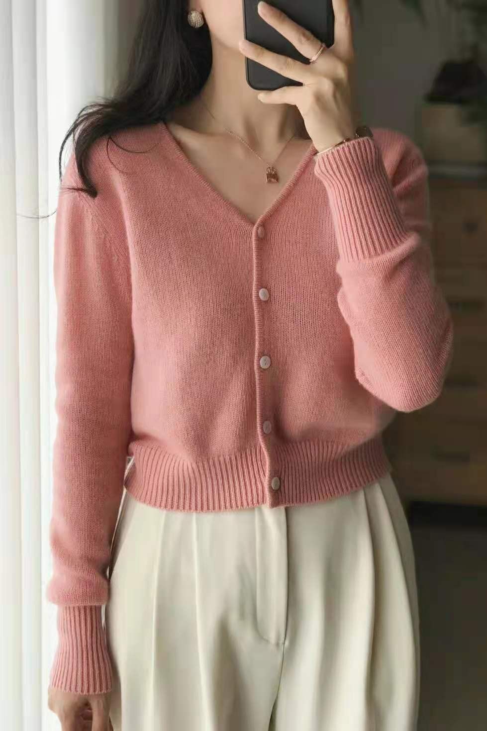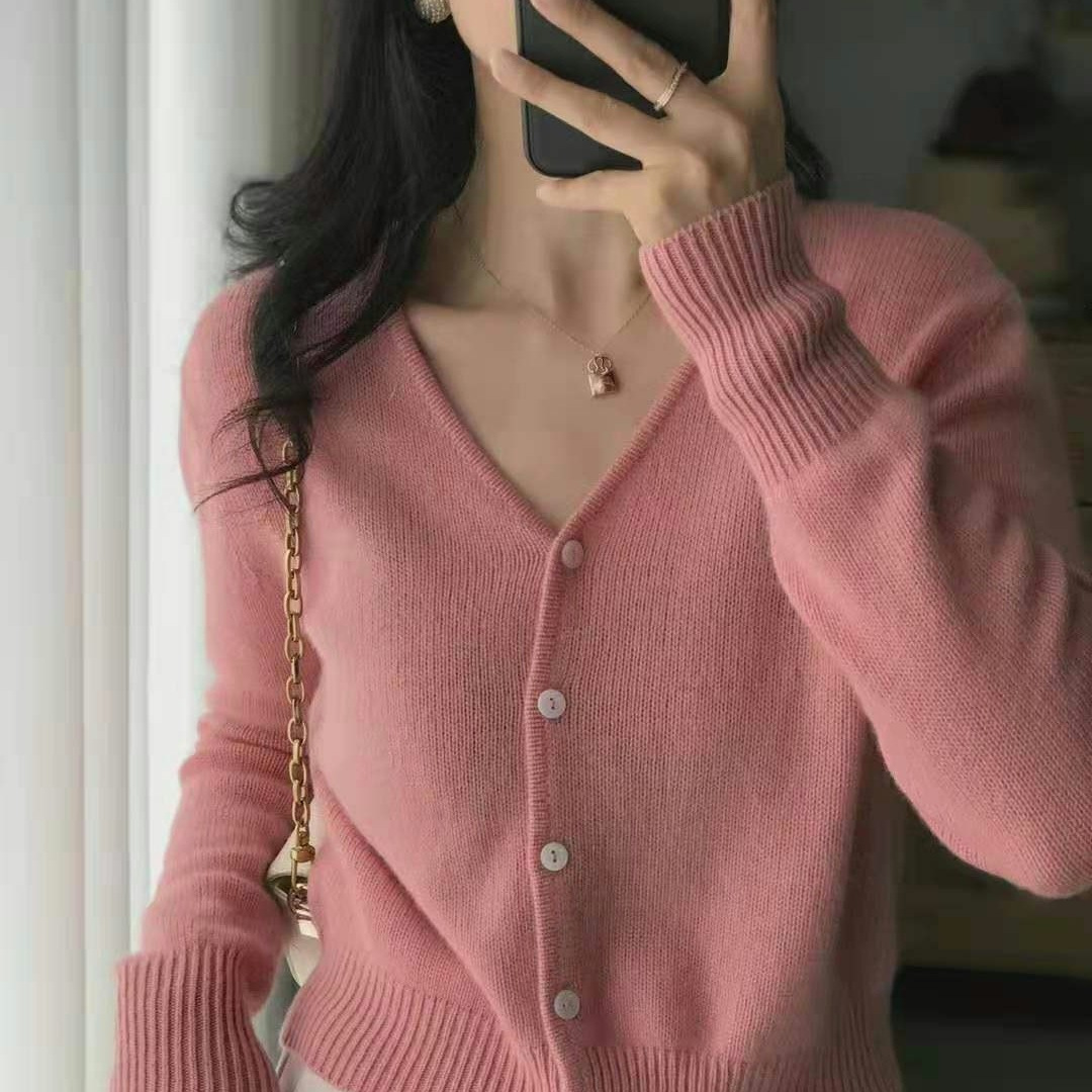 V领短款100羊毛针织开衫秋冬款韩版气质羊绒穿搭外穿毛衣女款代发