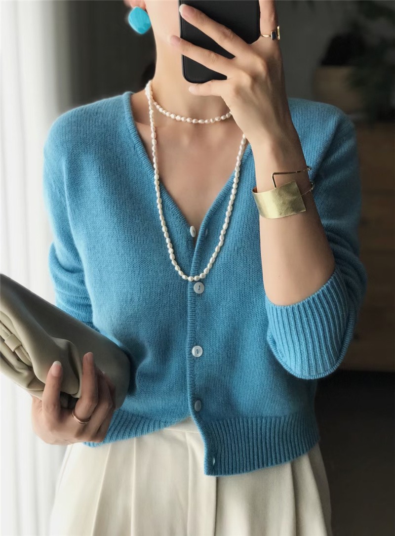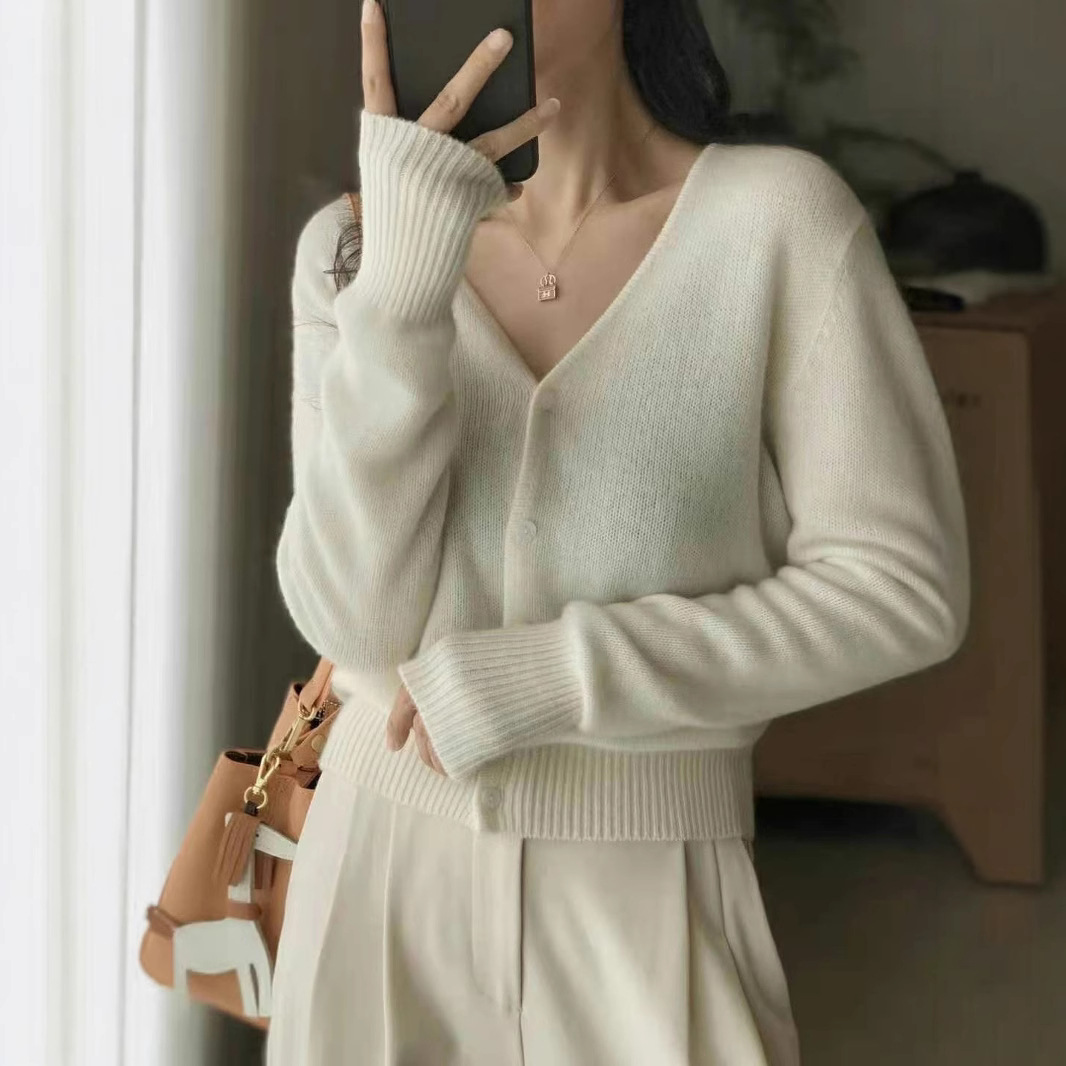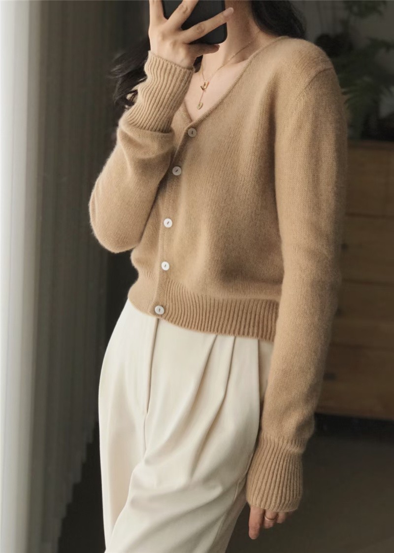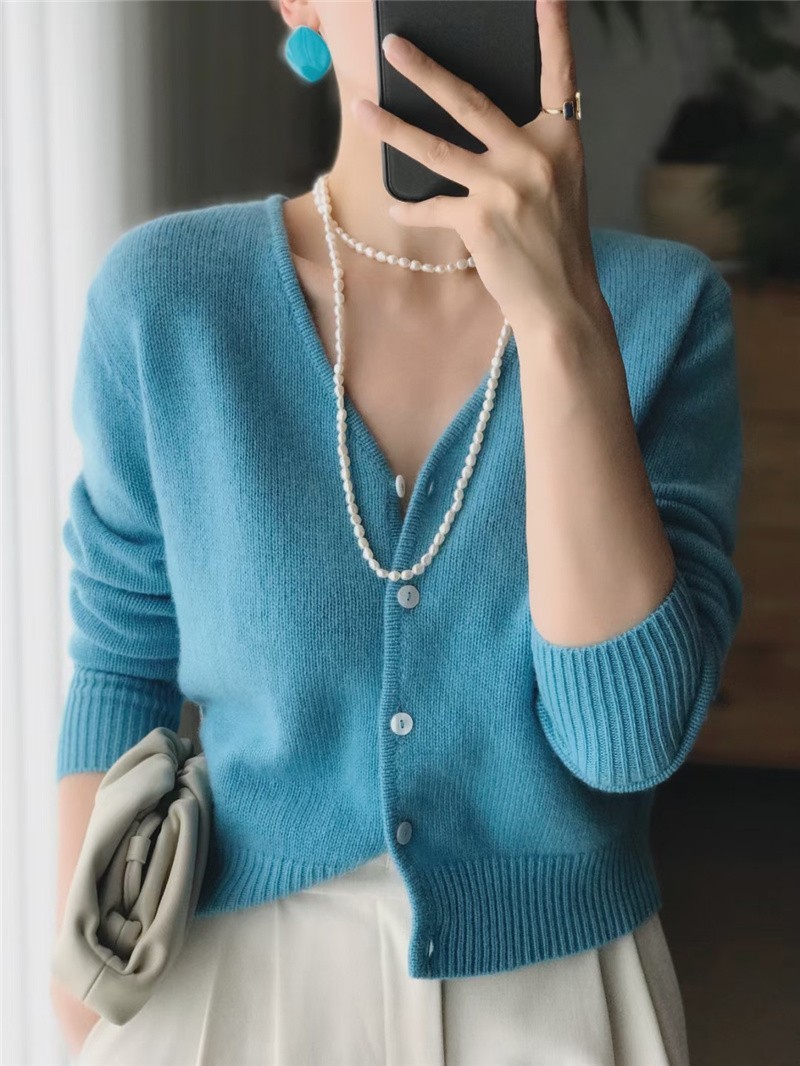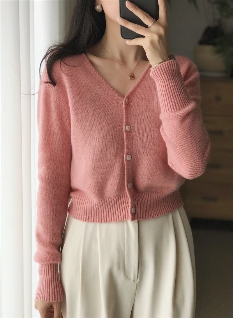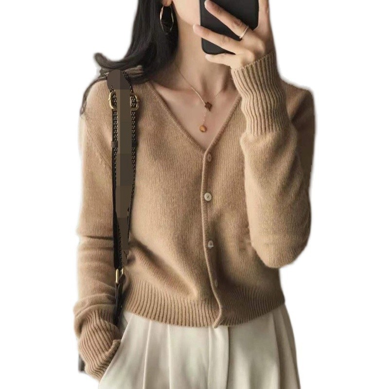 V领短款100羊毛针织开衫秋冬款韩版气质羊绒穿搭外穿毛衣女款代发