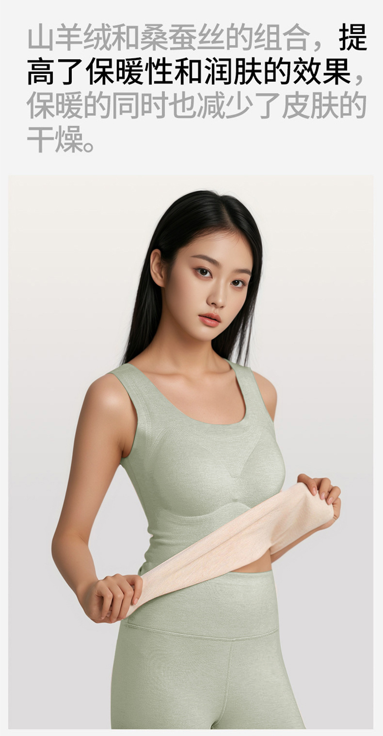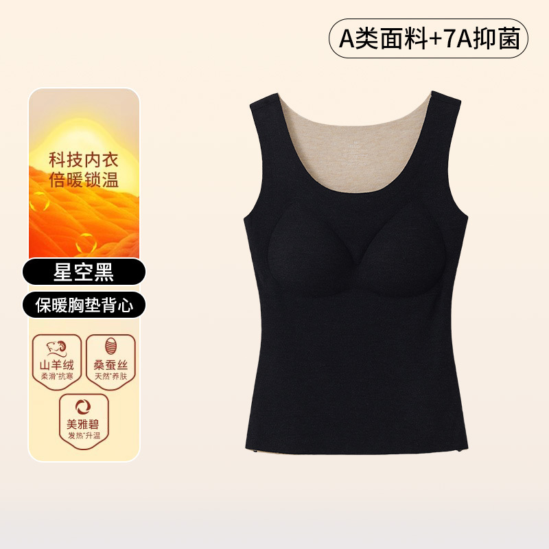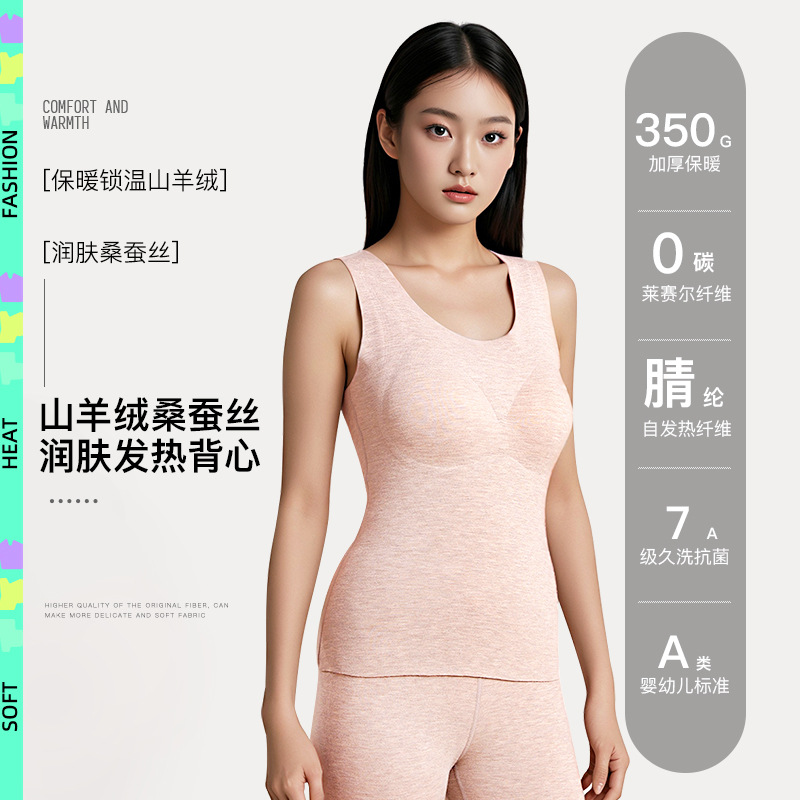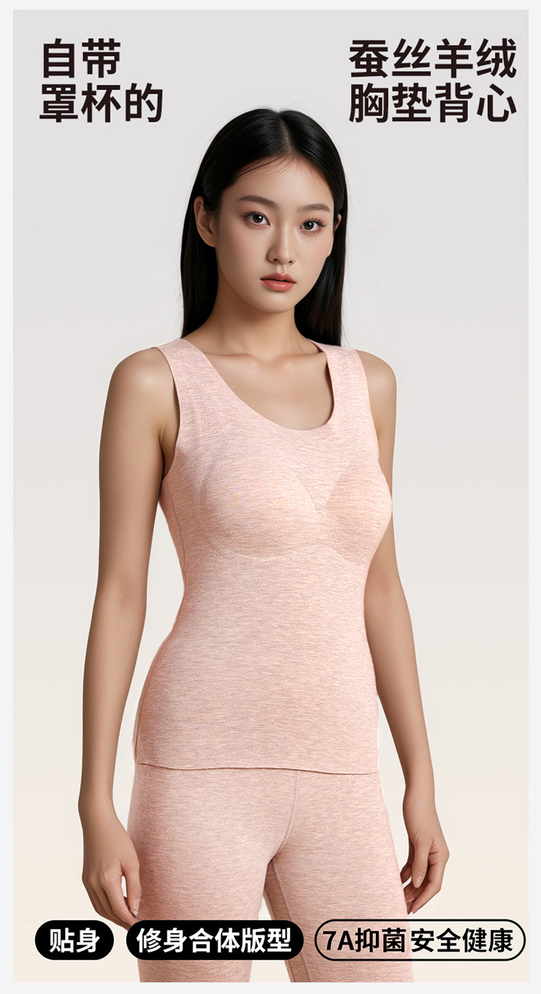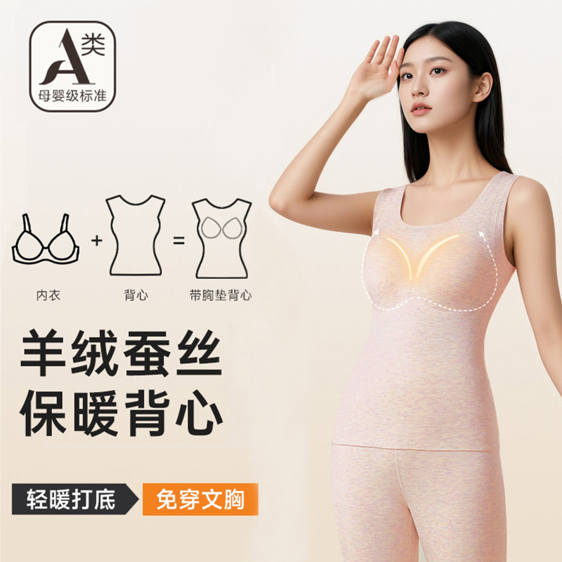 A类蚕丝羊绒德绒保暖背心女7A免文胸一体背心加绒带胸垫内衣