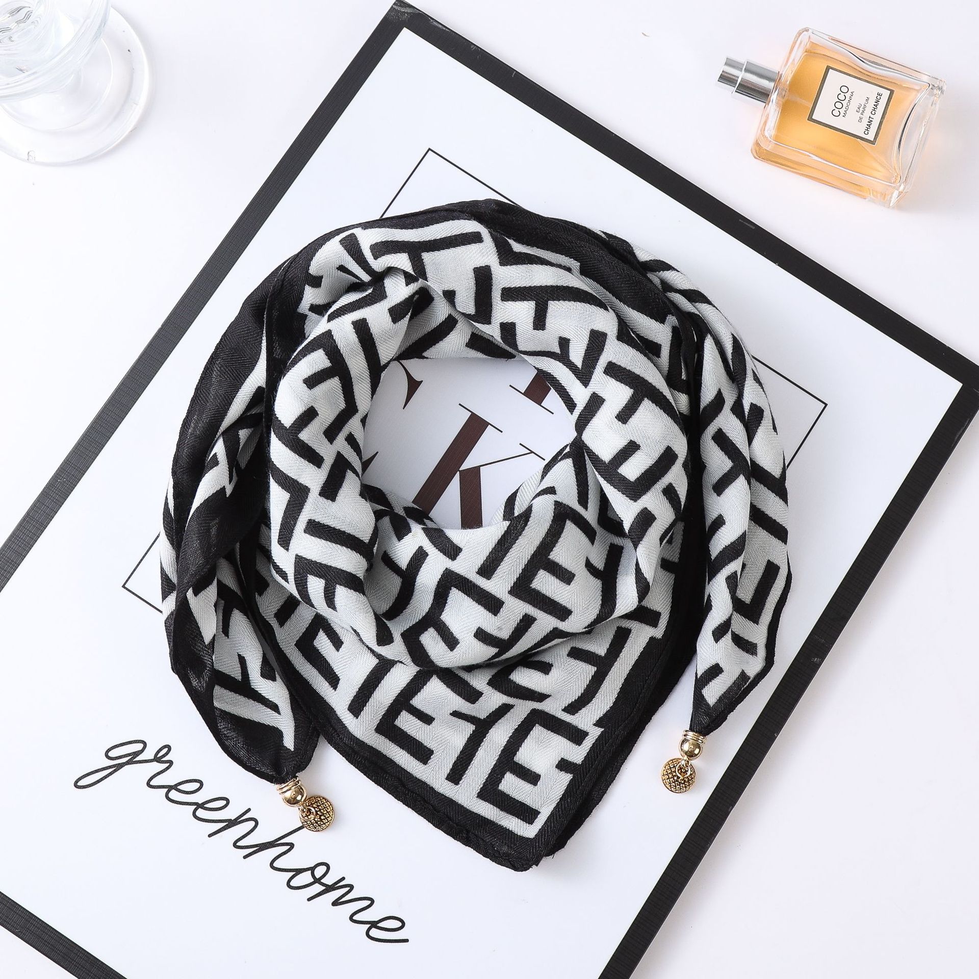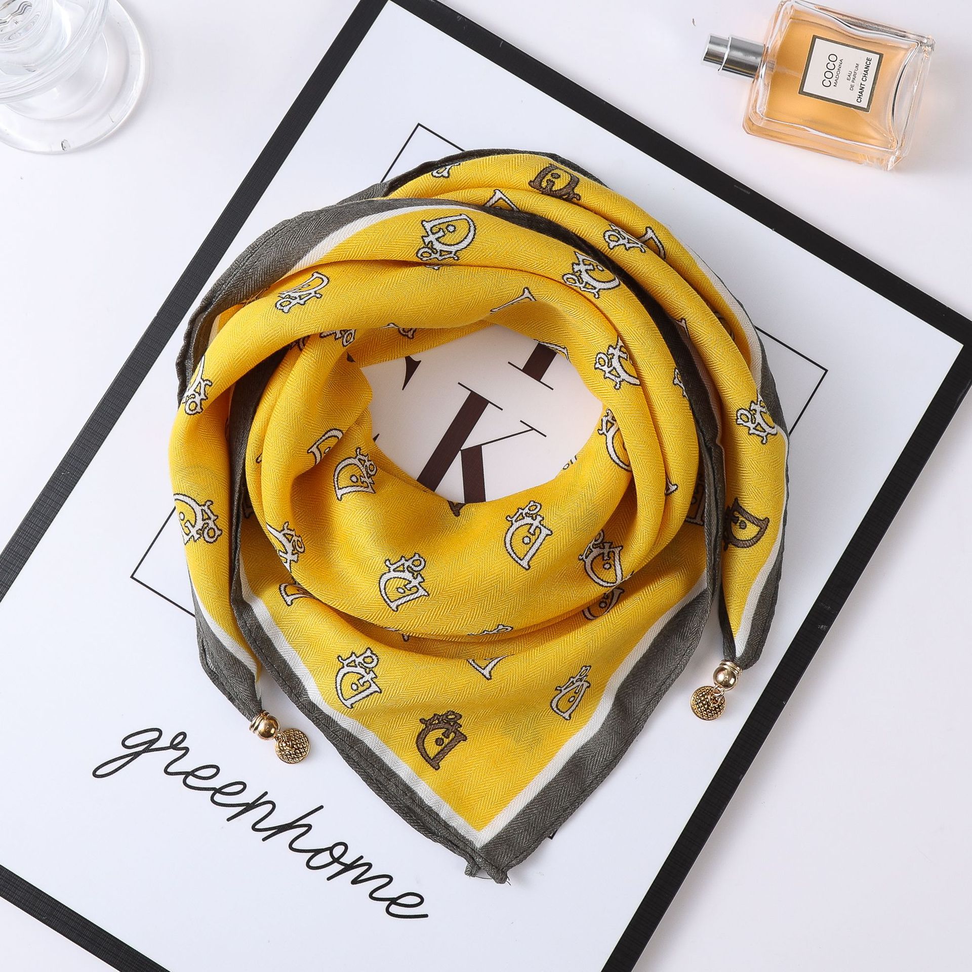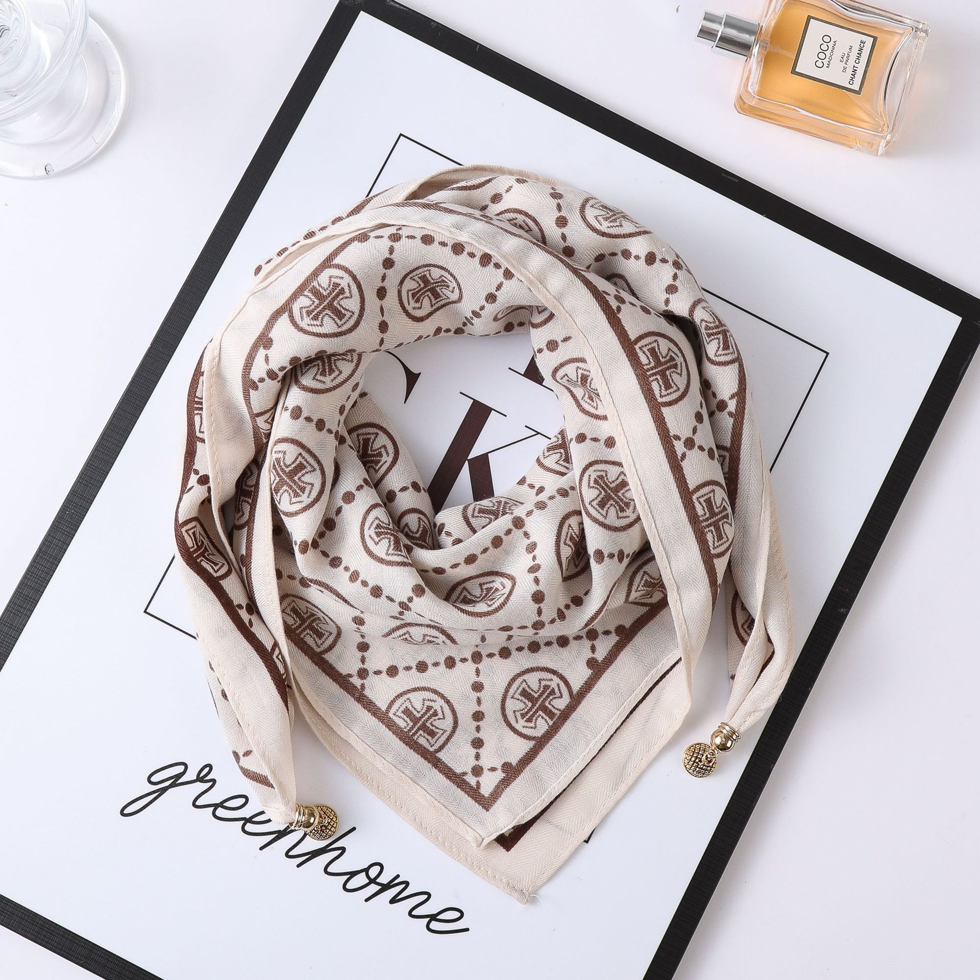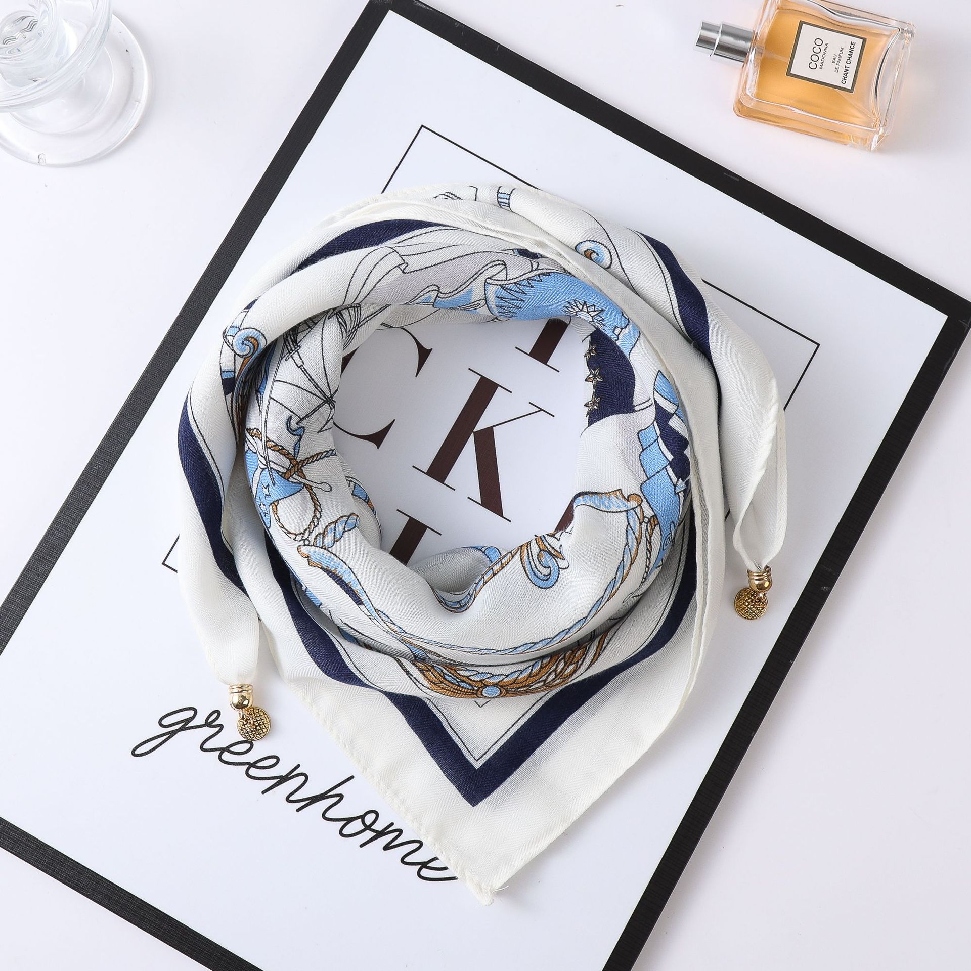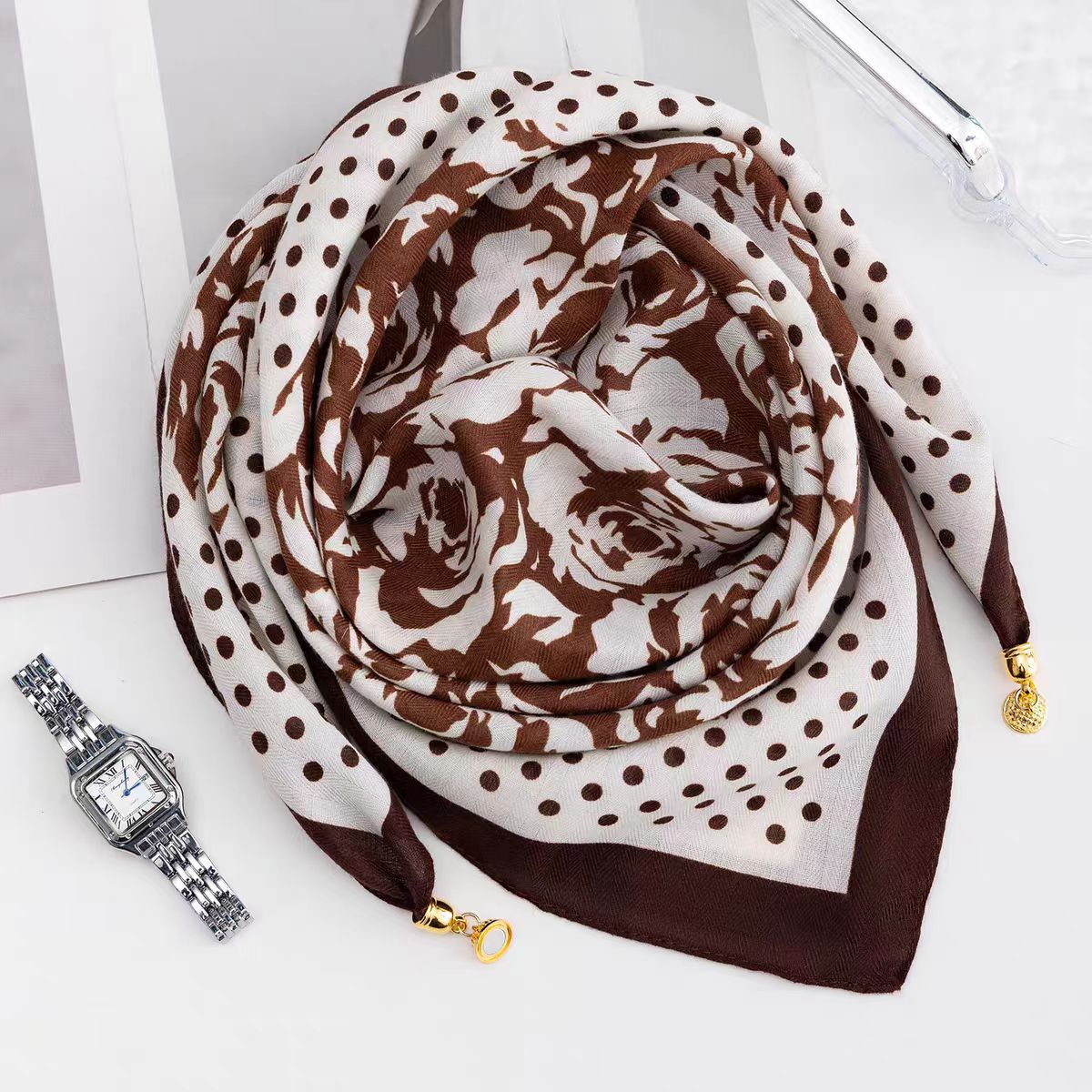 秋冬新款气质百搭护颈保暖围巾洋气领巾丝巾韩版小金球磁扣丝巾普