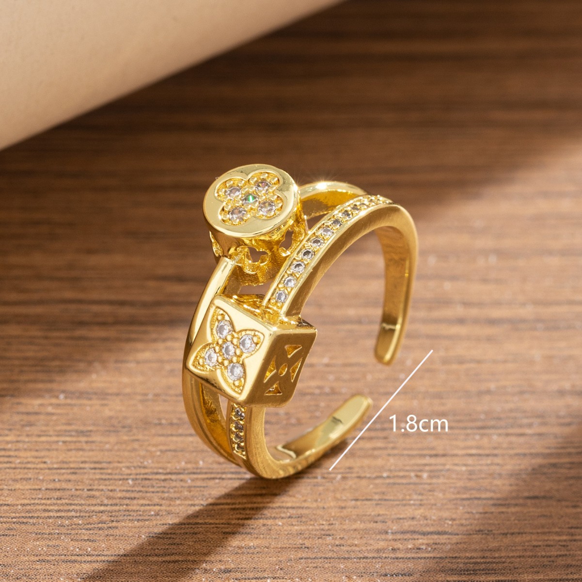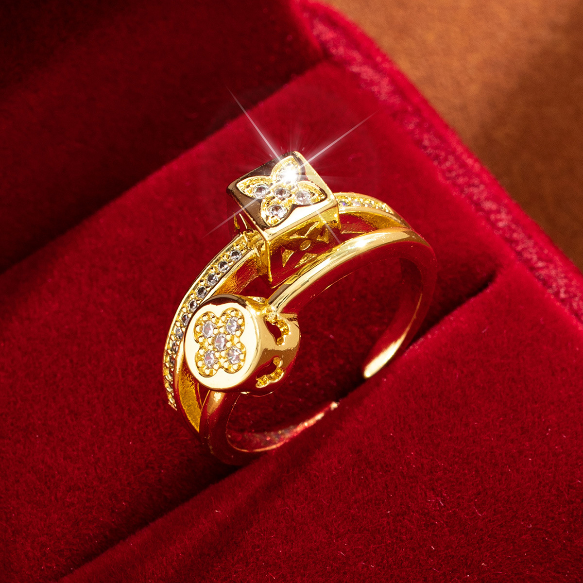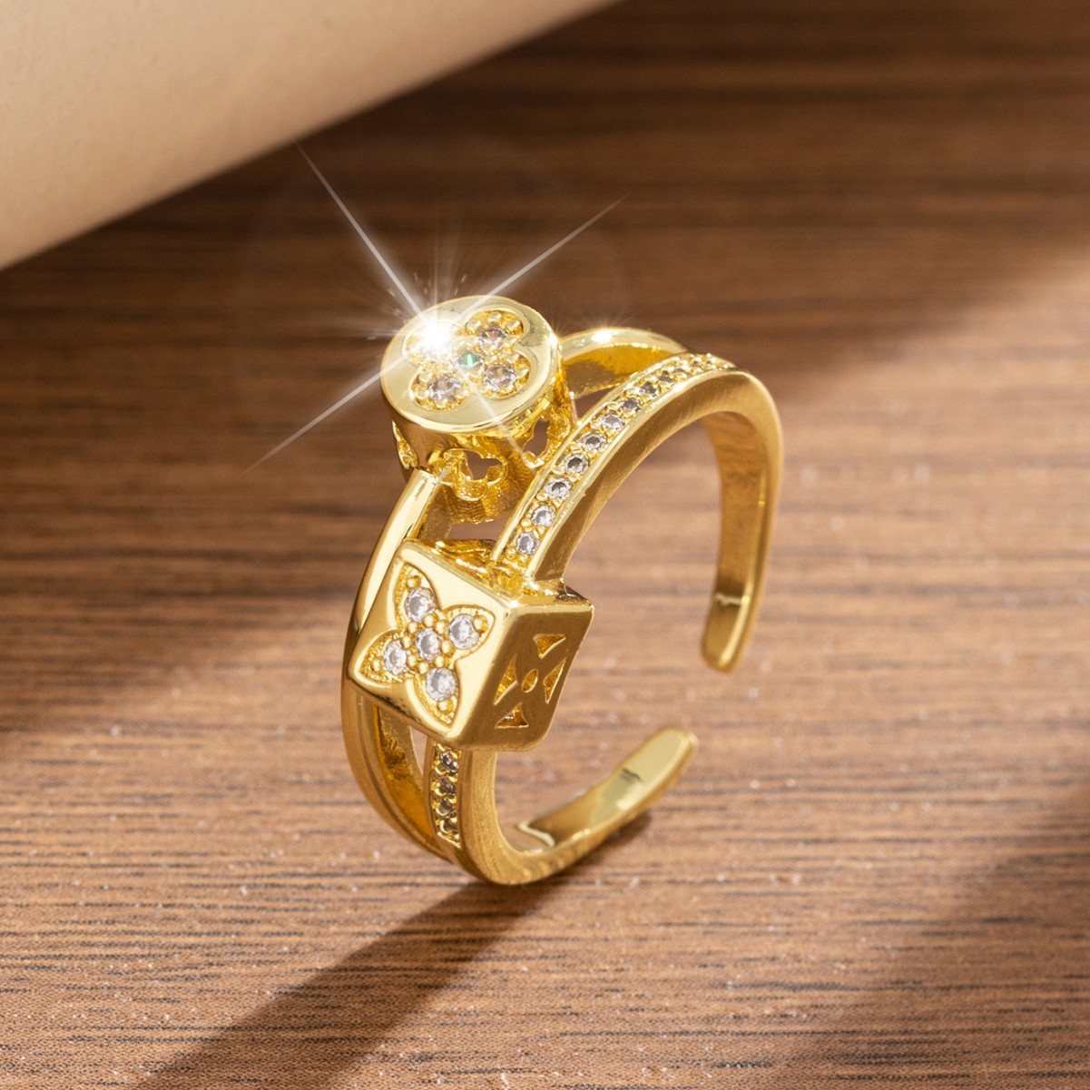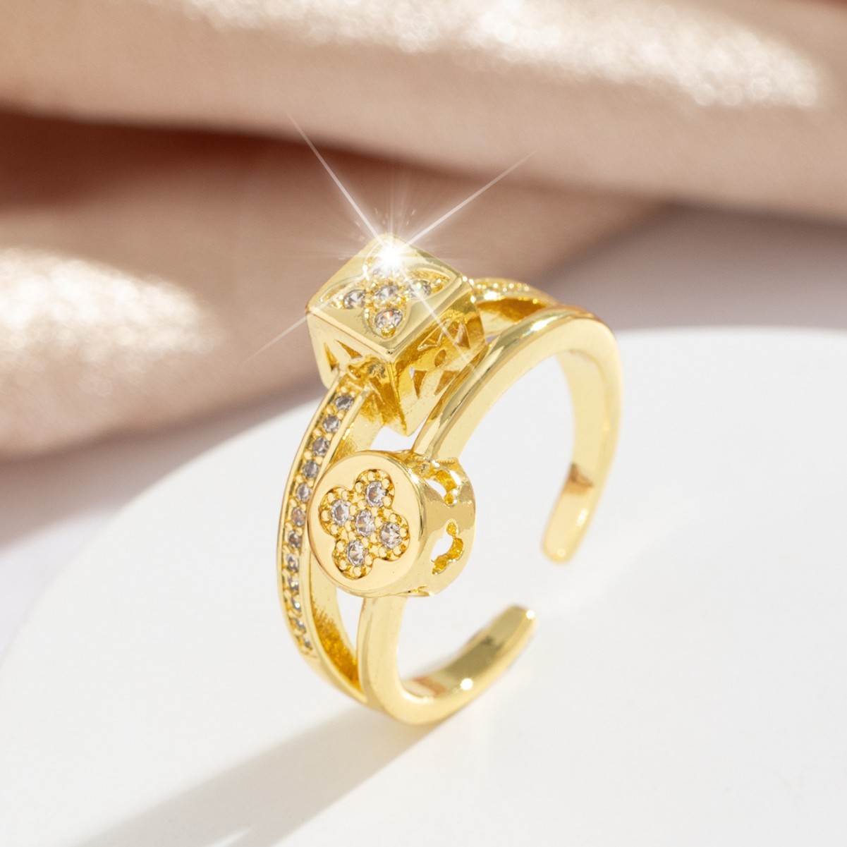 小众设计高级冷淡风铜锆石镀金戒指日韩简约四叶草可调节指环戒子