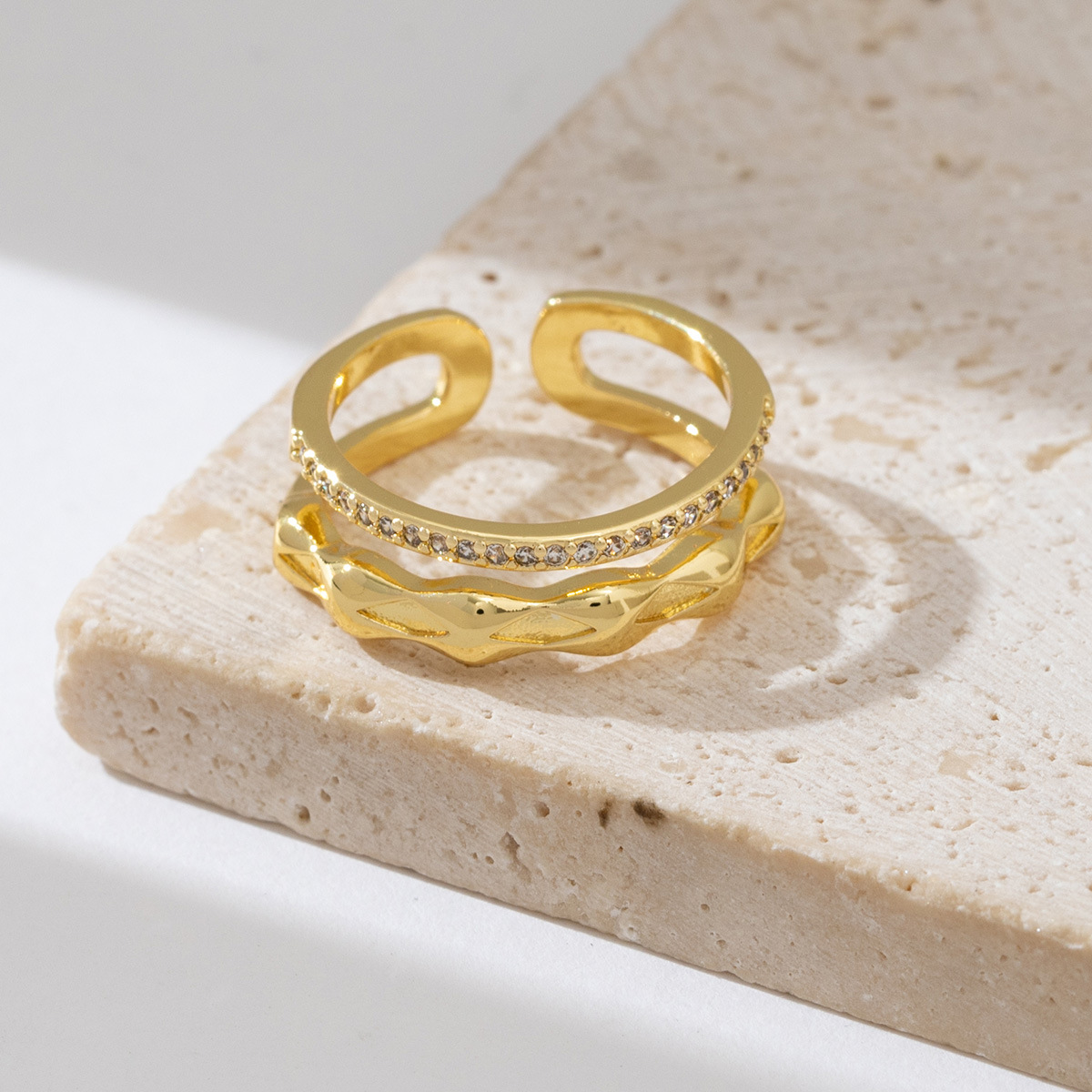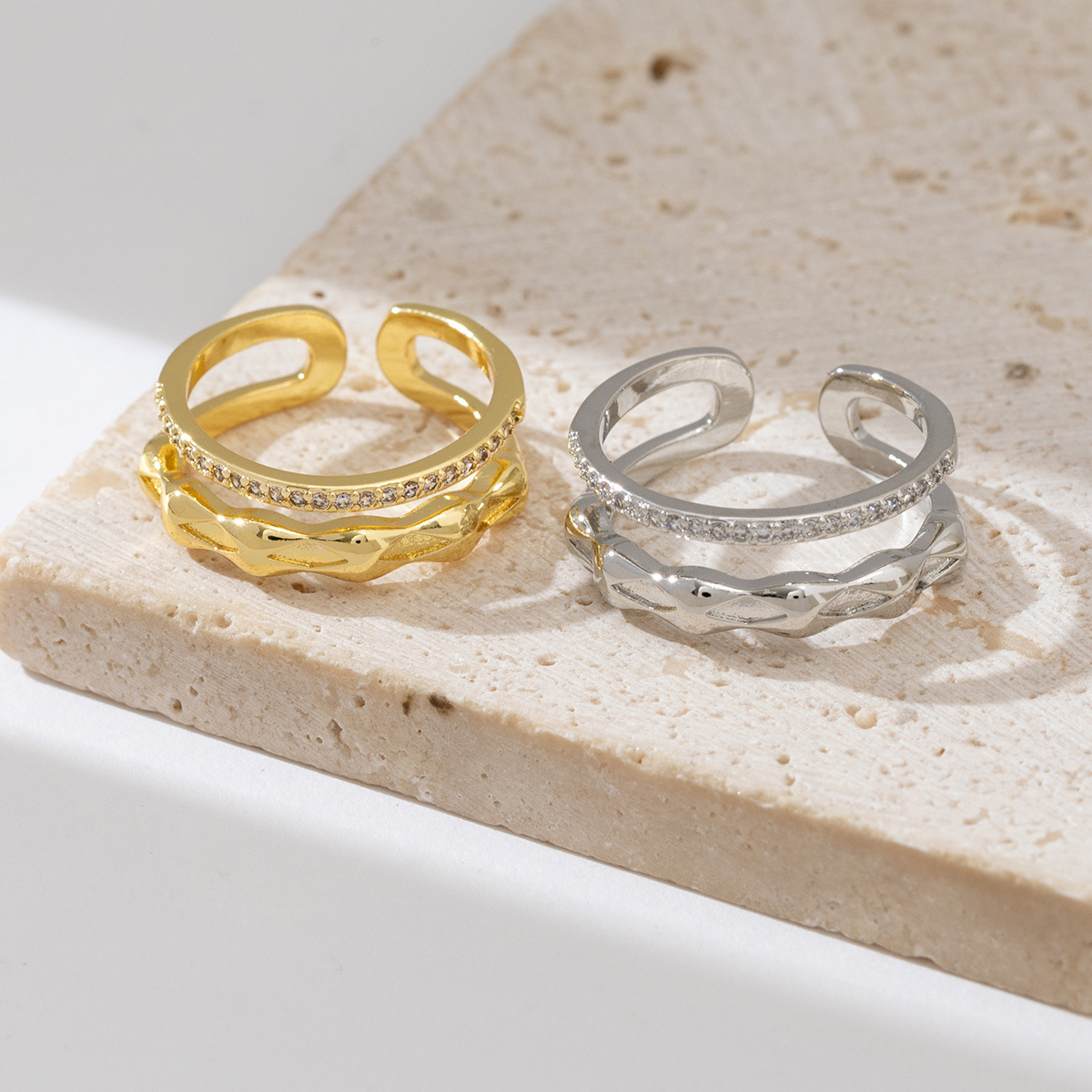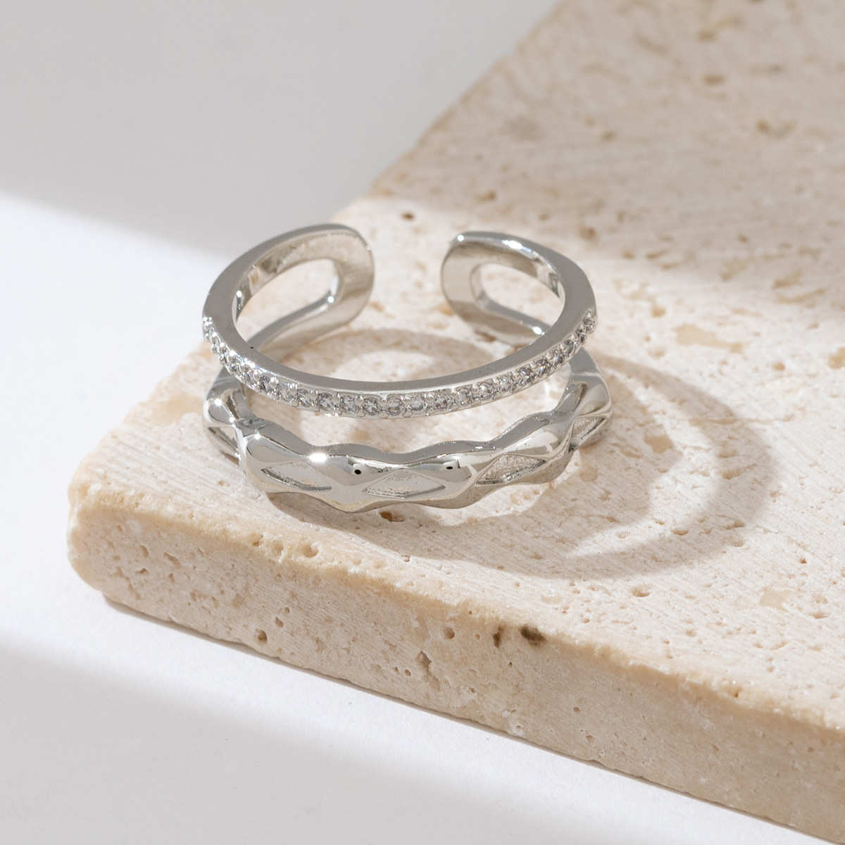 新款叠戴锆石双圈戒指女小众设计感冷淡风几何锁链绳结缠绕食指戒