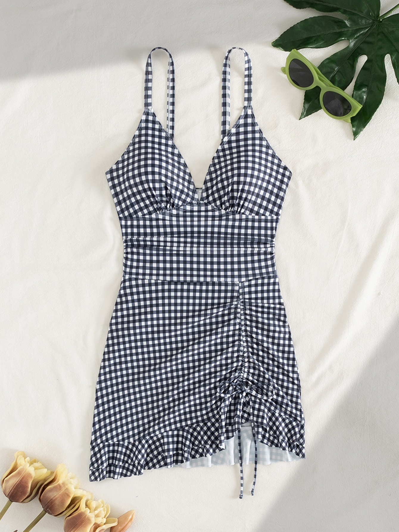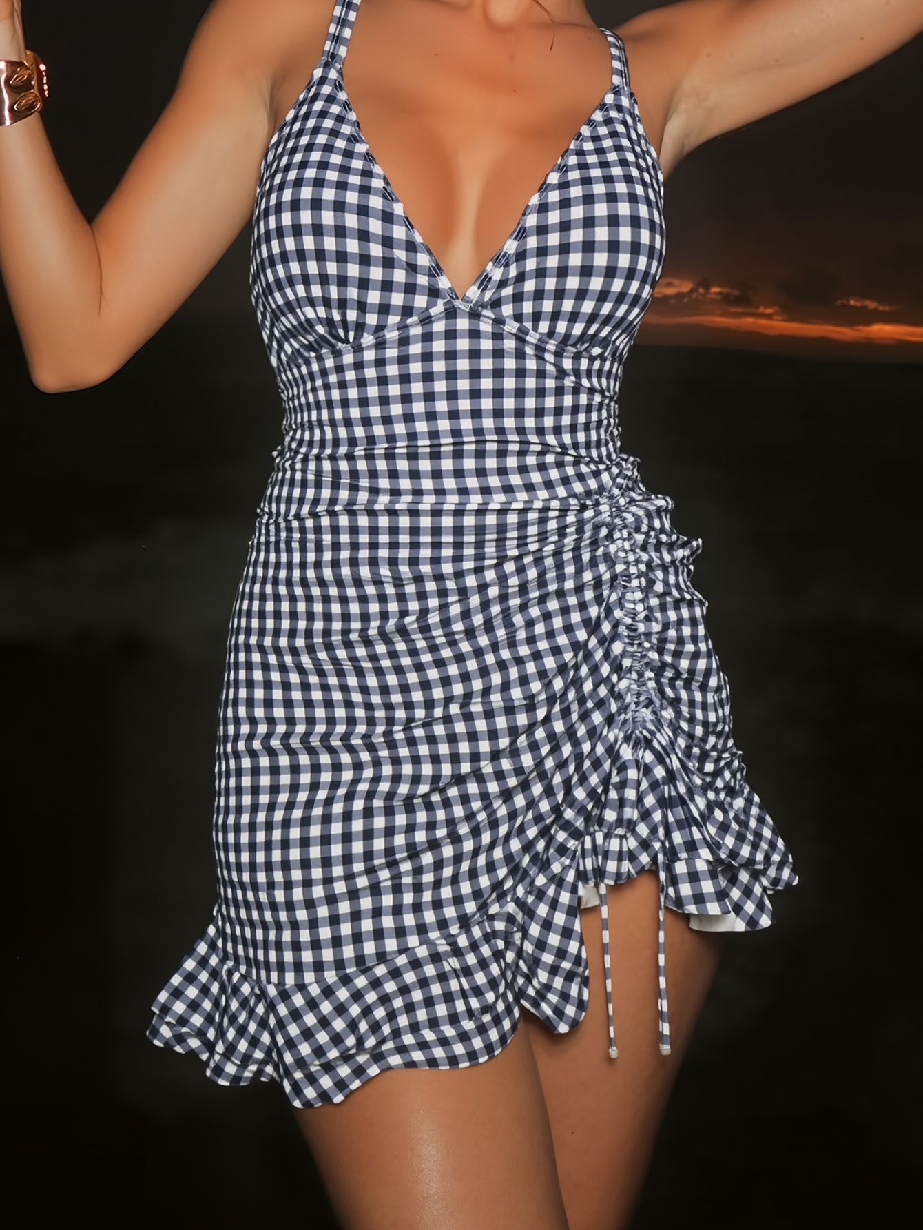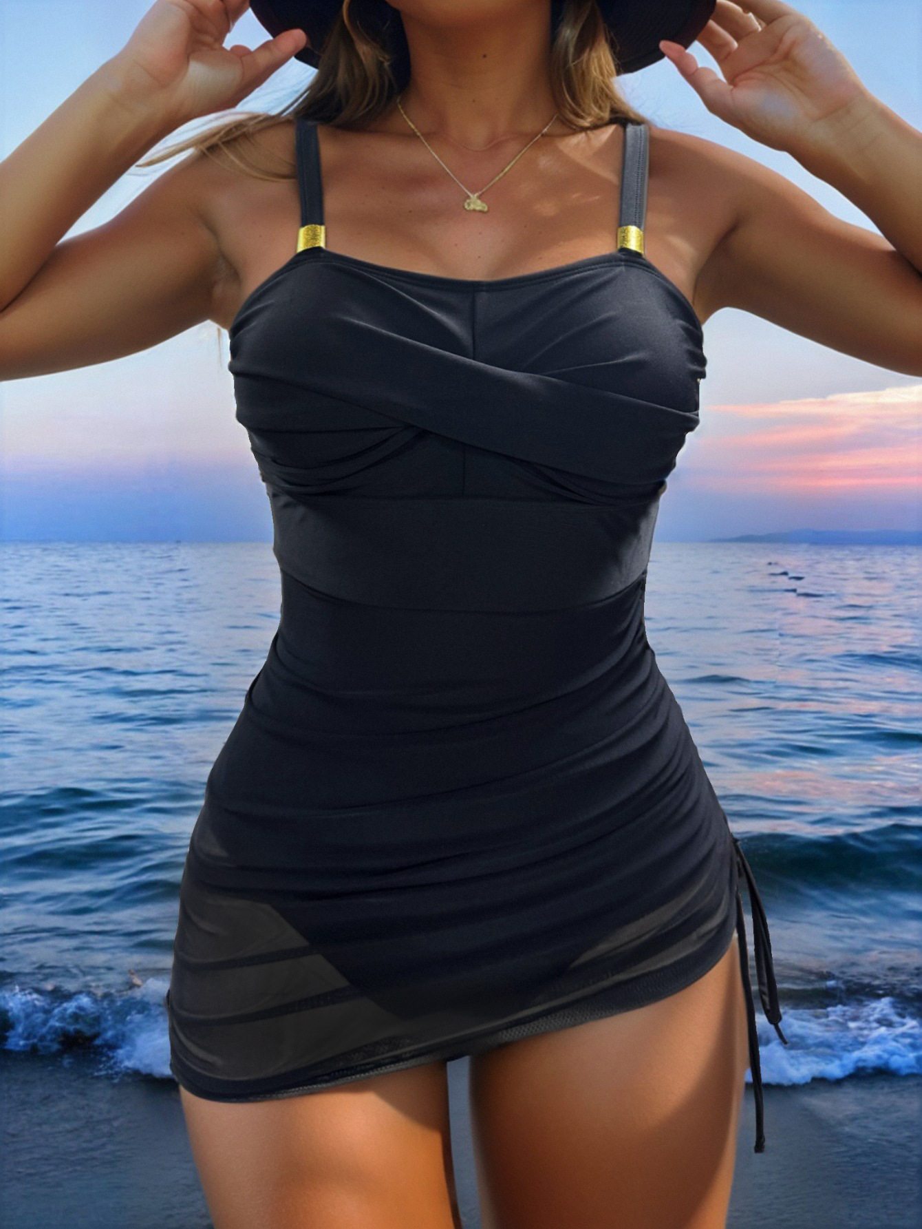 性感吊带深V泳衣网纱拼接侧边抽绳女可拆卸杯垫修身网纱连体泳衣