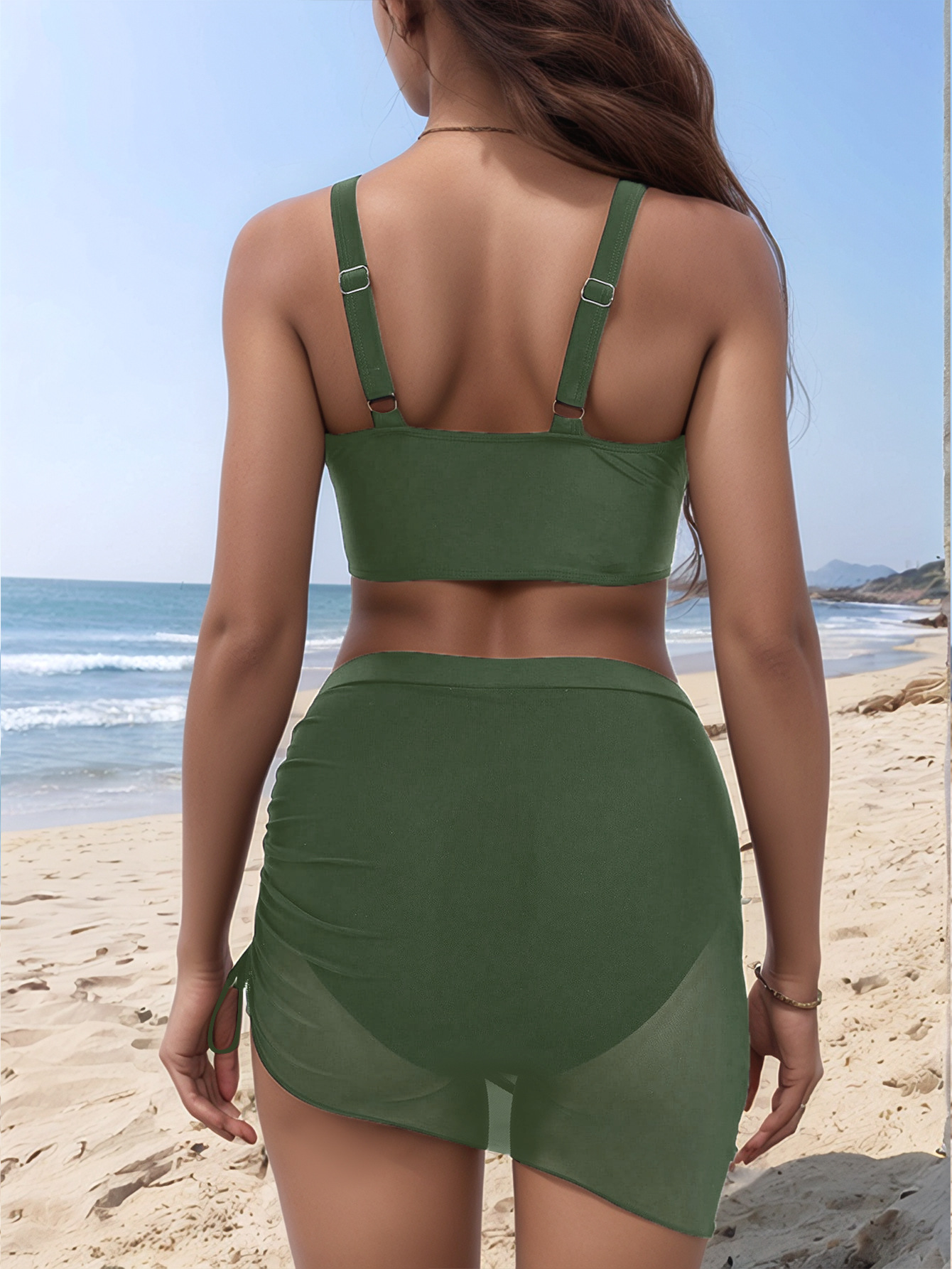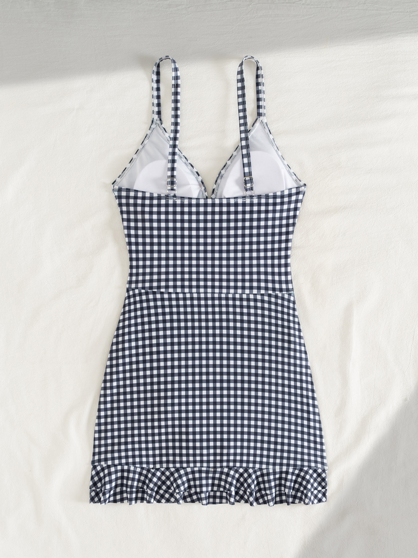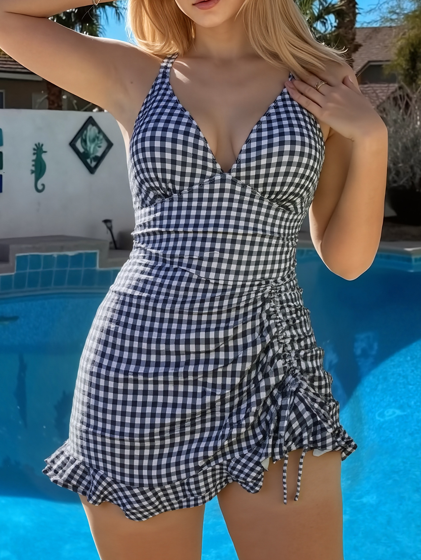 性感吊带深V泳衣网纱拼接侧边抽绳女可拆卸杯垫修身网纱连体泳衣