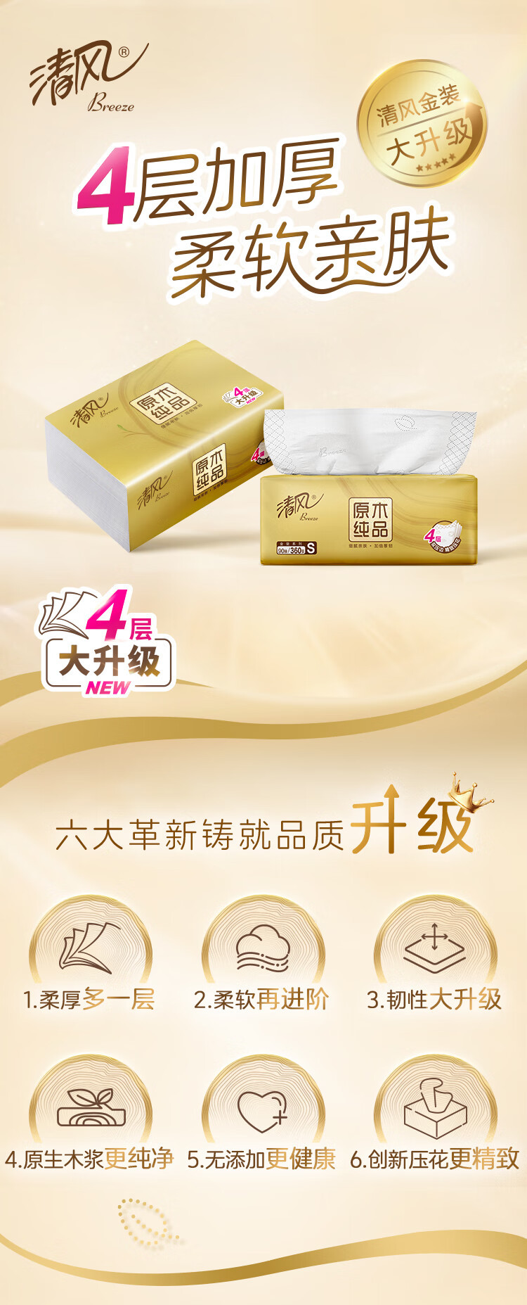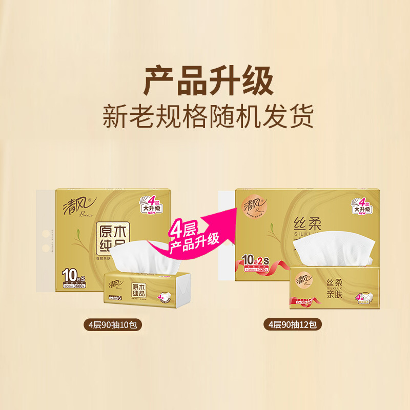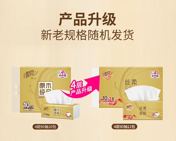 清风抽纸卫生纸家用纸巾批发餐巾纸原木纯品丝柔亲肤4层90抽12包