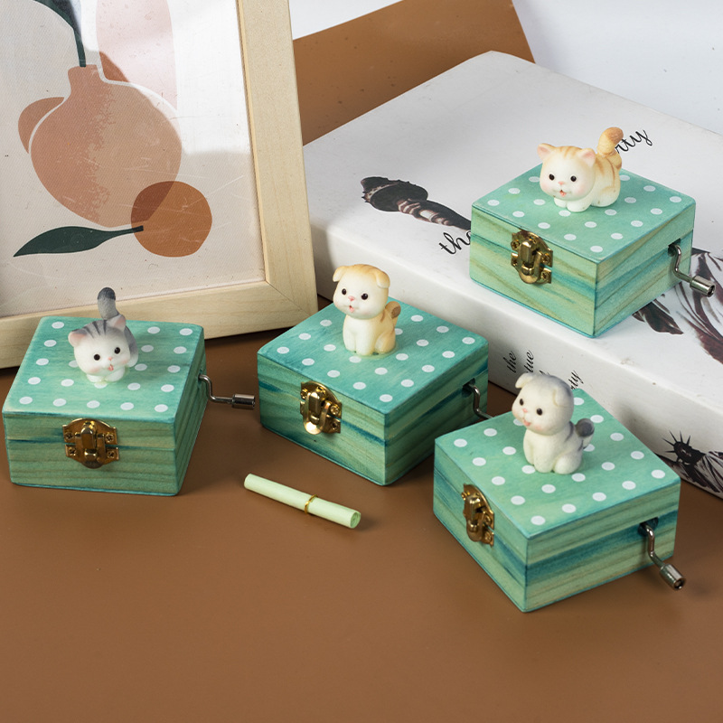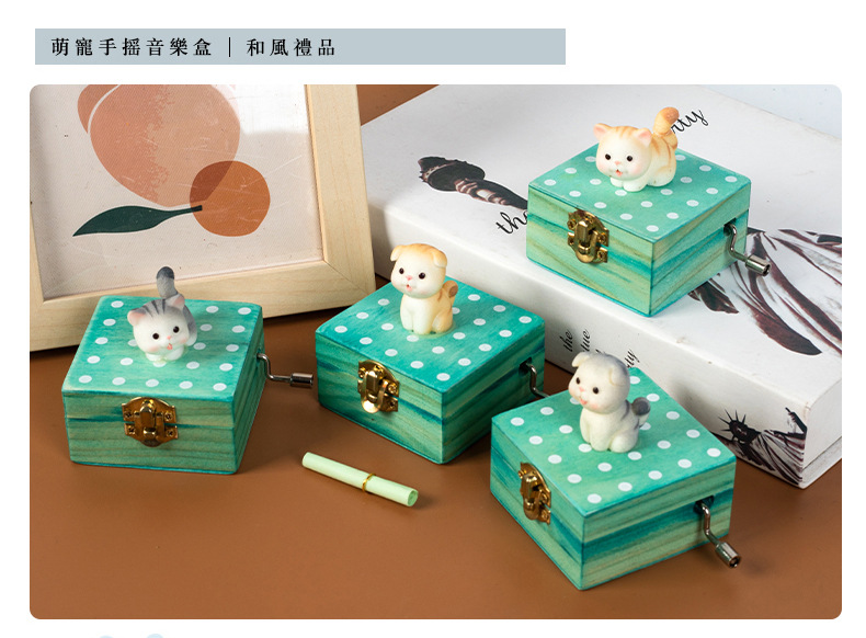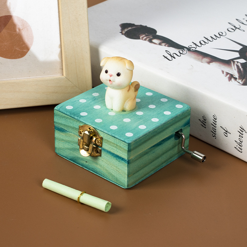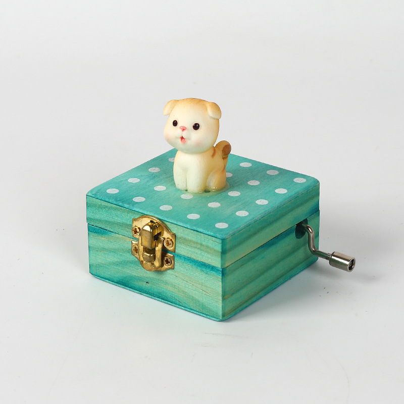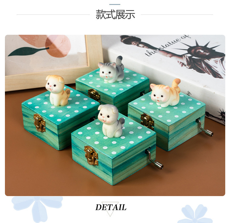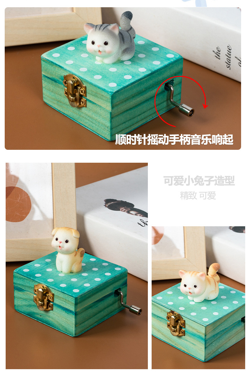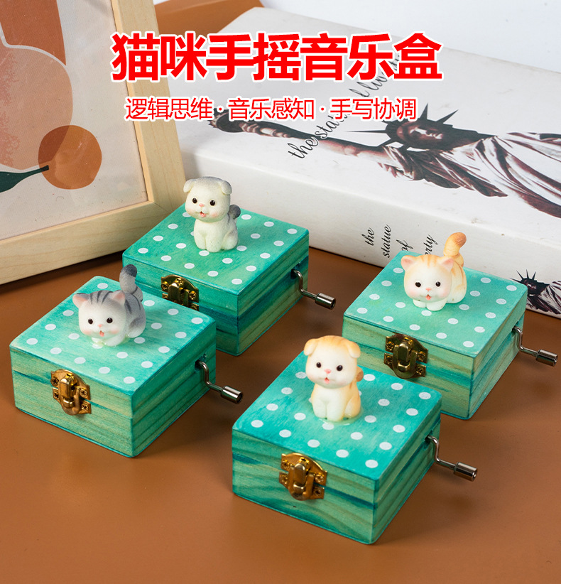 跨境儿童音乐感知木制玩具猫咪狗狗款摇动手柄手摇音乐盒亲子互动