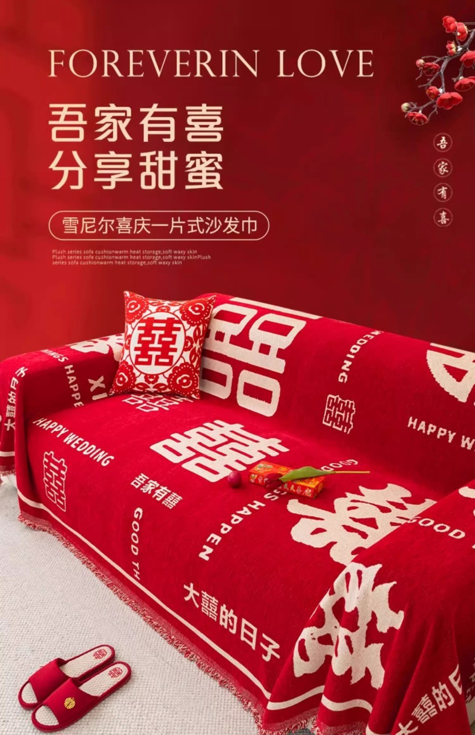中式大红色喜庆沙发盖布结婚用沙发垫子雪尼尔沙发巾家具防尘盖布