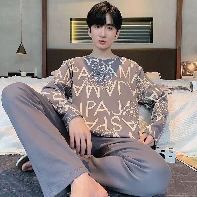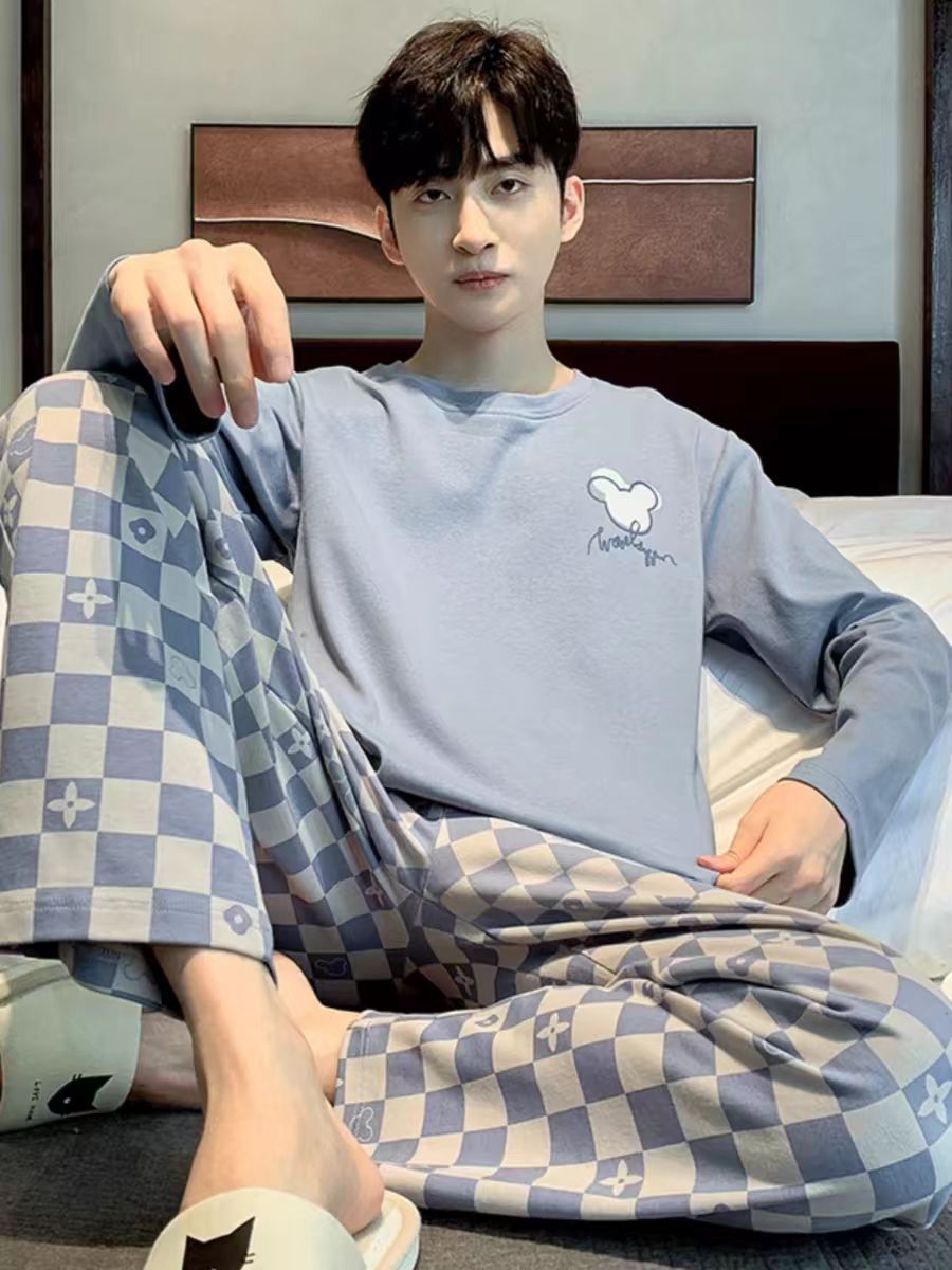 跨境睡衣男士春秋格子纯色多款大码青年家居服套装长袖一件代发