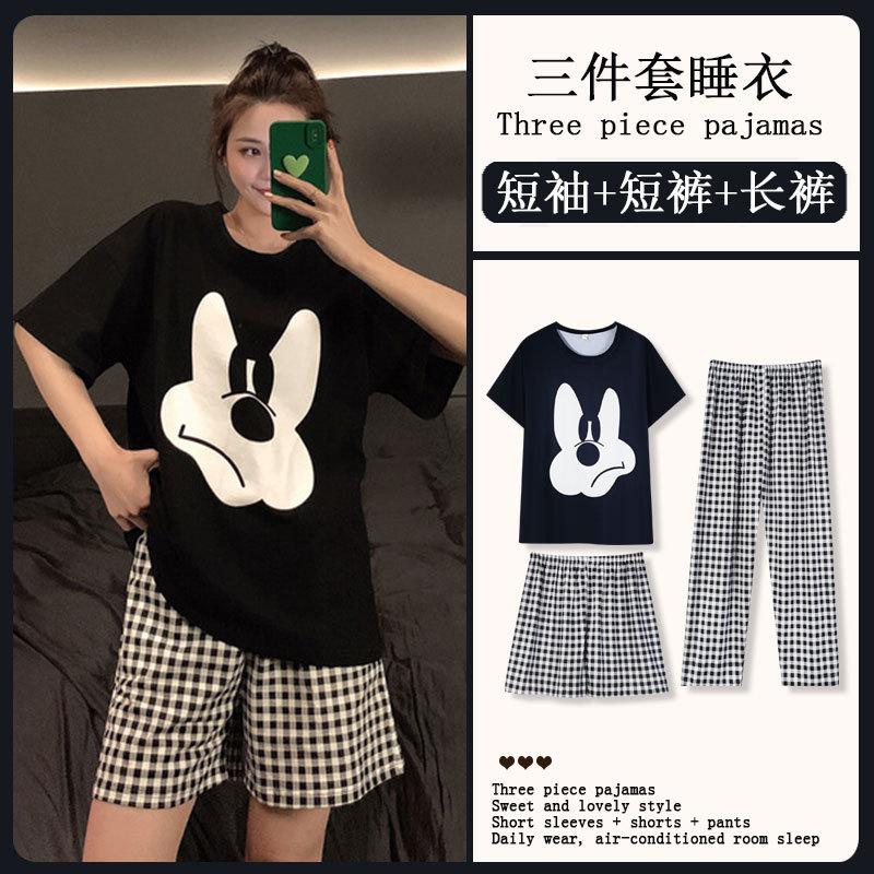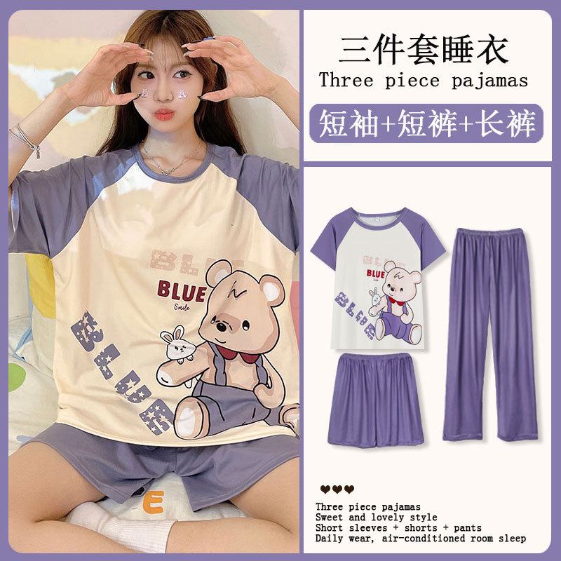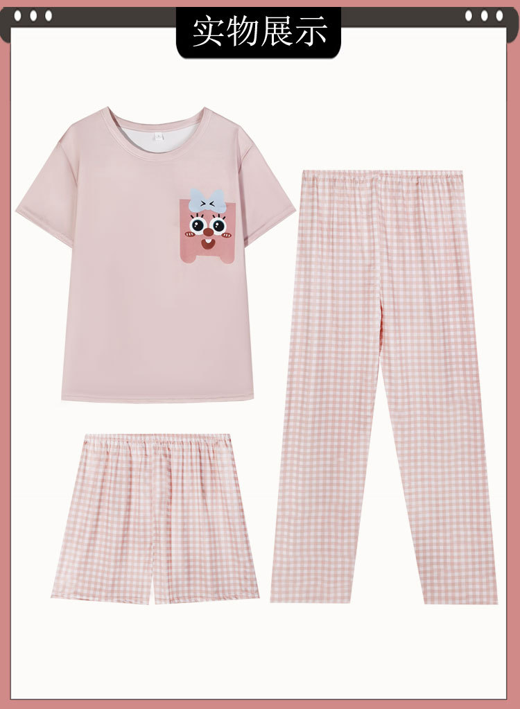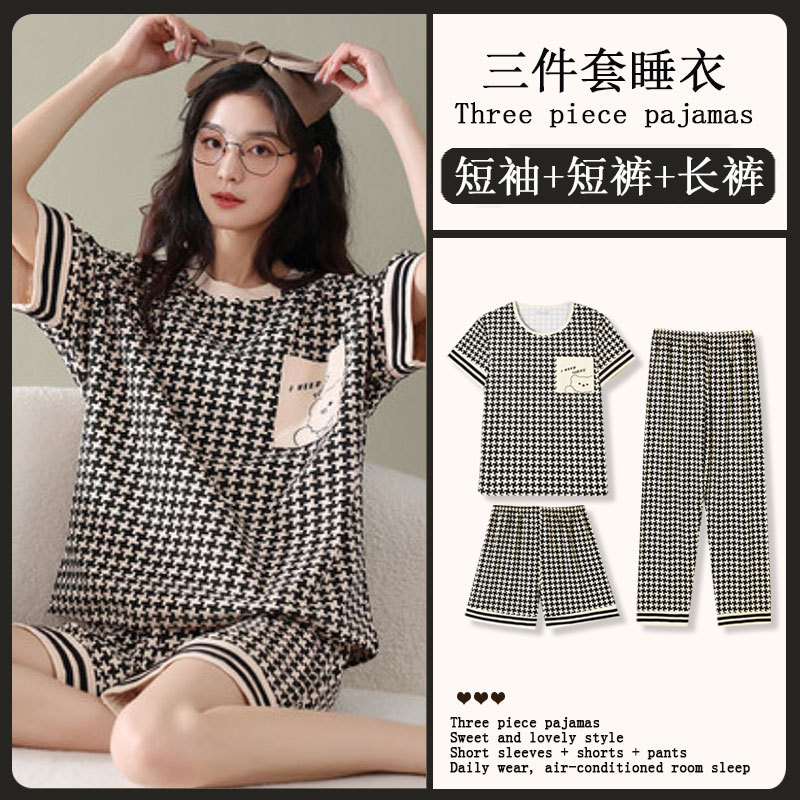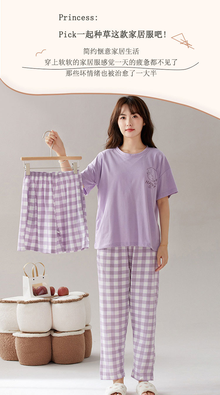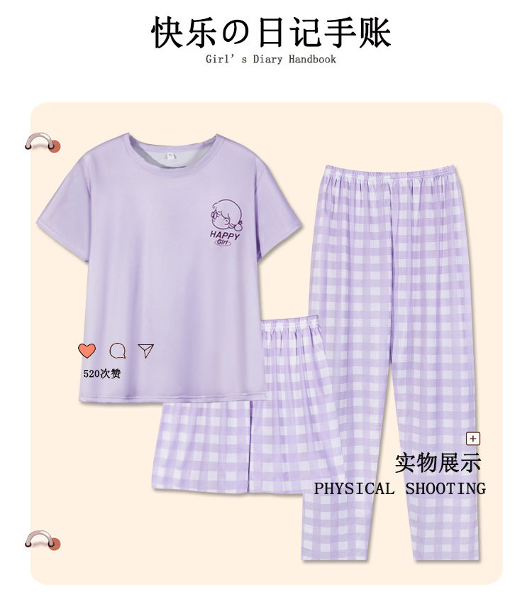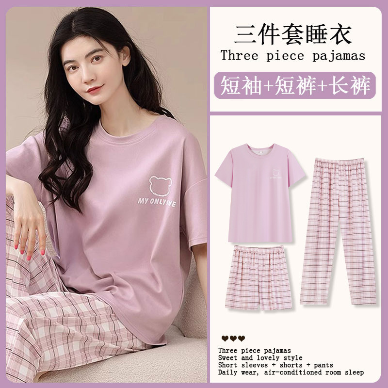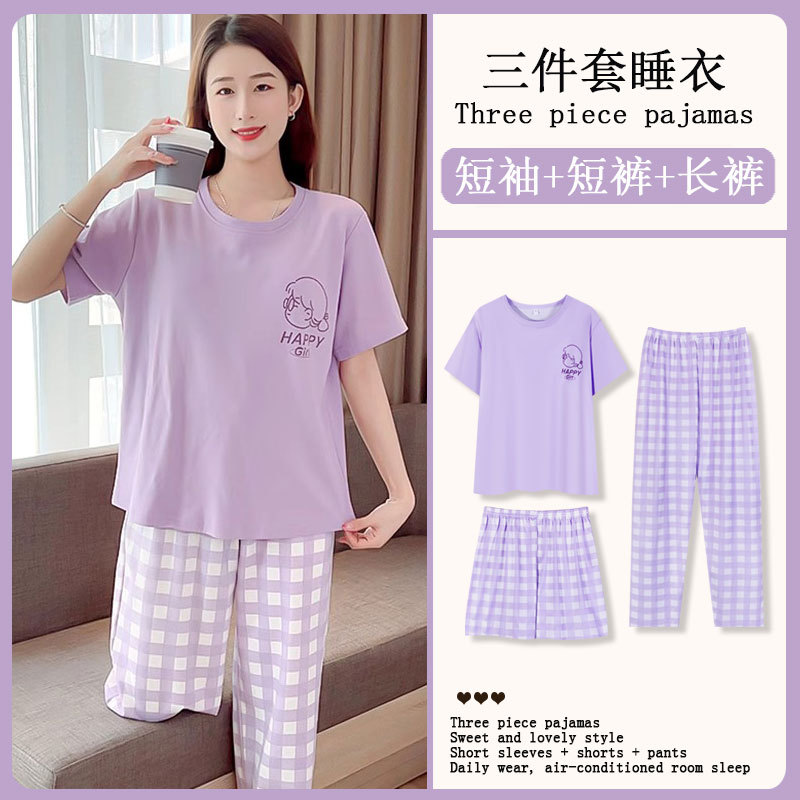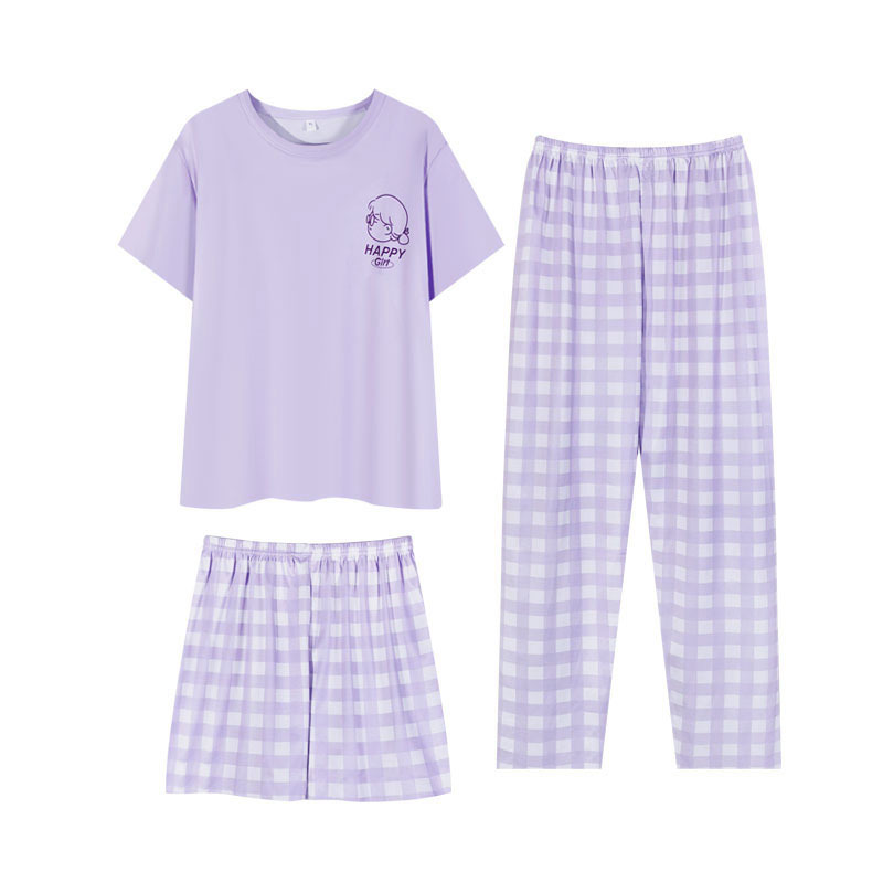 日系睡衣女夏短袖三件套薄款夏季可外穿格子高级感紫色家居服套装