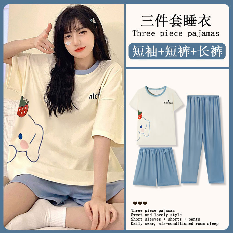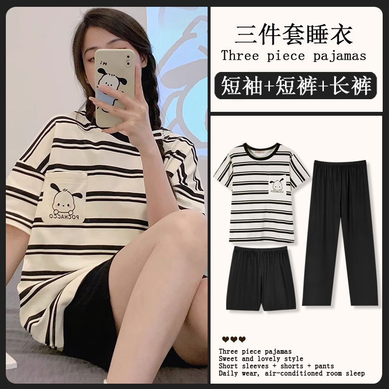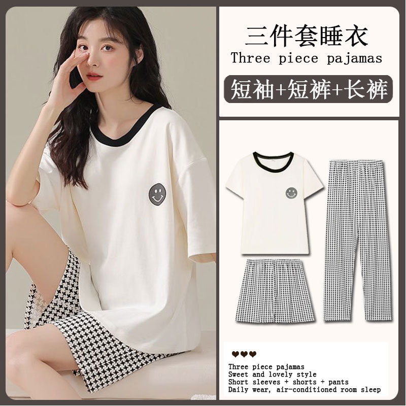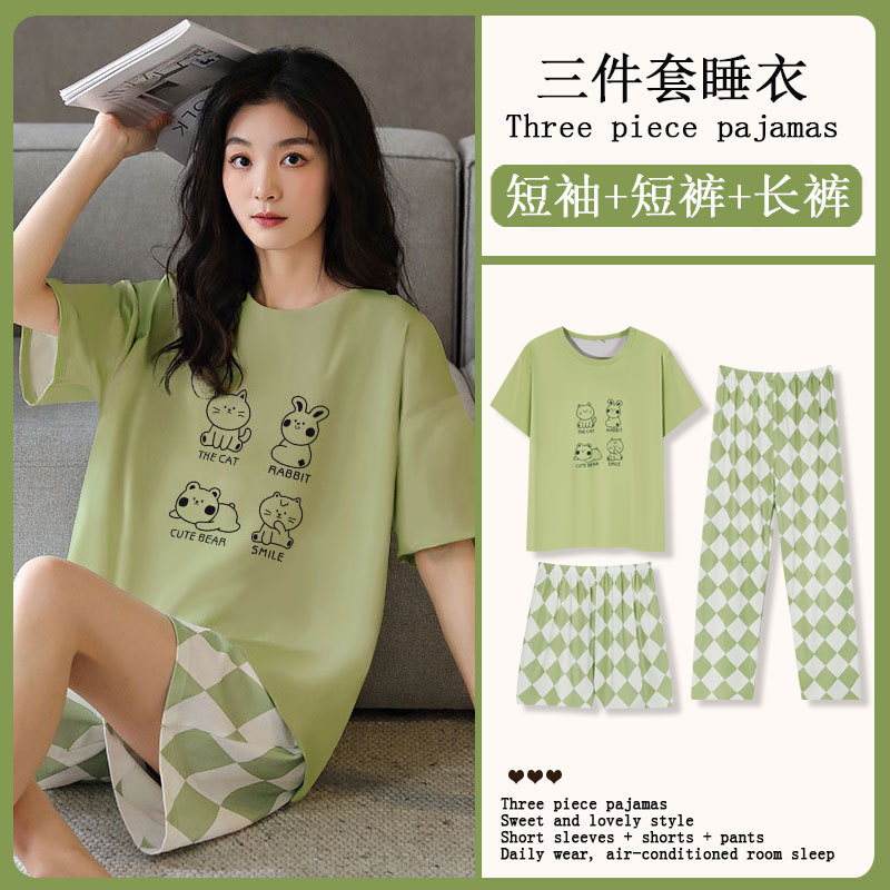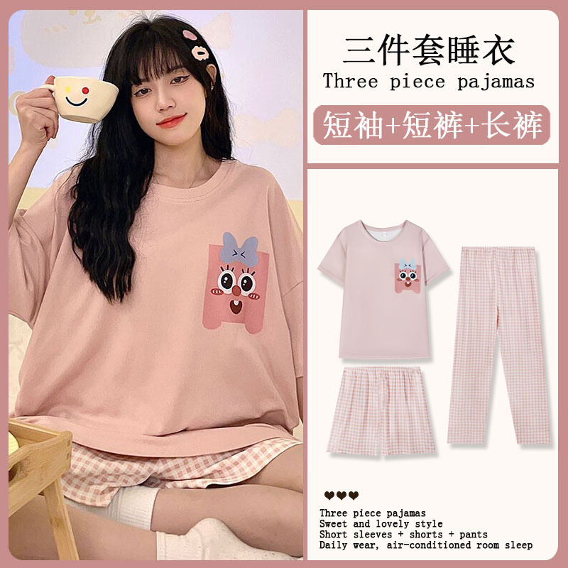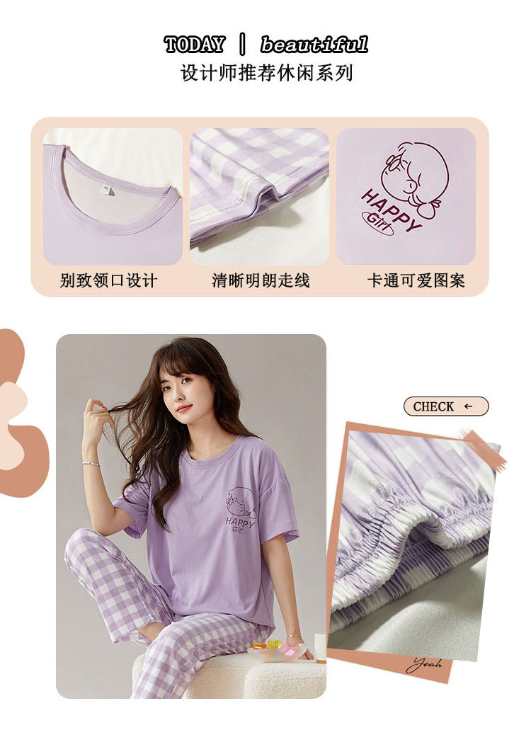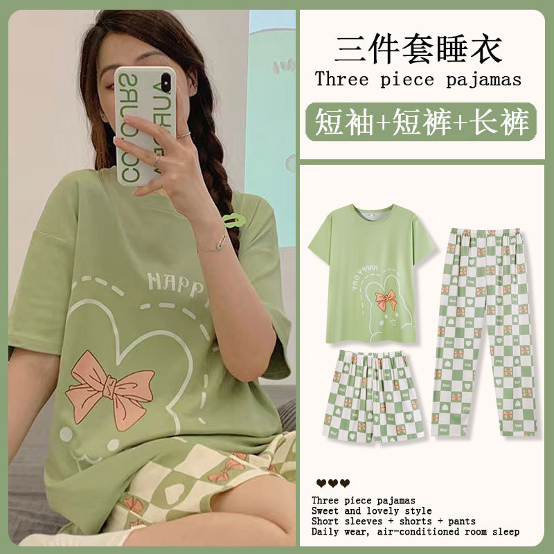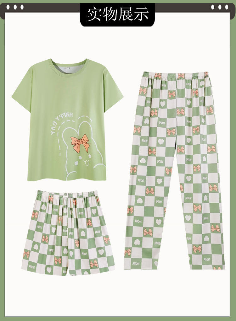 日系睡衣女夏短袖三件套薄款夏季可外穿格子高级感紫色家居服套装