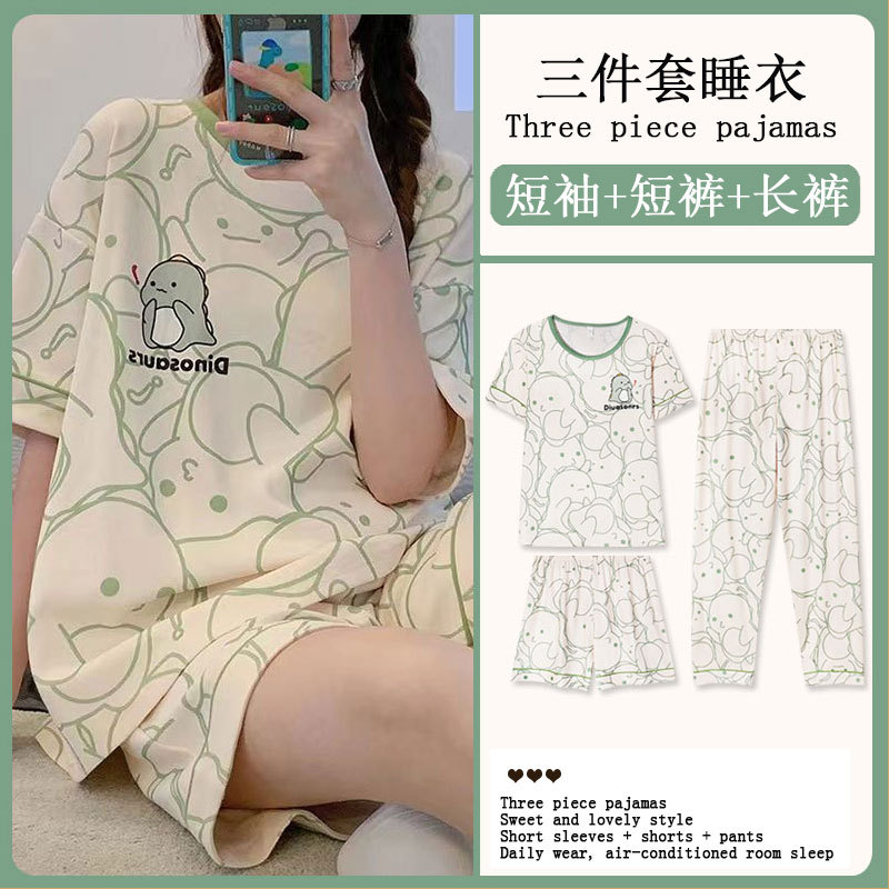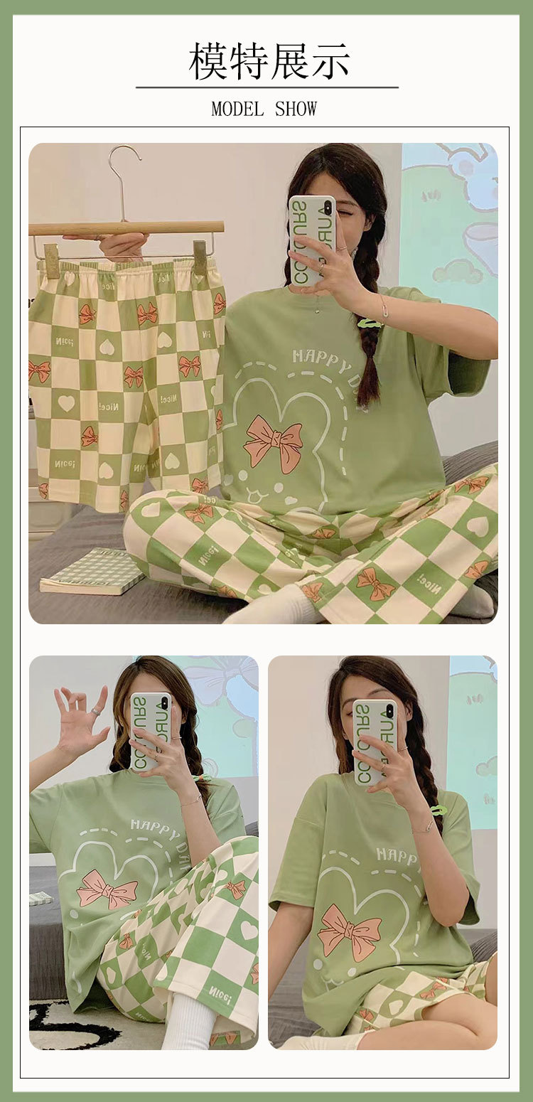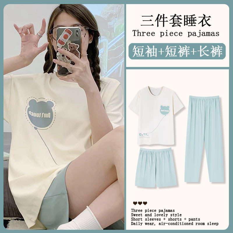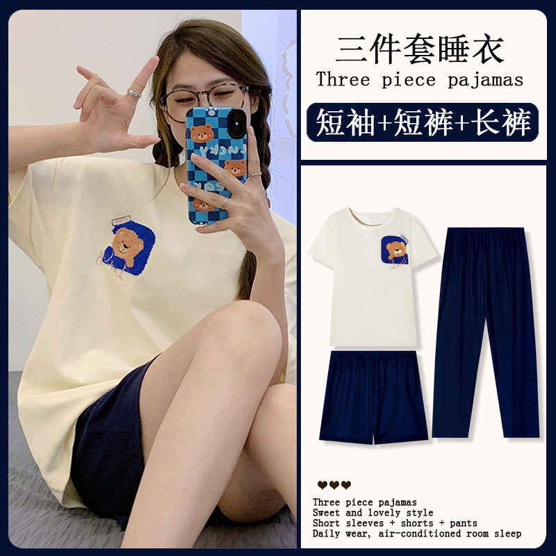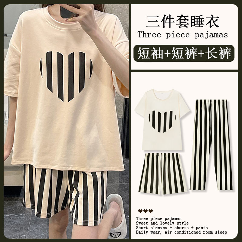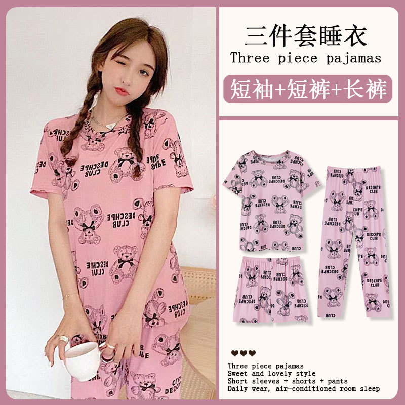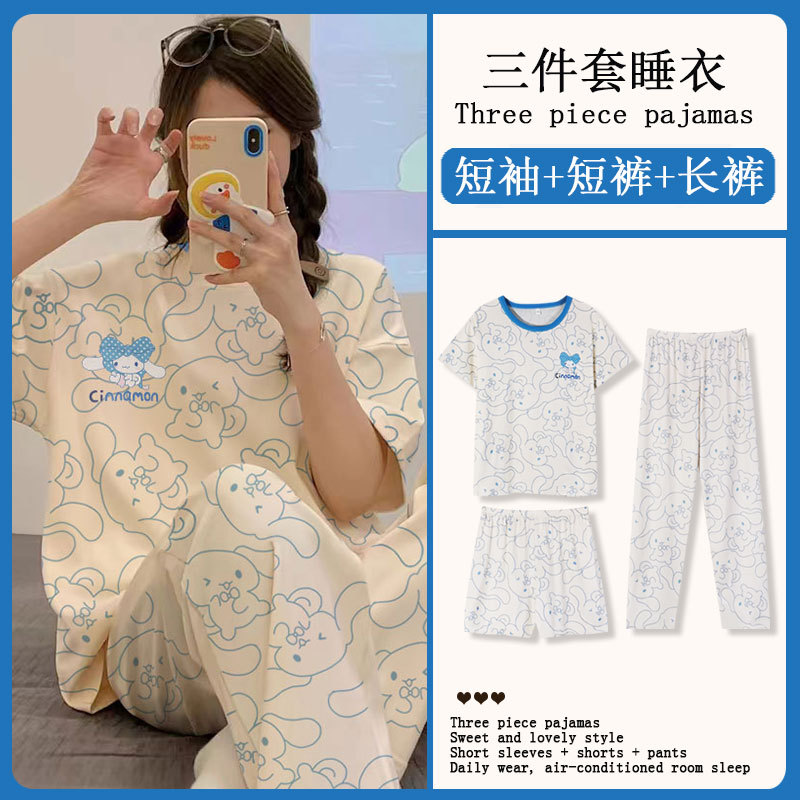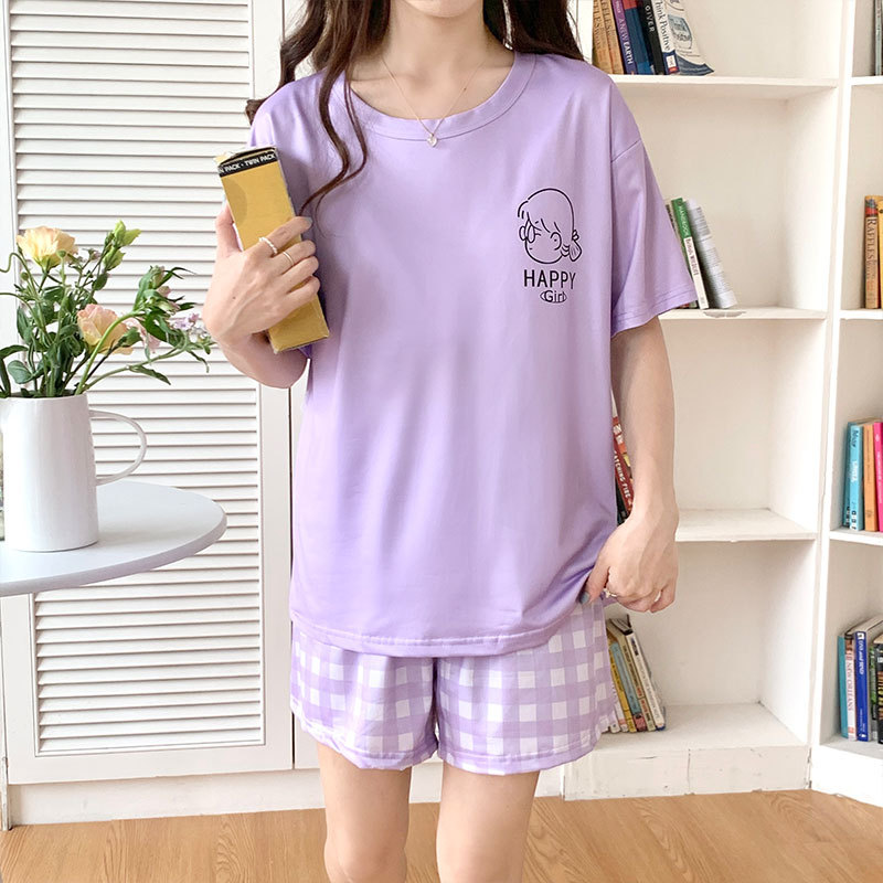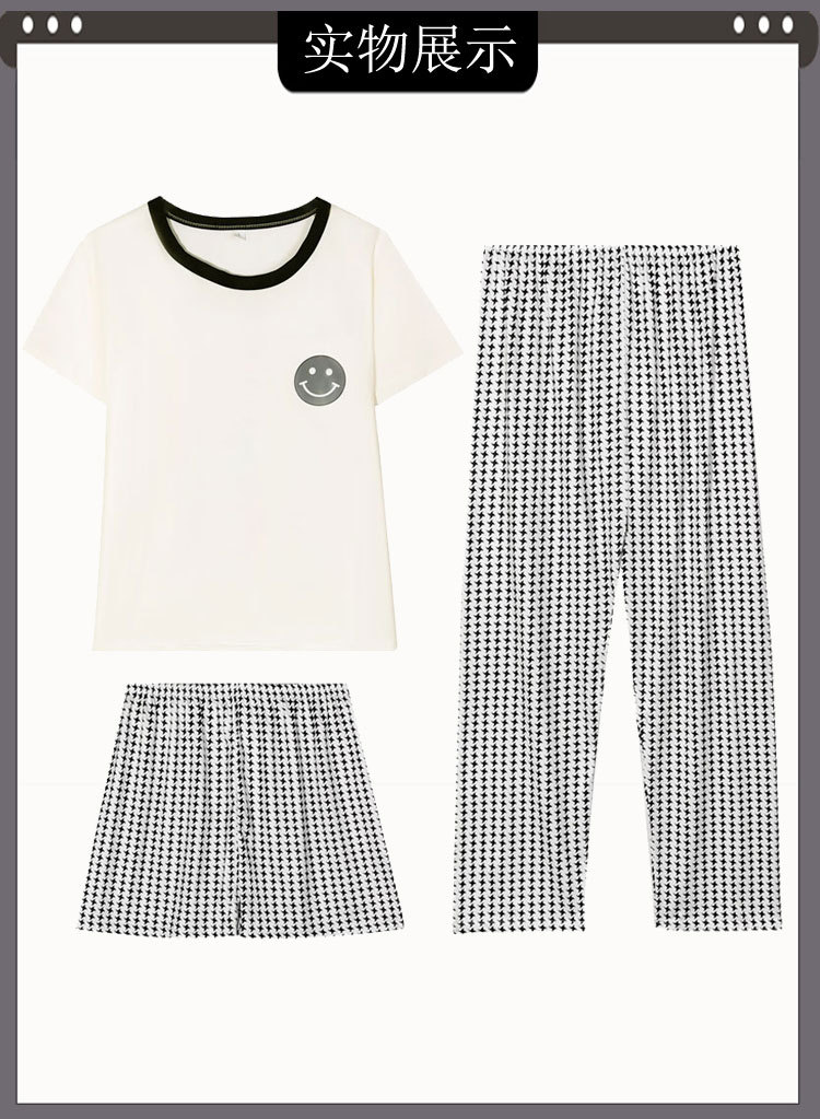日系睡衣女夏短袖三件套薄款夏季可外穿格子高级感紫色家居服套装