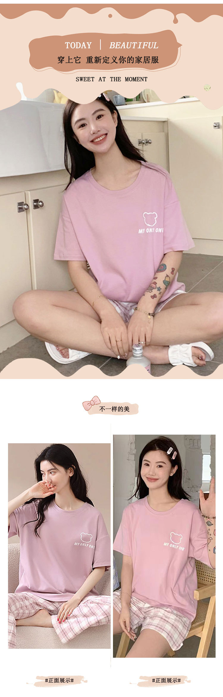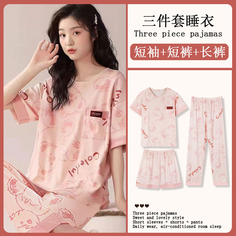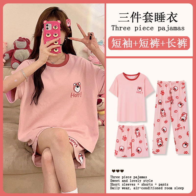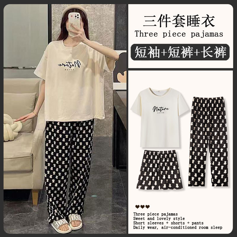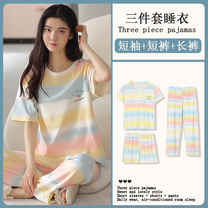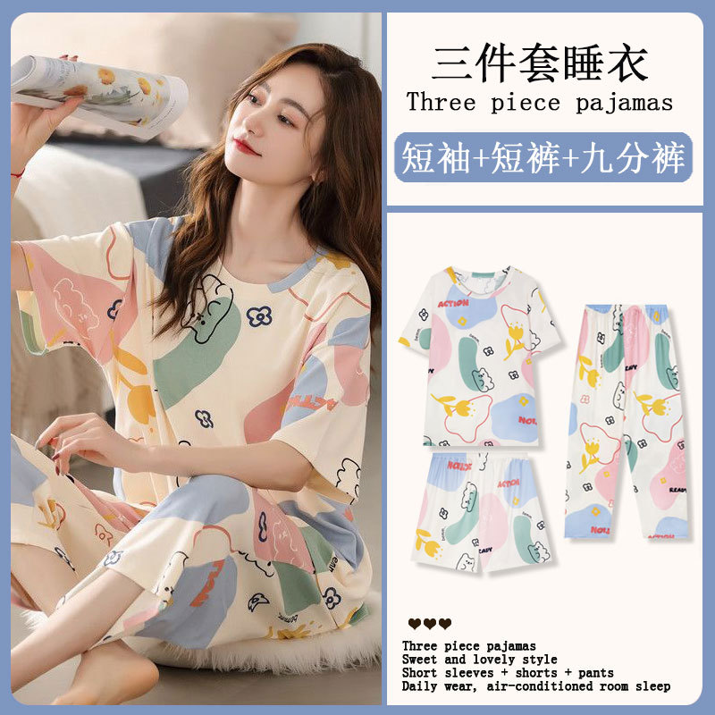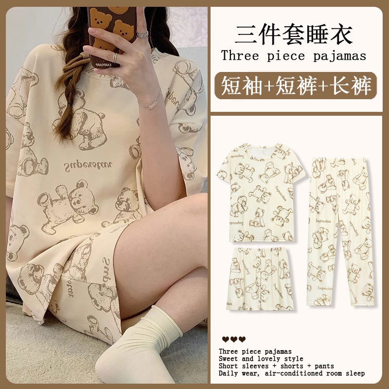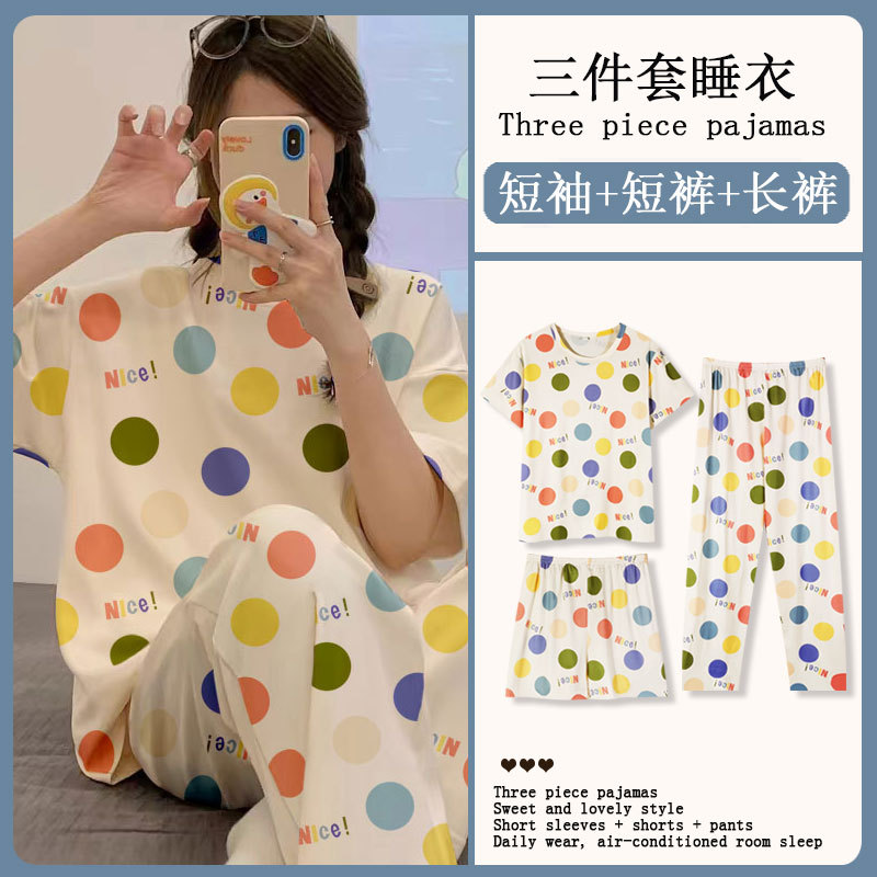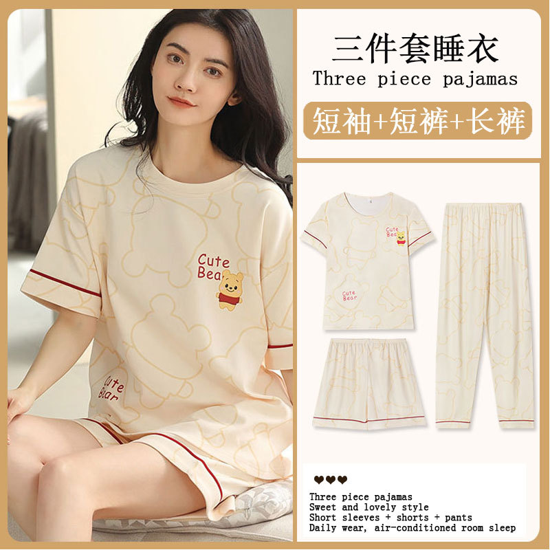 日系睡衣女夏短袖三件套薄款夏季可外穿格子高级感紫色家居服套装