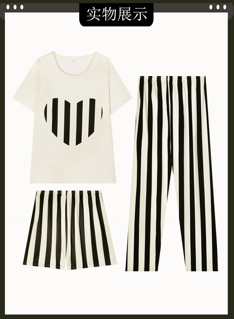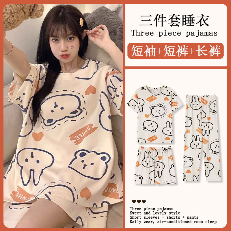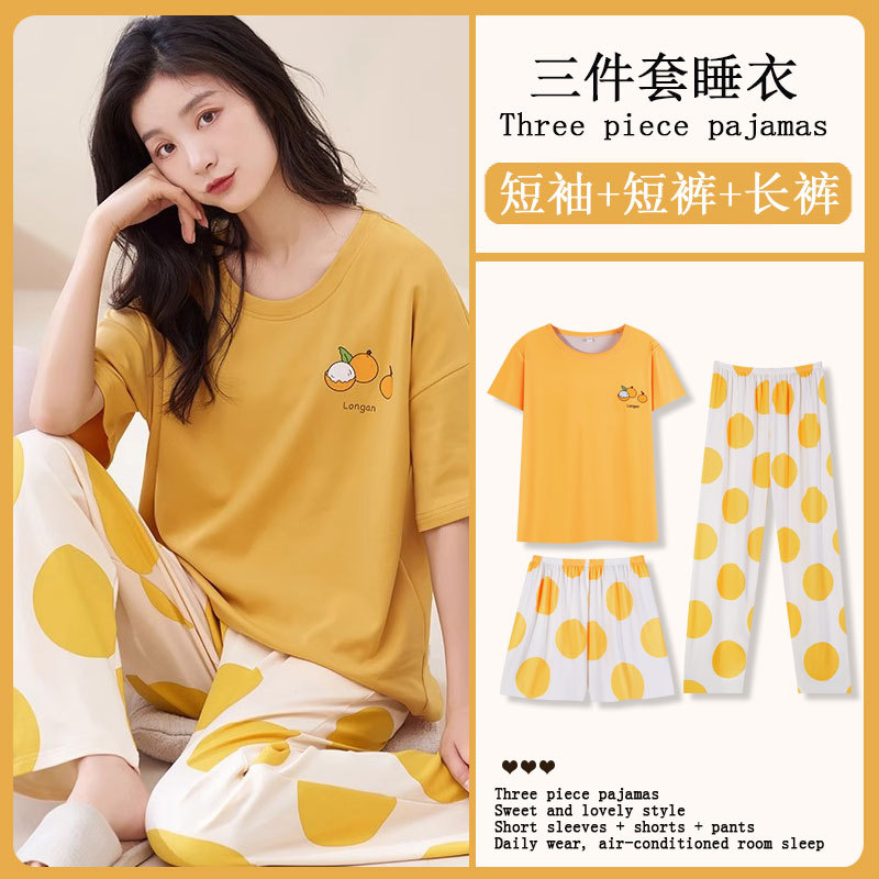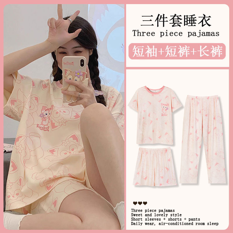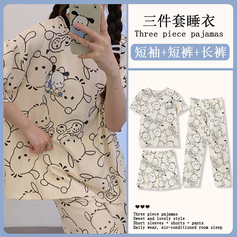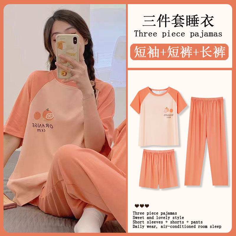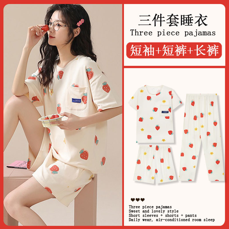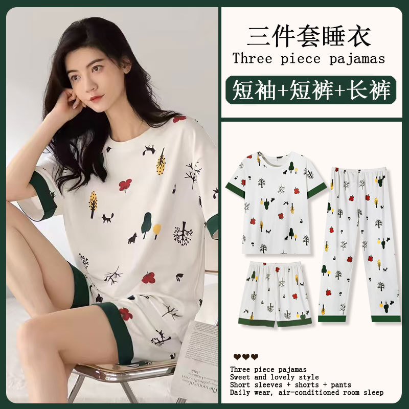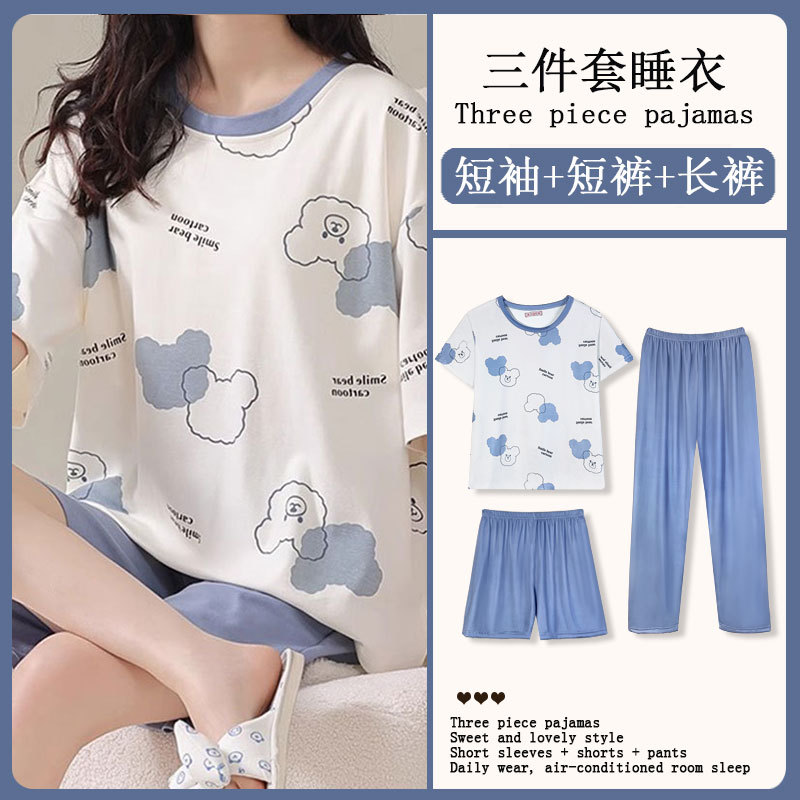 日系睡衣女夏短袖三件套薄款夏季可外穿格子高级感紫色家居服套装