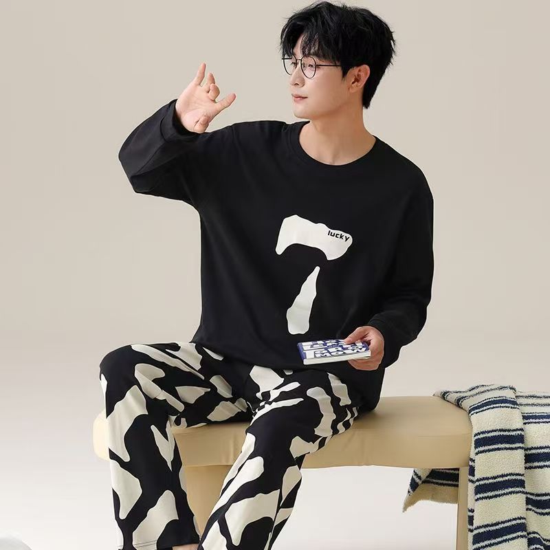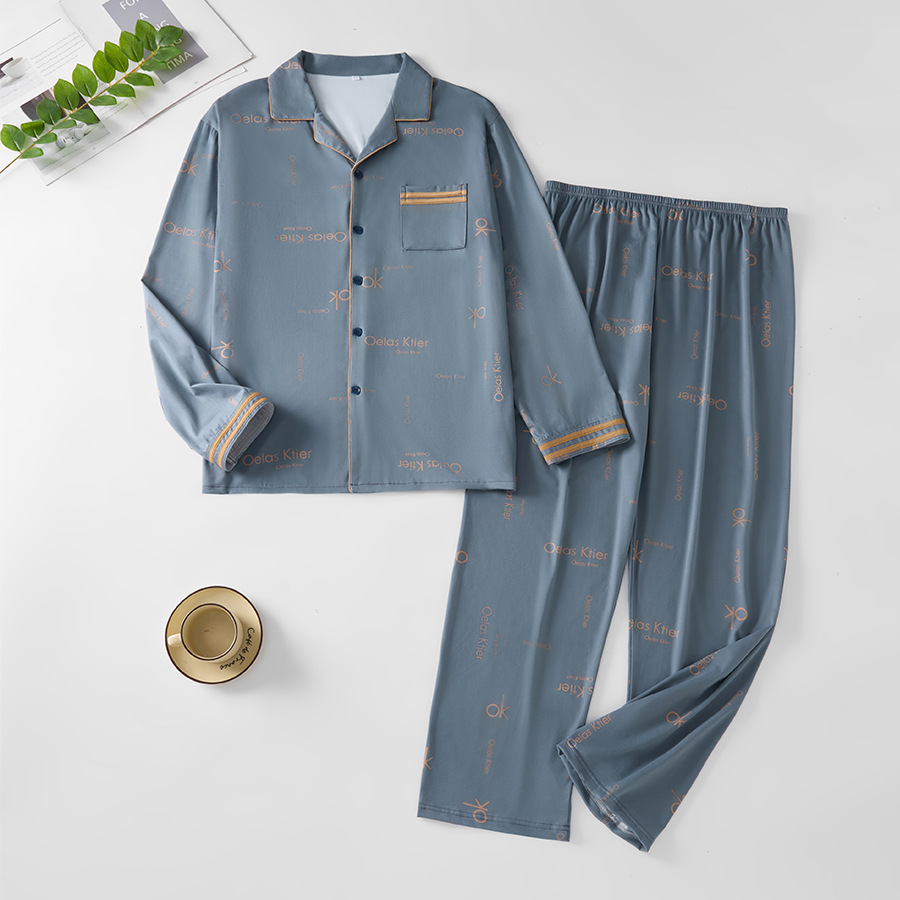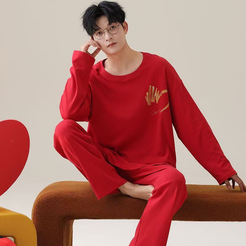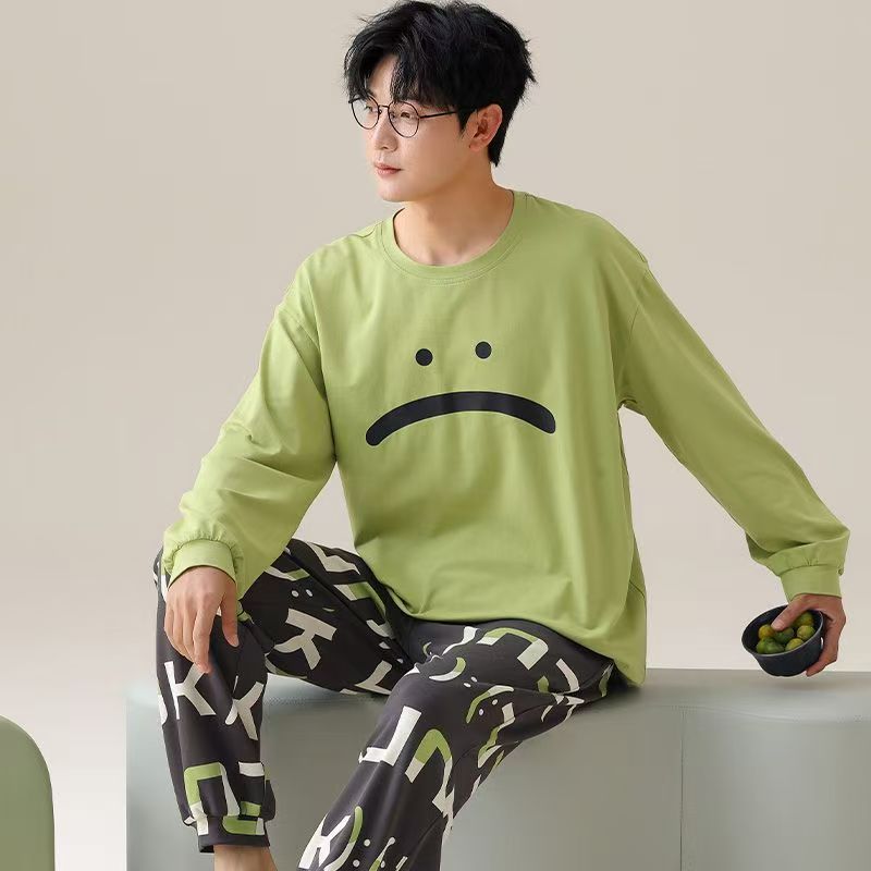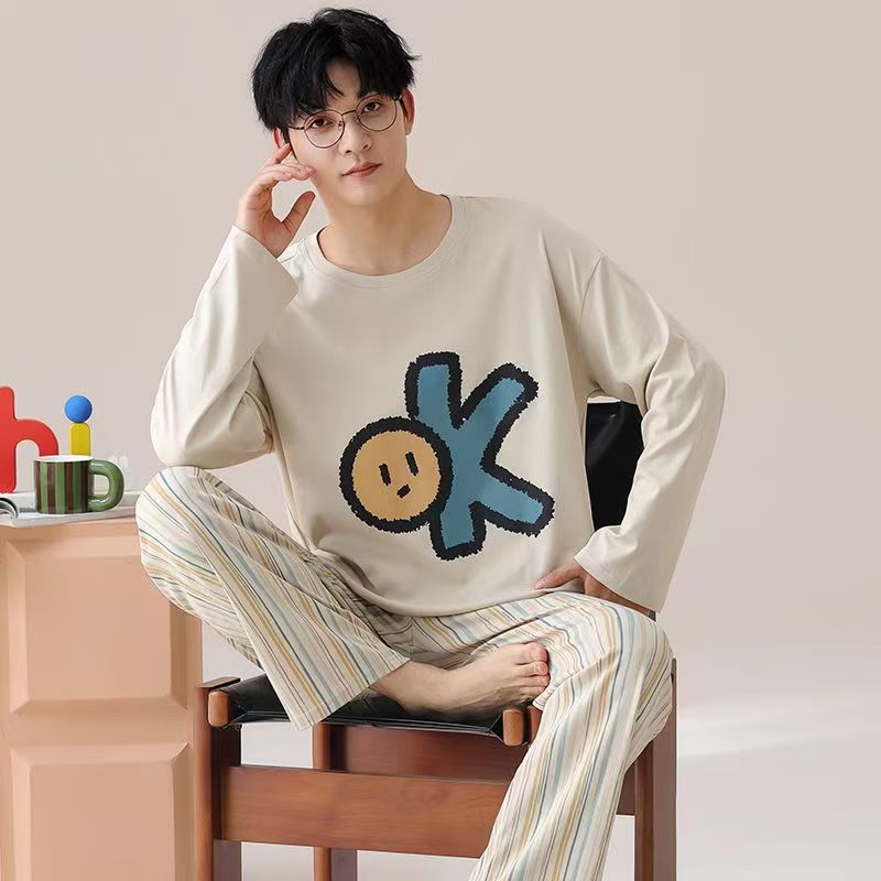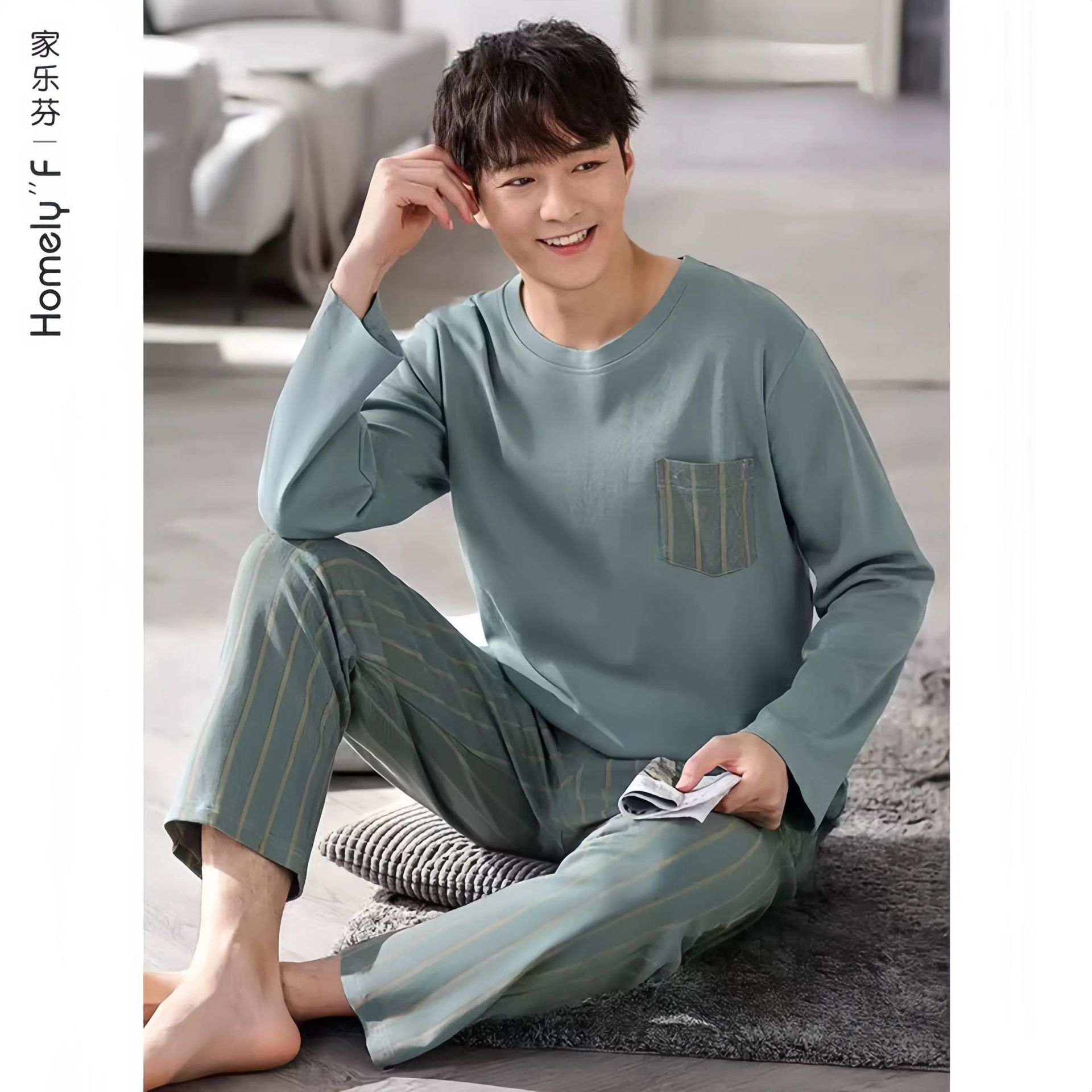 100%高档纯棉睡衣男款春秋季长袖男士青年大码休闲家居服宽松套装
