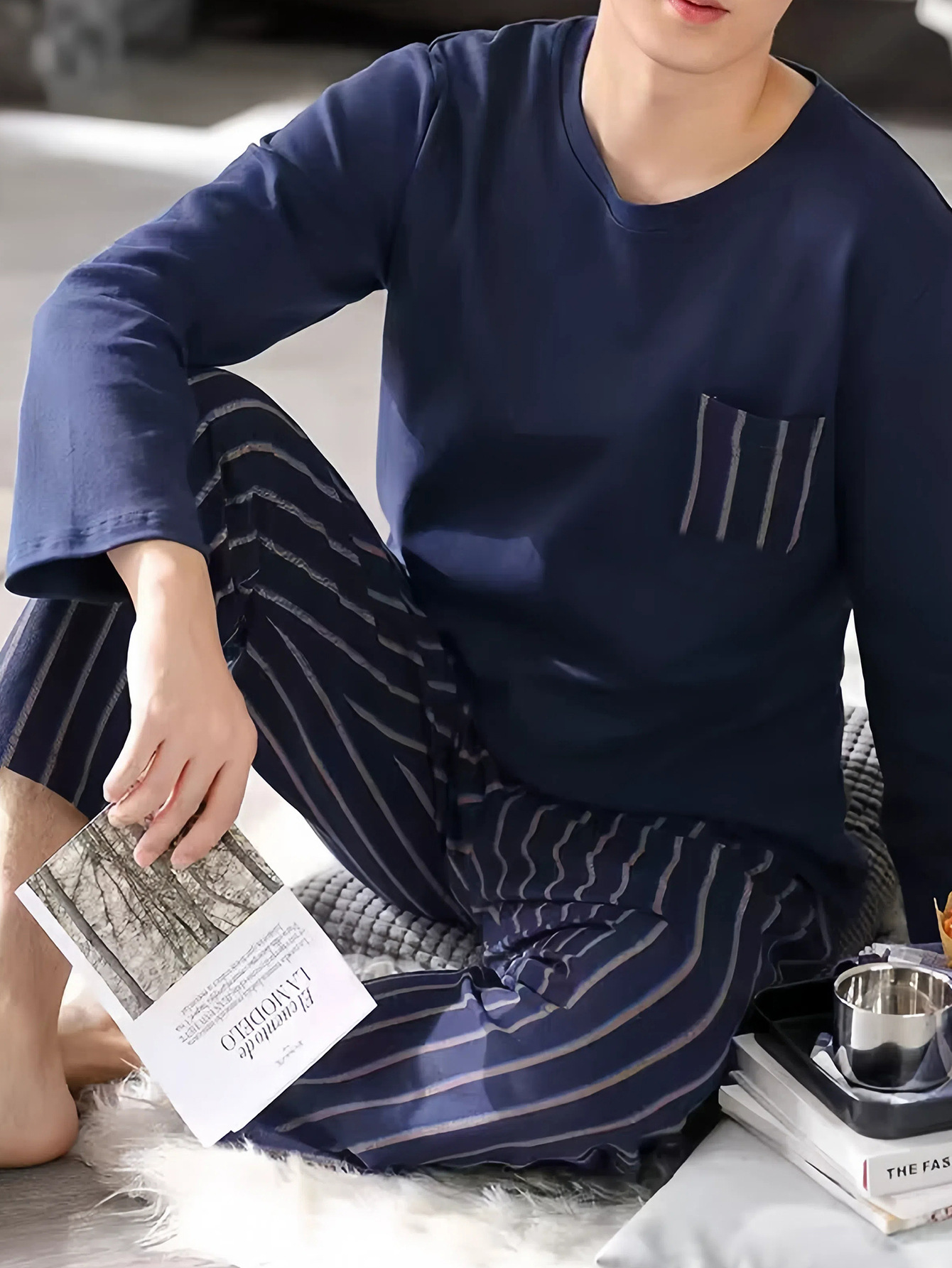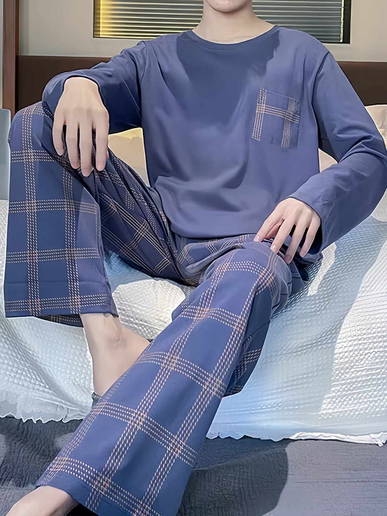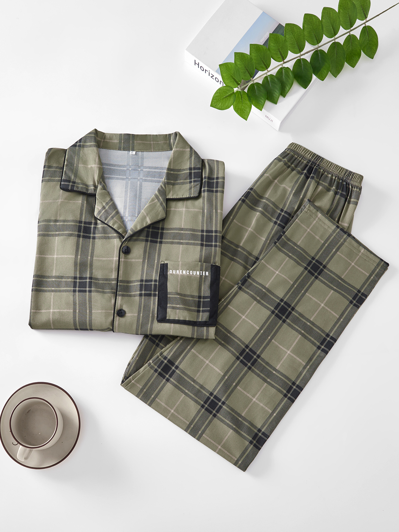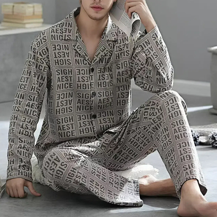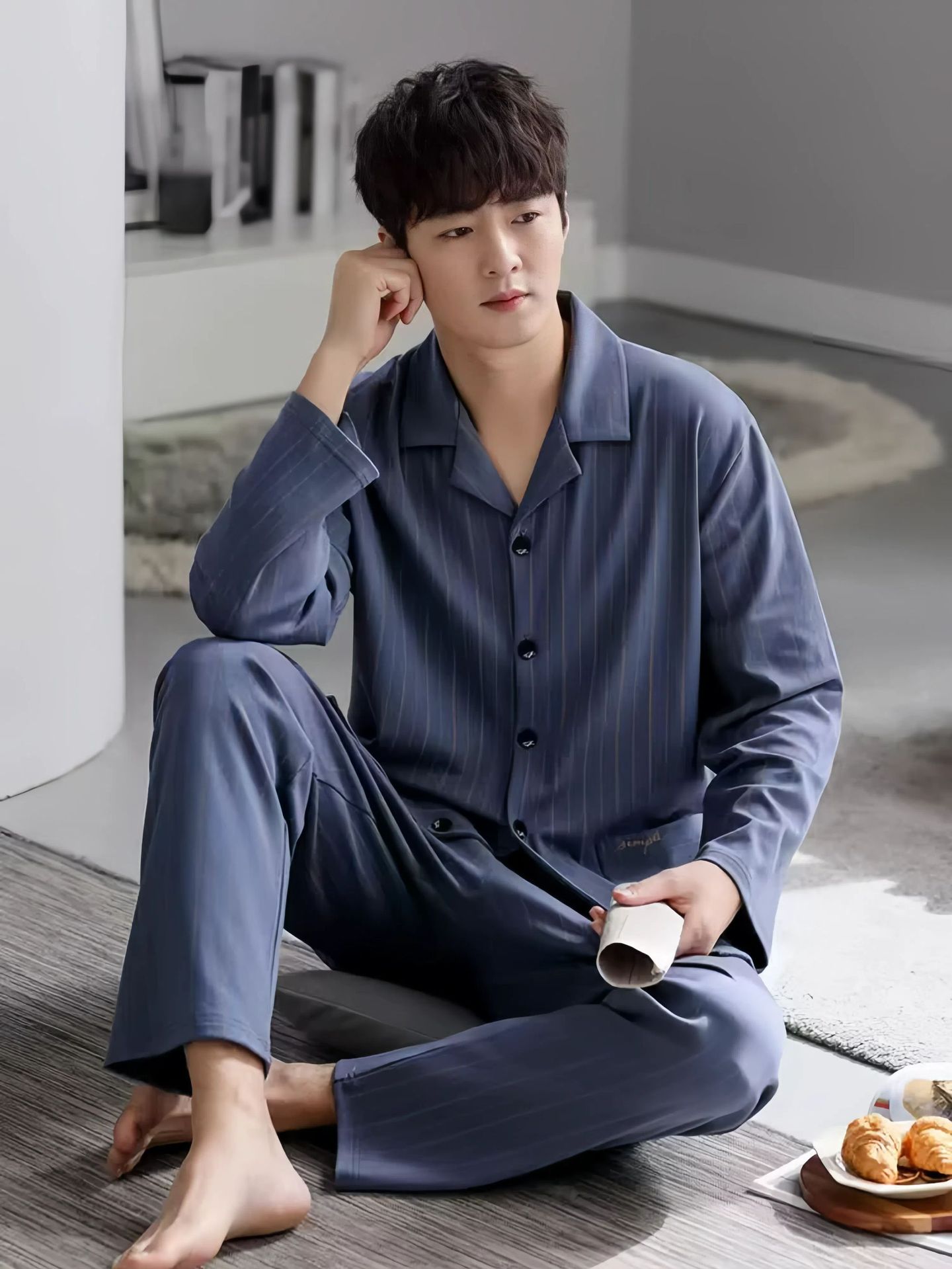 100%高档纯棉睡衣男款春秋季长袖男士青年大码休闲家居服宽松套装