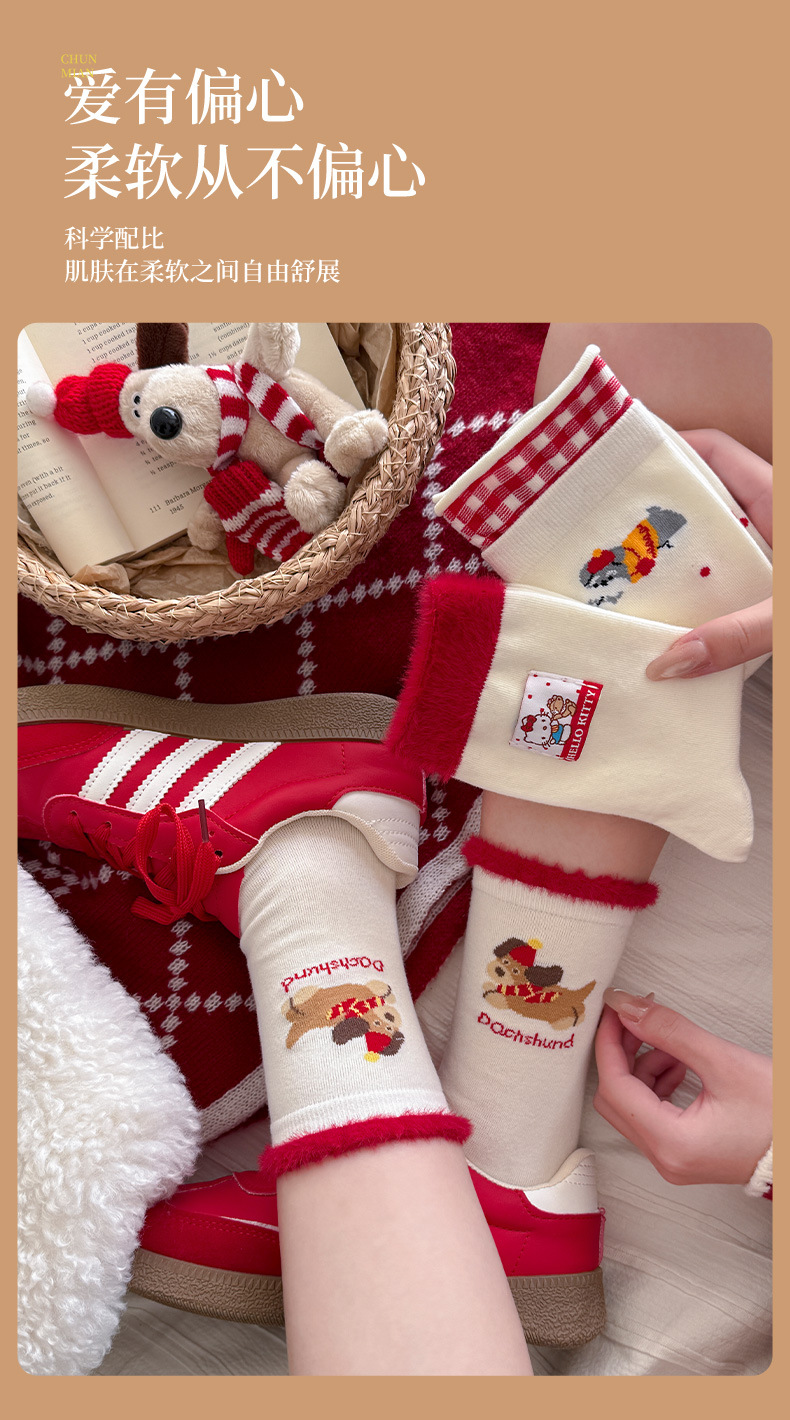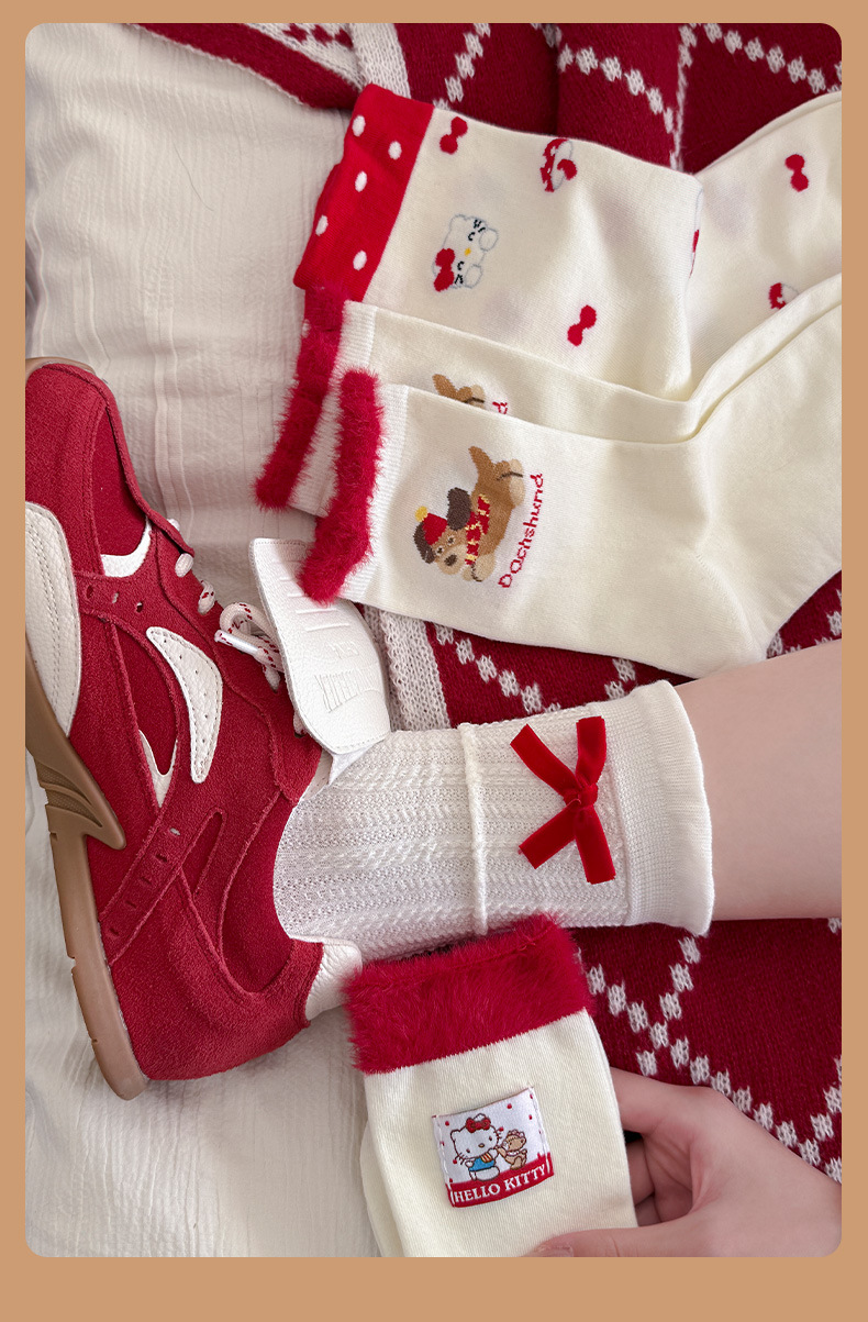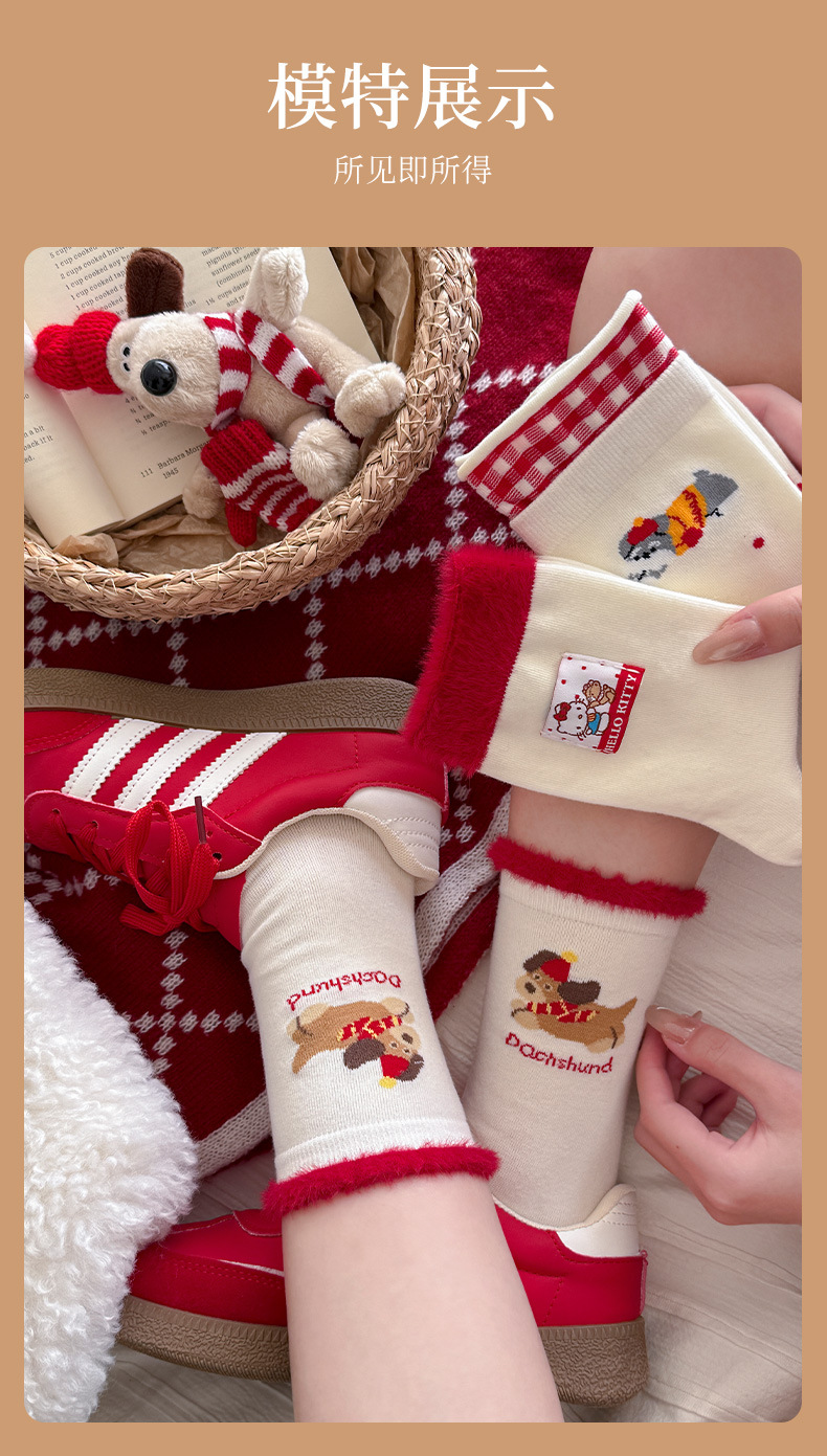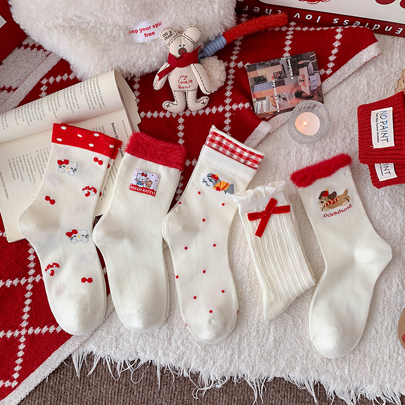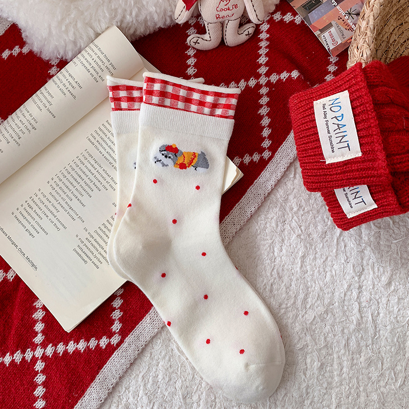 红色袜子女卡通可爱小狗中筒袜网红布标猫咪袜子甜美蝴蝶结堆堆袜