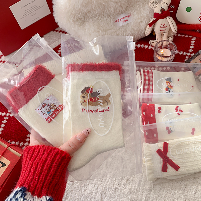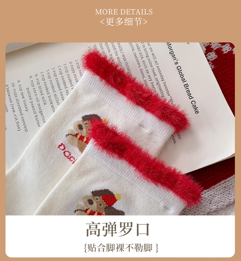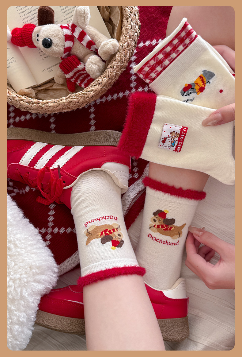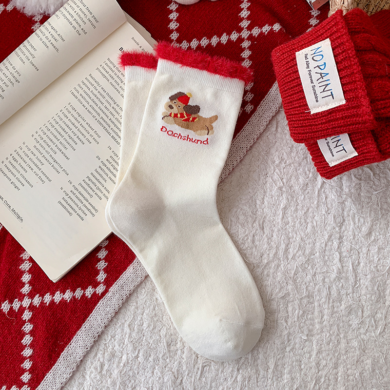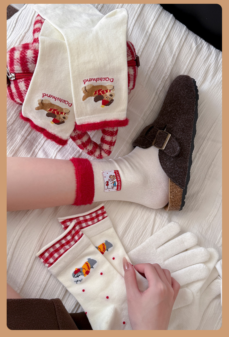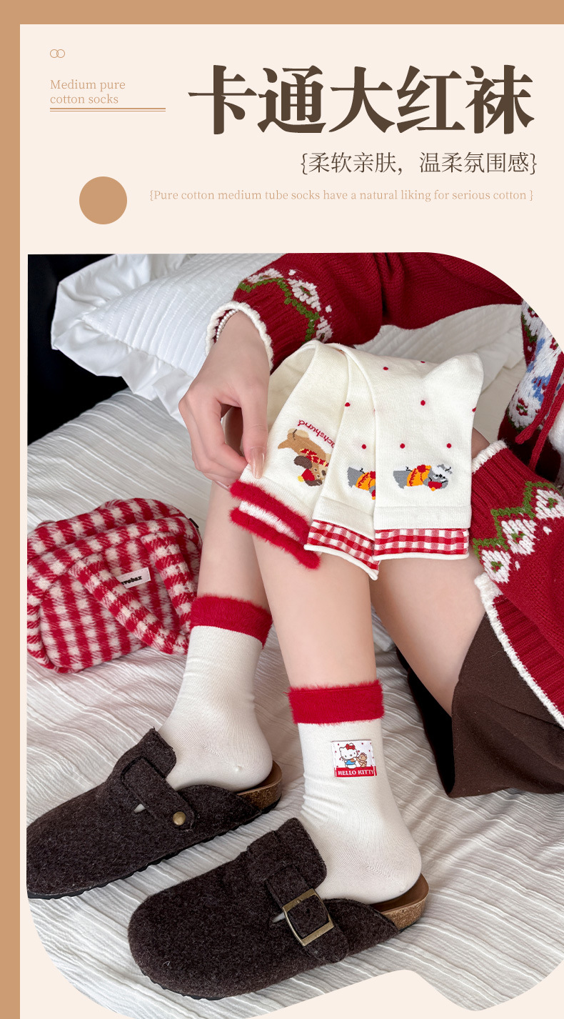 红色袜子女卡通可爱小狗中筒袜网红布标猫咪袜子甜美蝴蝶结堆堆袜