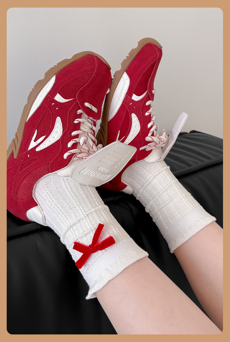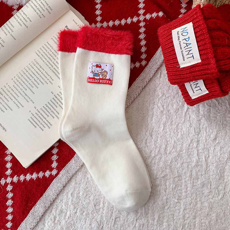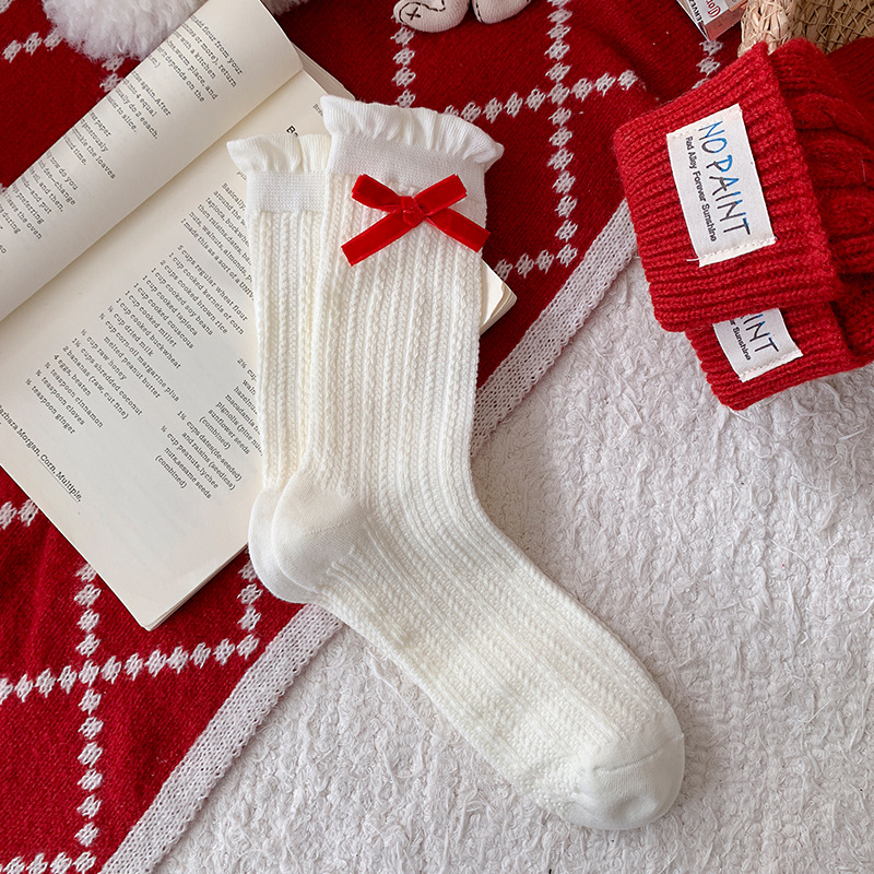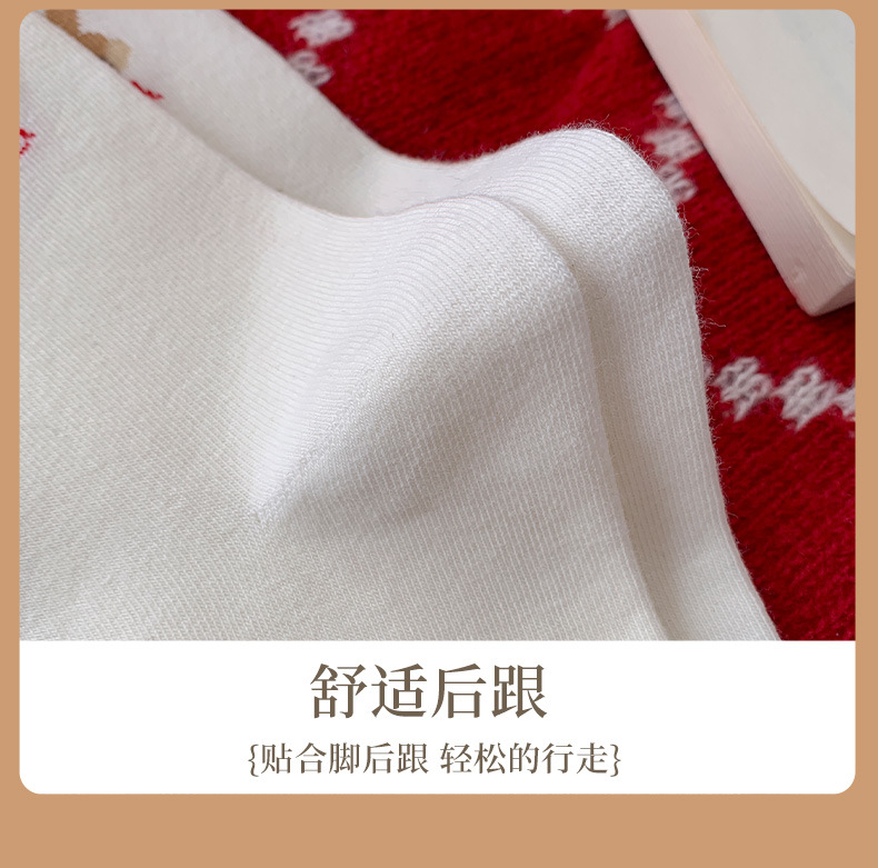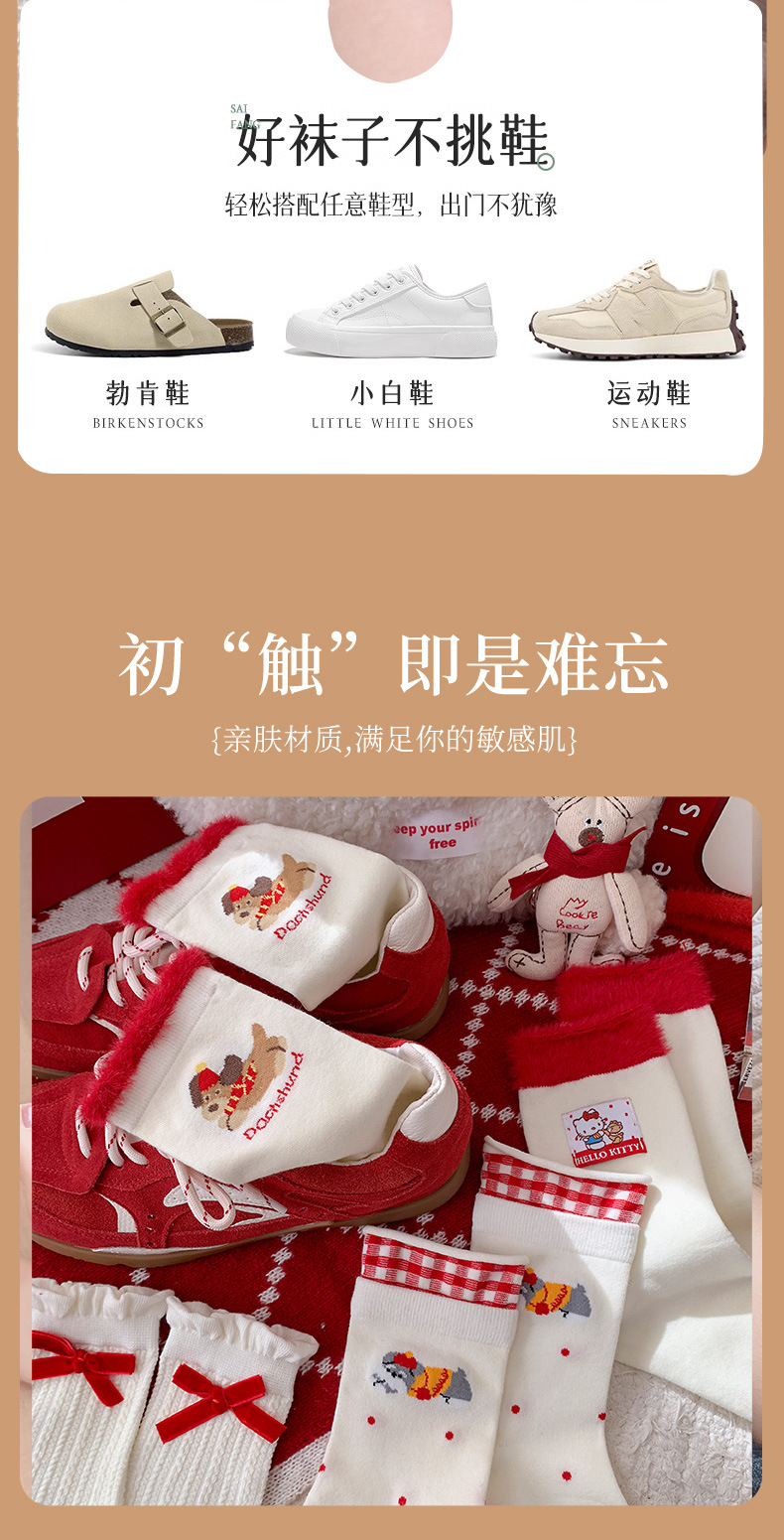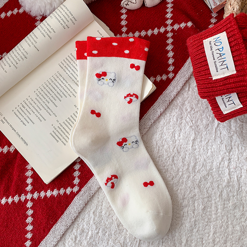 红色袜子女卡通可爱小狗中筒袜网红布标猫咪袜子甜美蝴蝶结堆堆袜