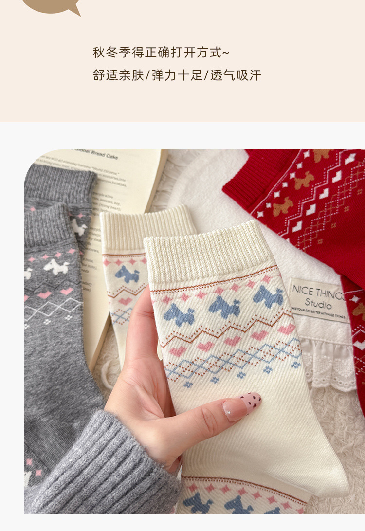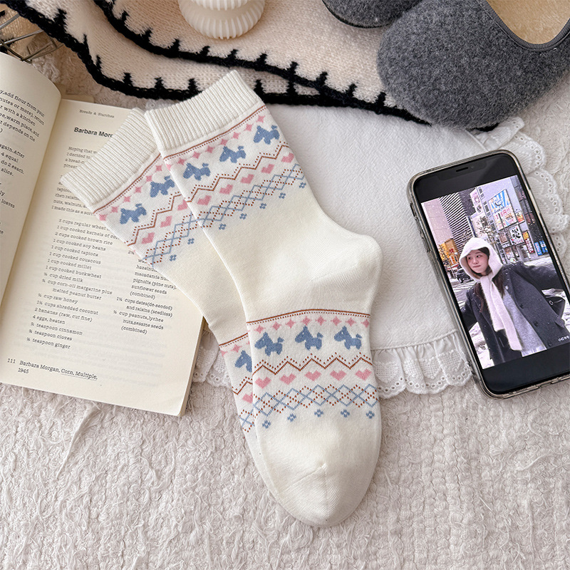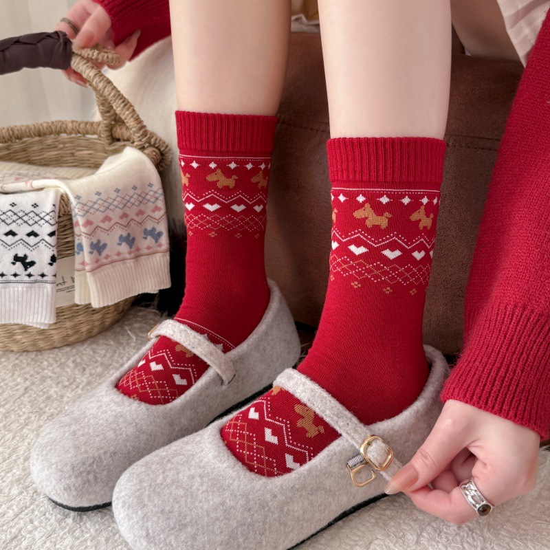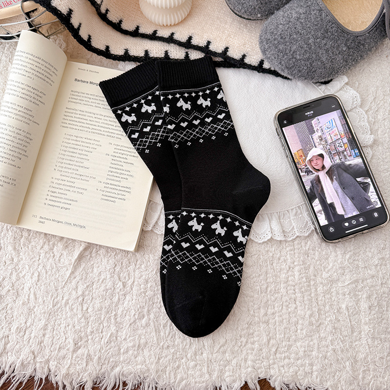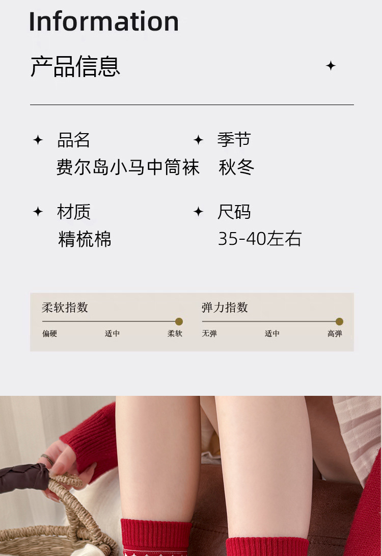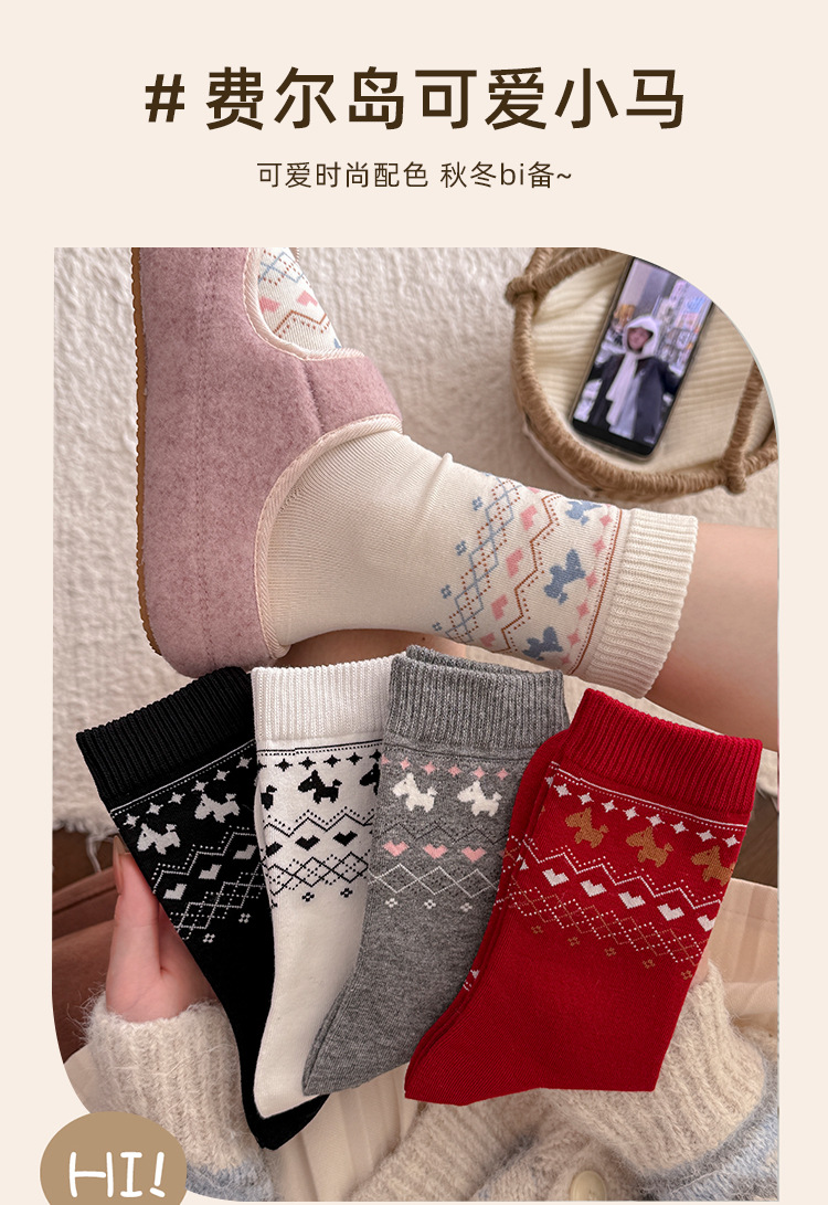 马年袜子女卡通可爱小马中筒袜时尚百搭无骨堆堆袜复古费尔岛袜子