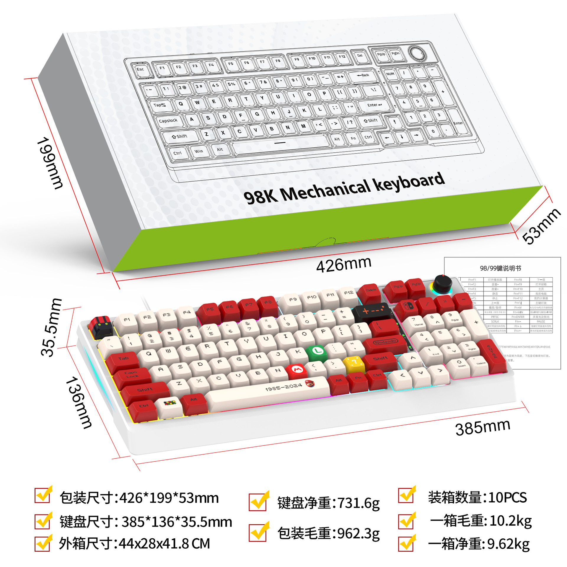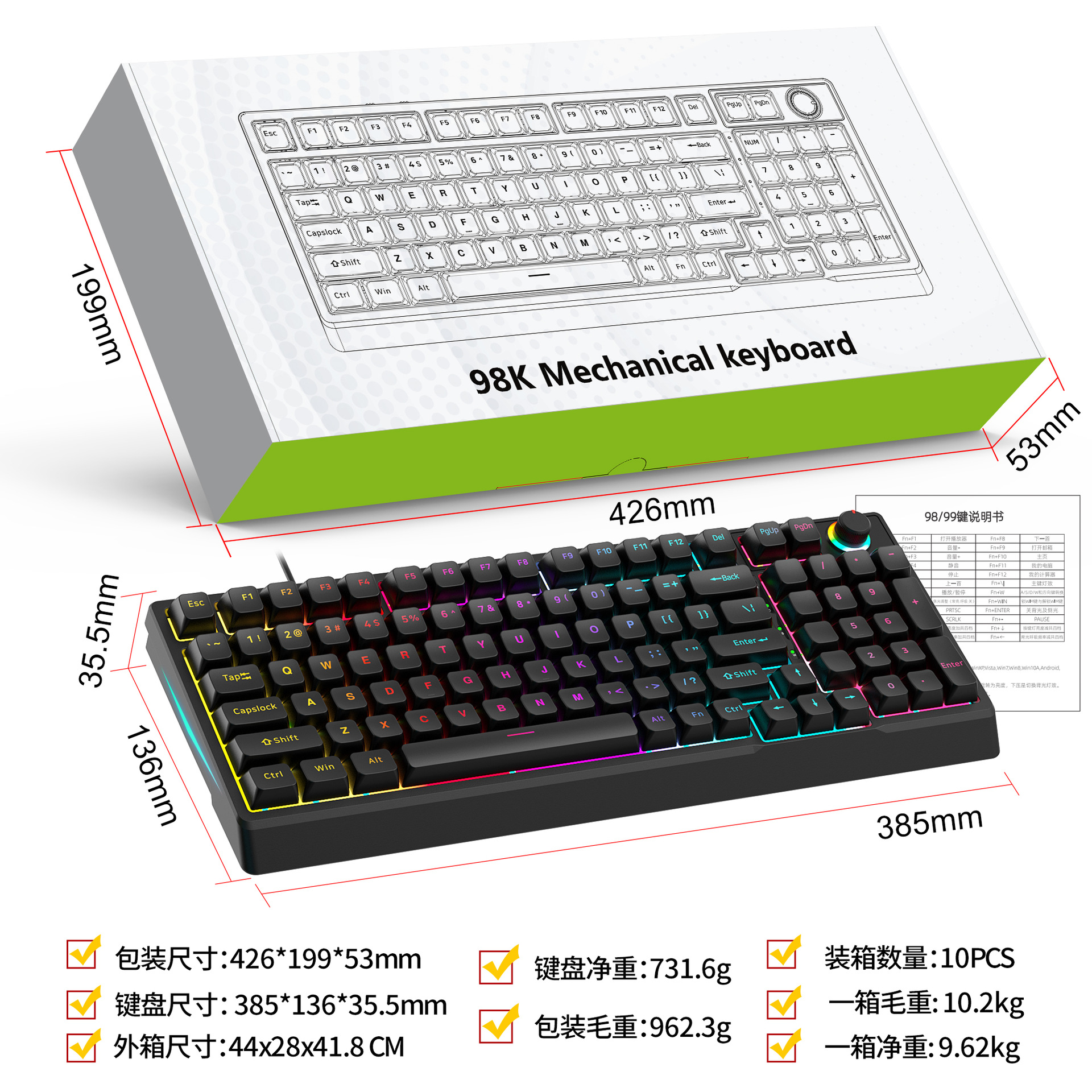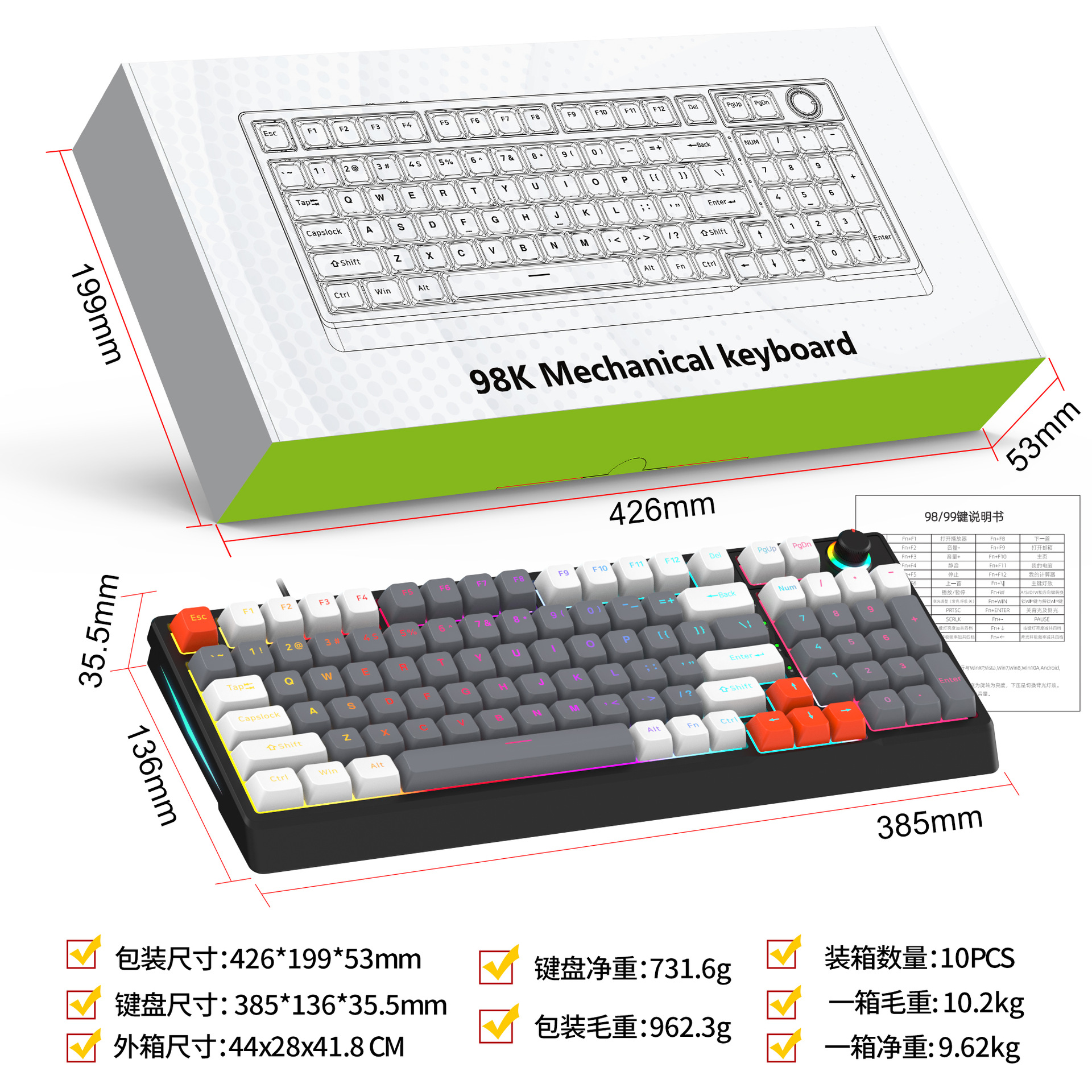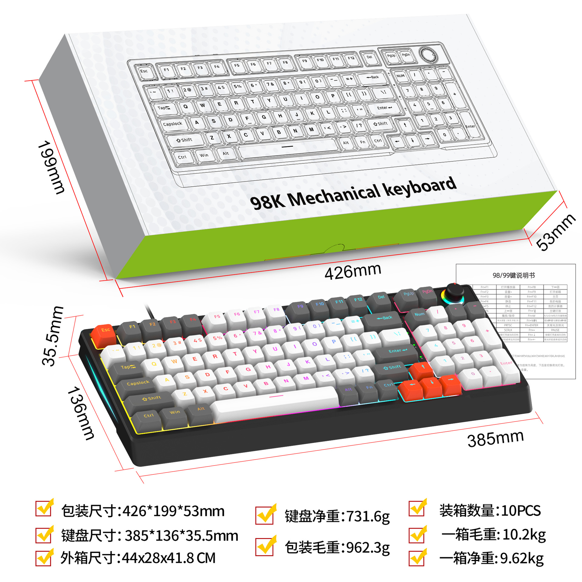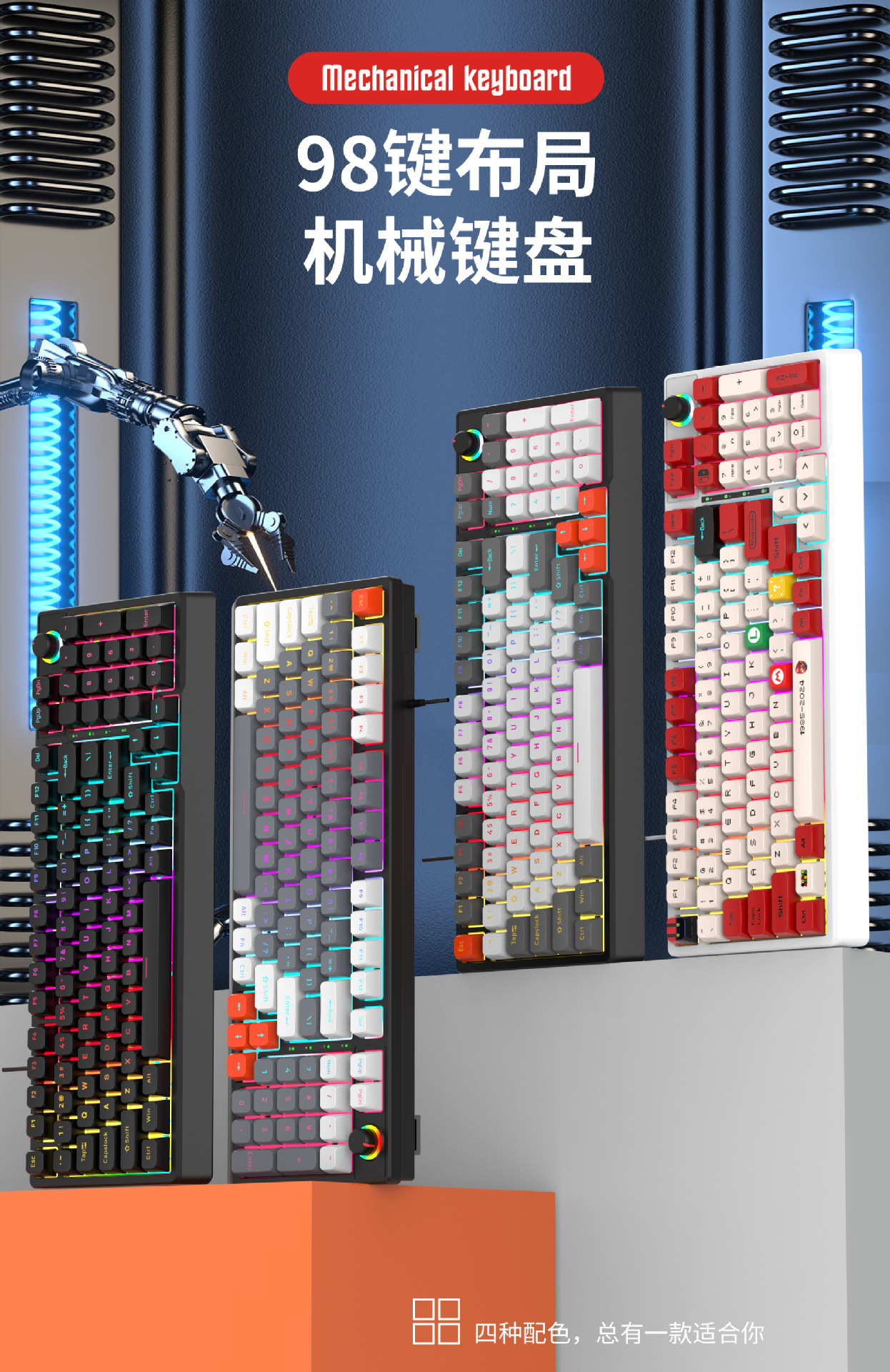 工厂现货K98真机械键盘 青轴红轴有线双色注塑热升华键帽游戏外设