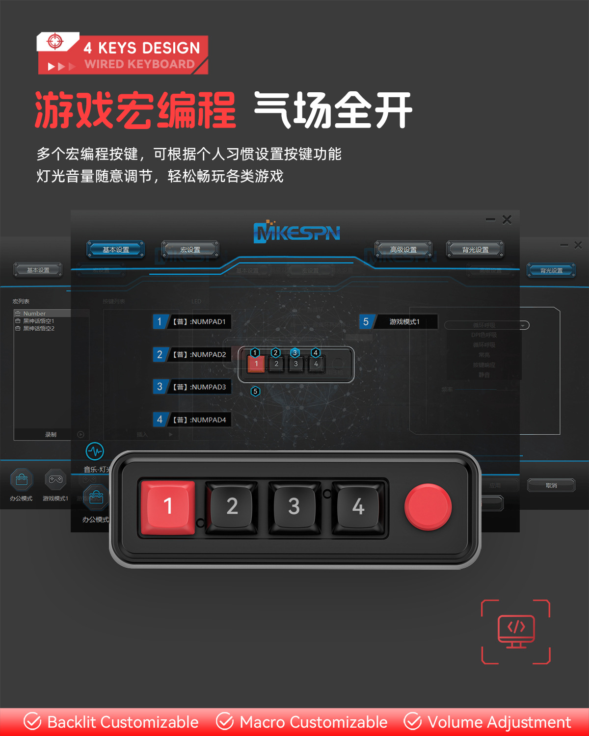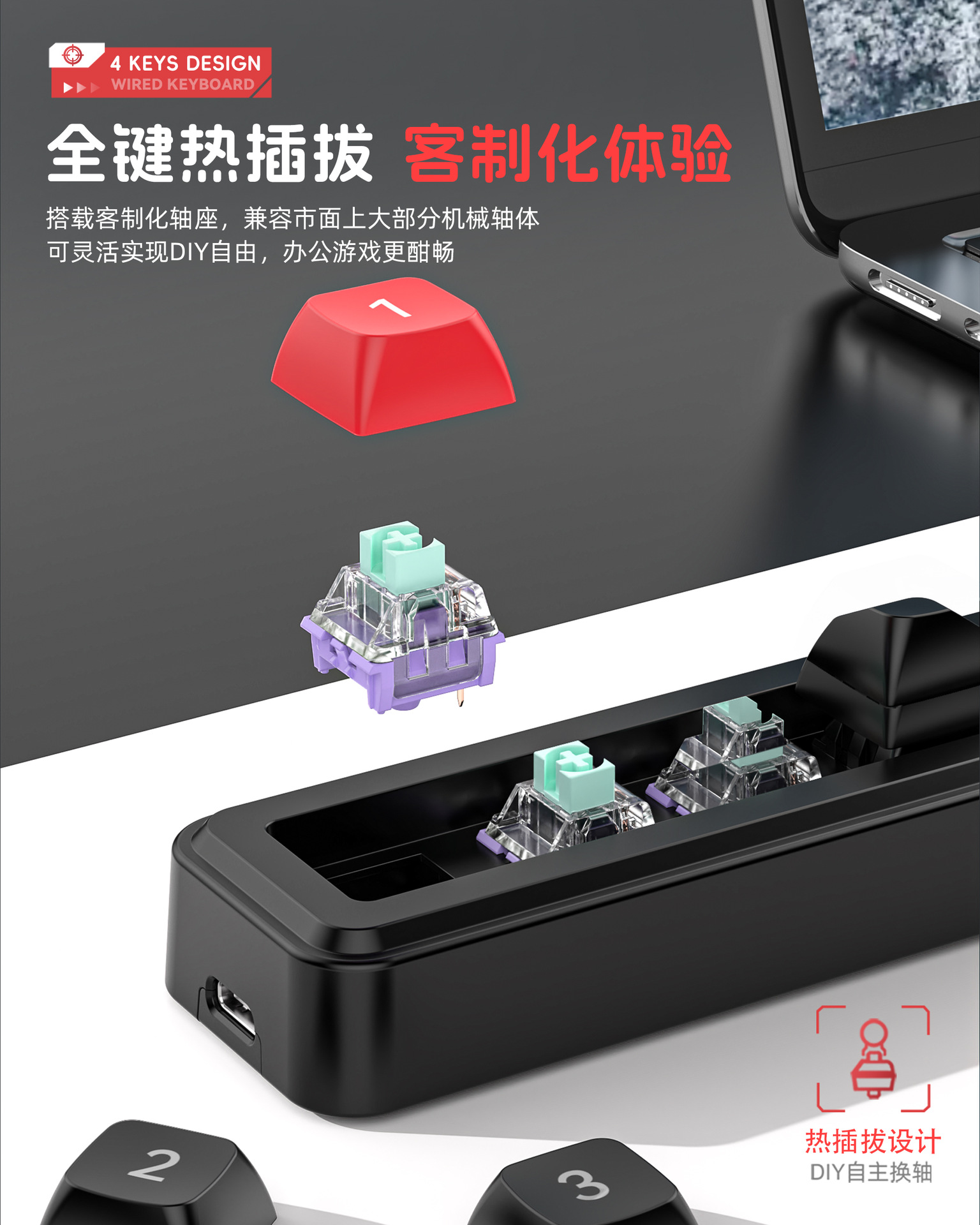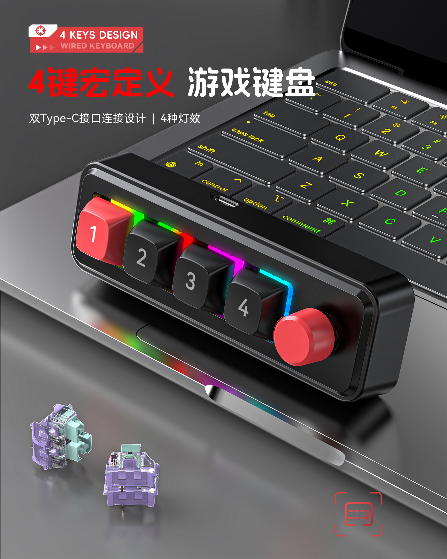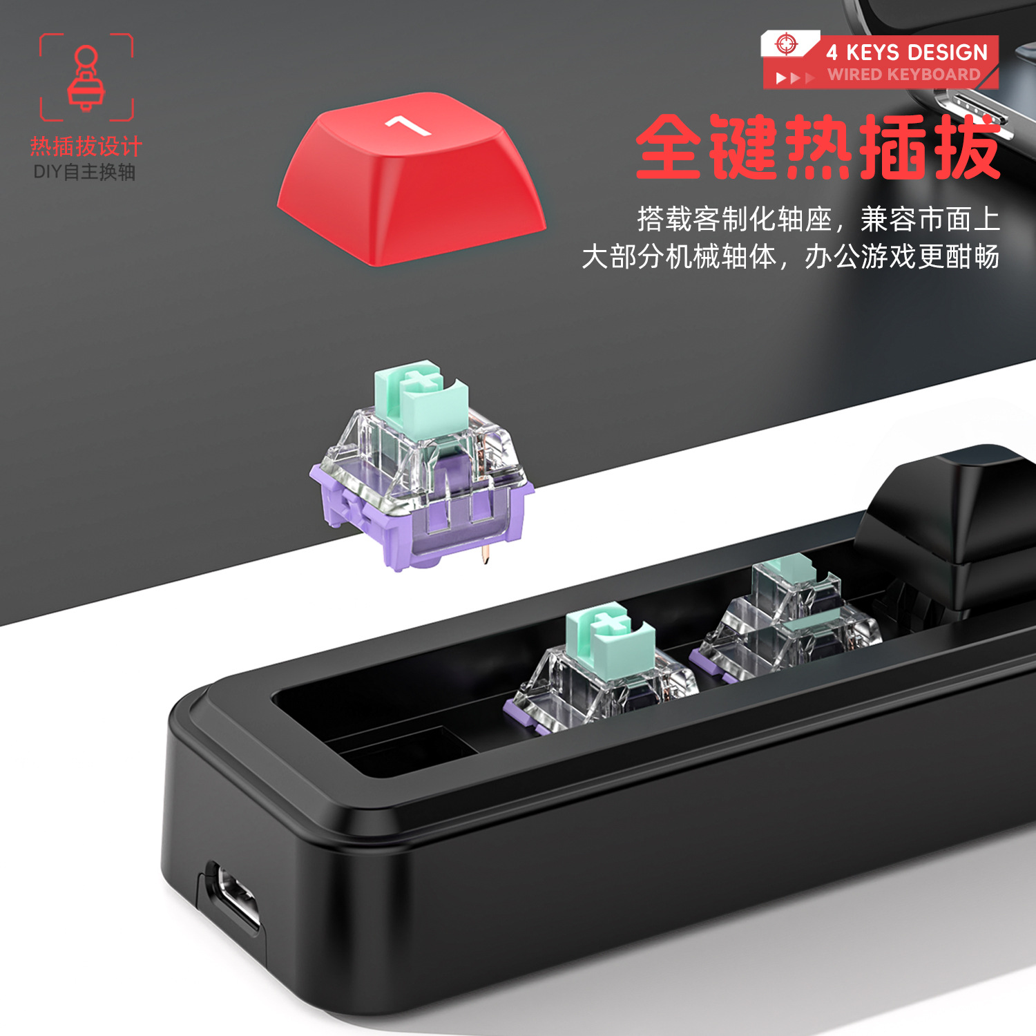 4键有线热插拔宏定义游戏机械小键盘源头厂家
