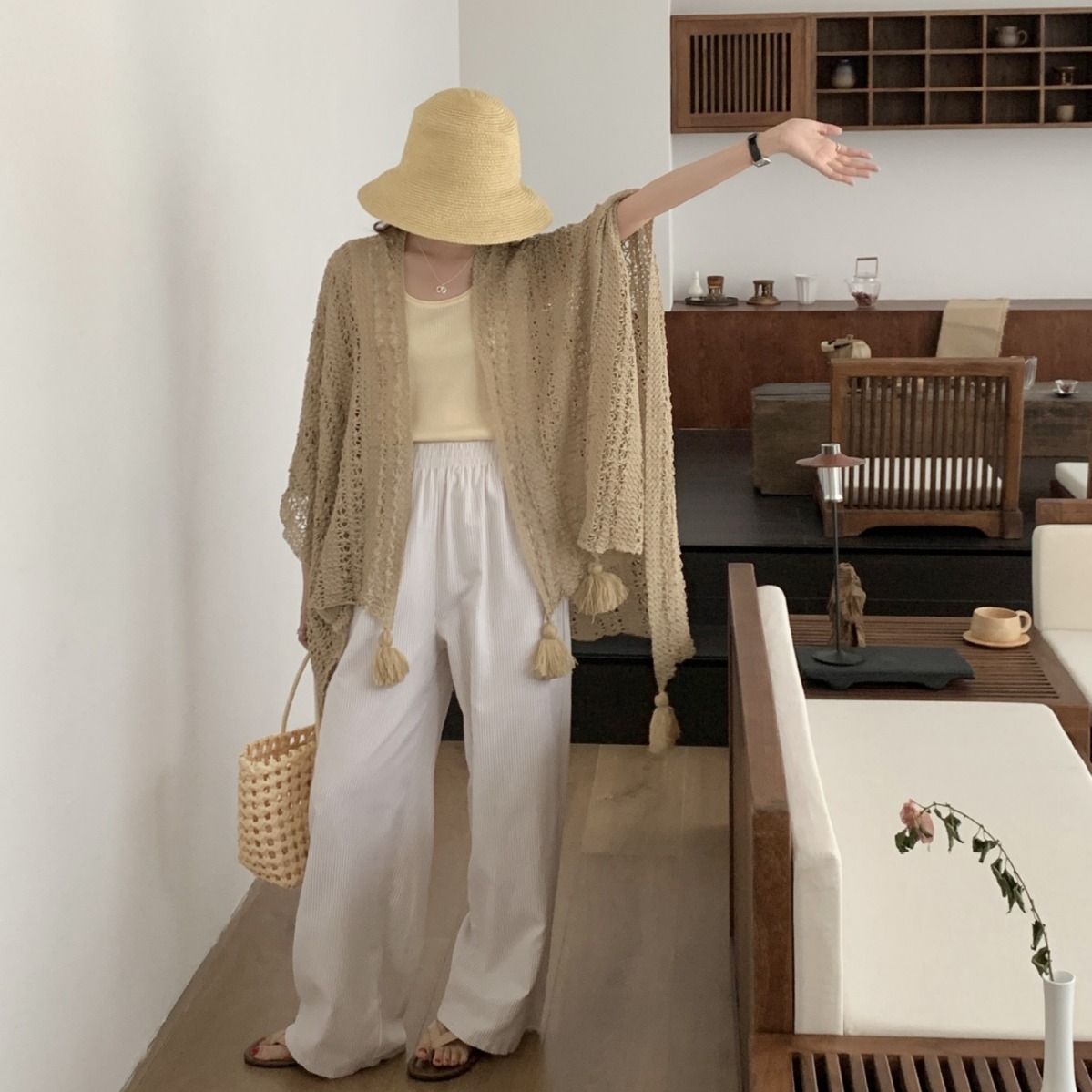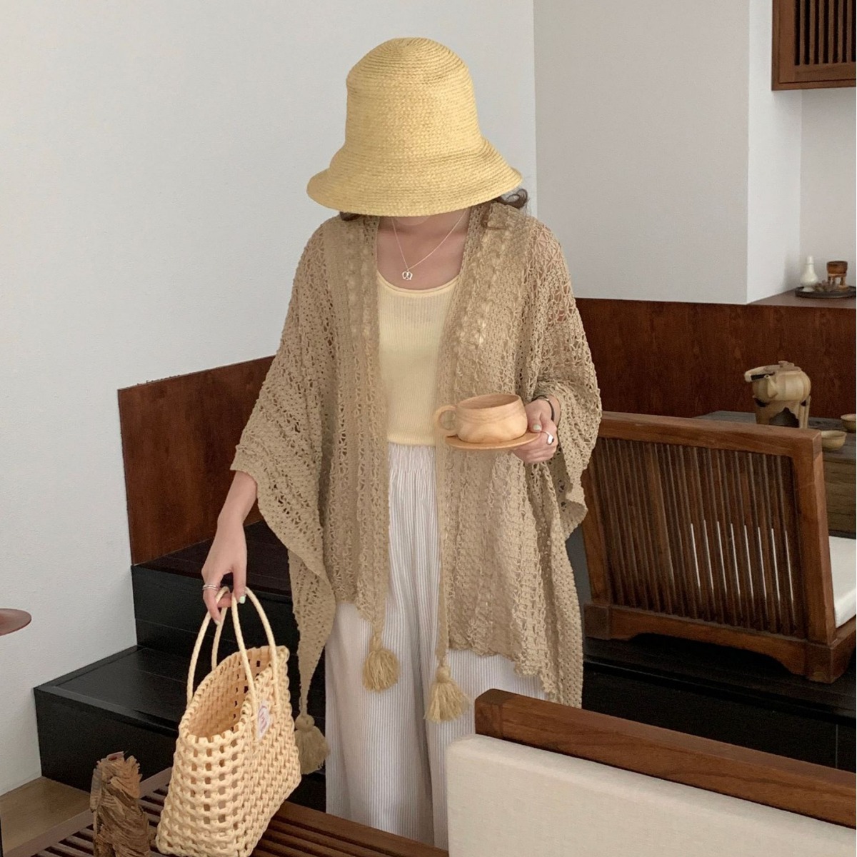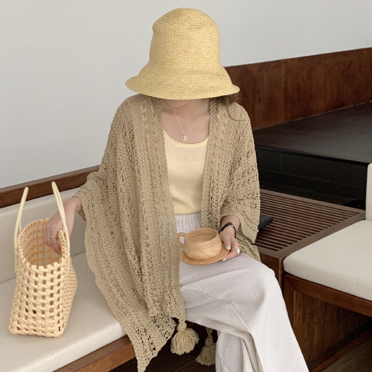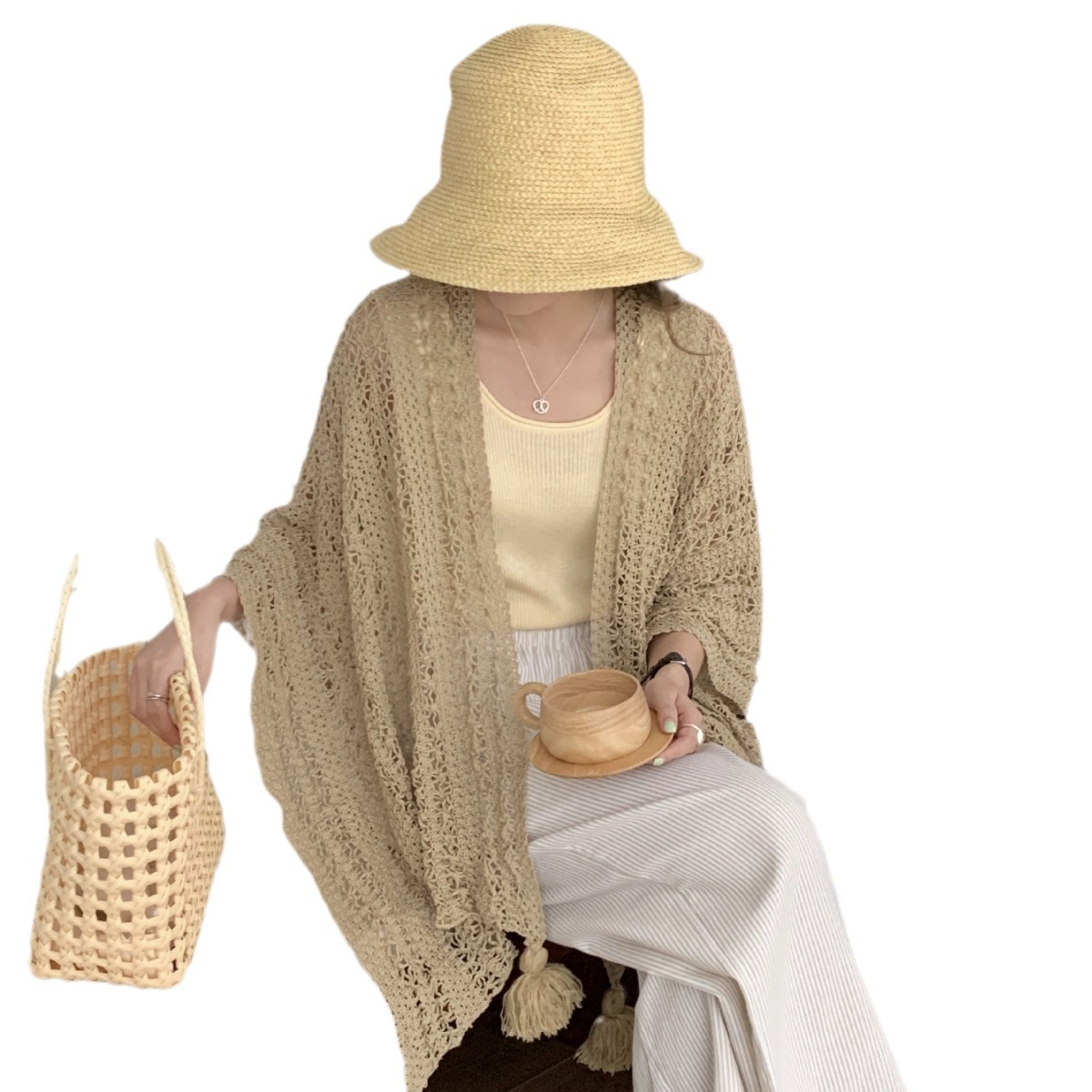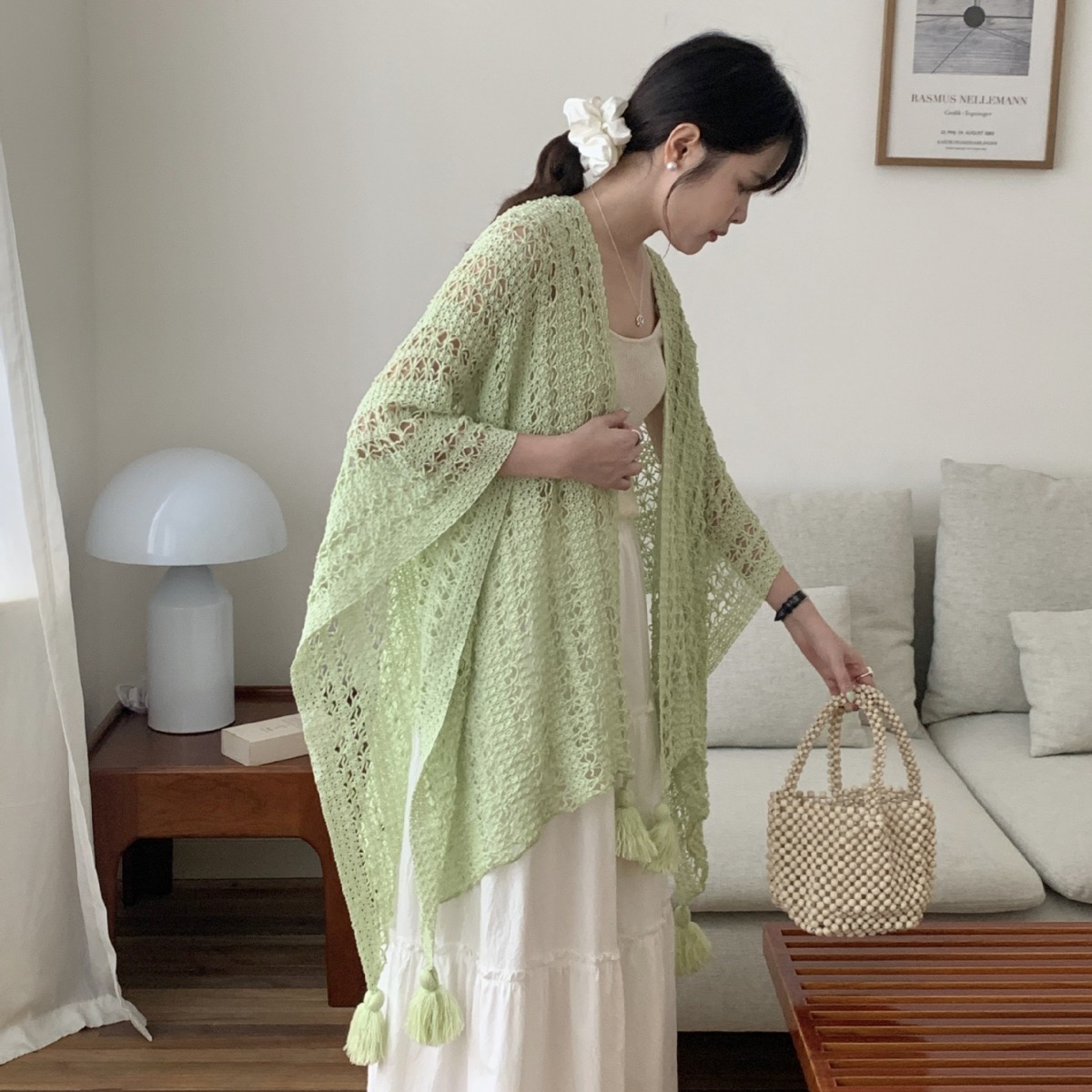 薄款防晒冰爽披肩纯色镂空网眼开衩流苏旅游韩系外搭斗篷冰感搭肩