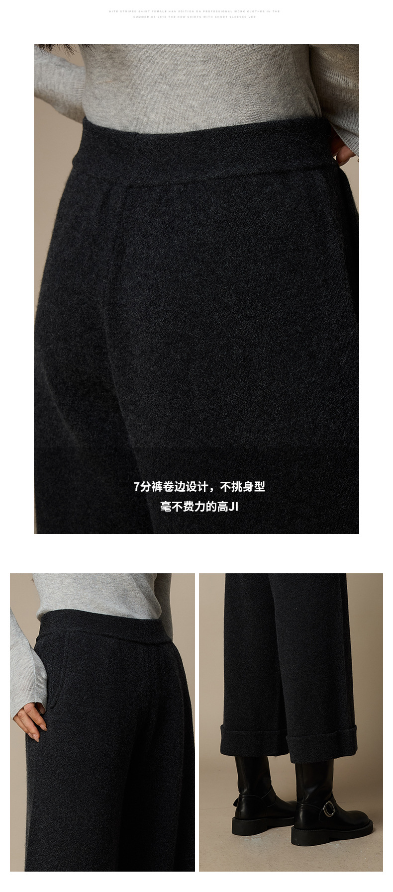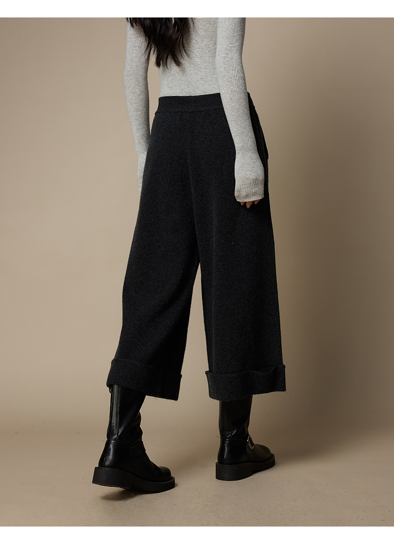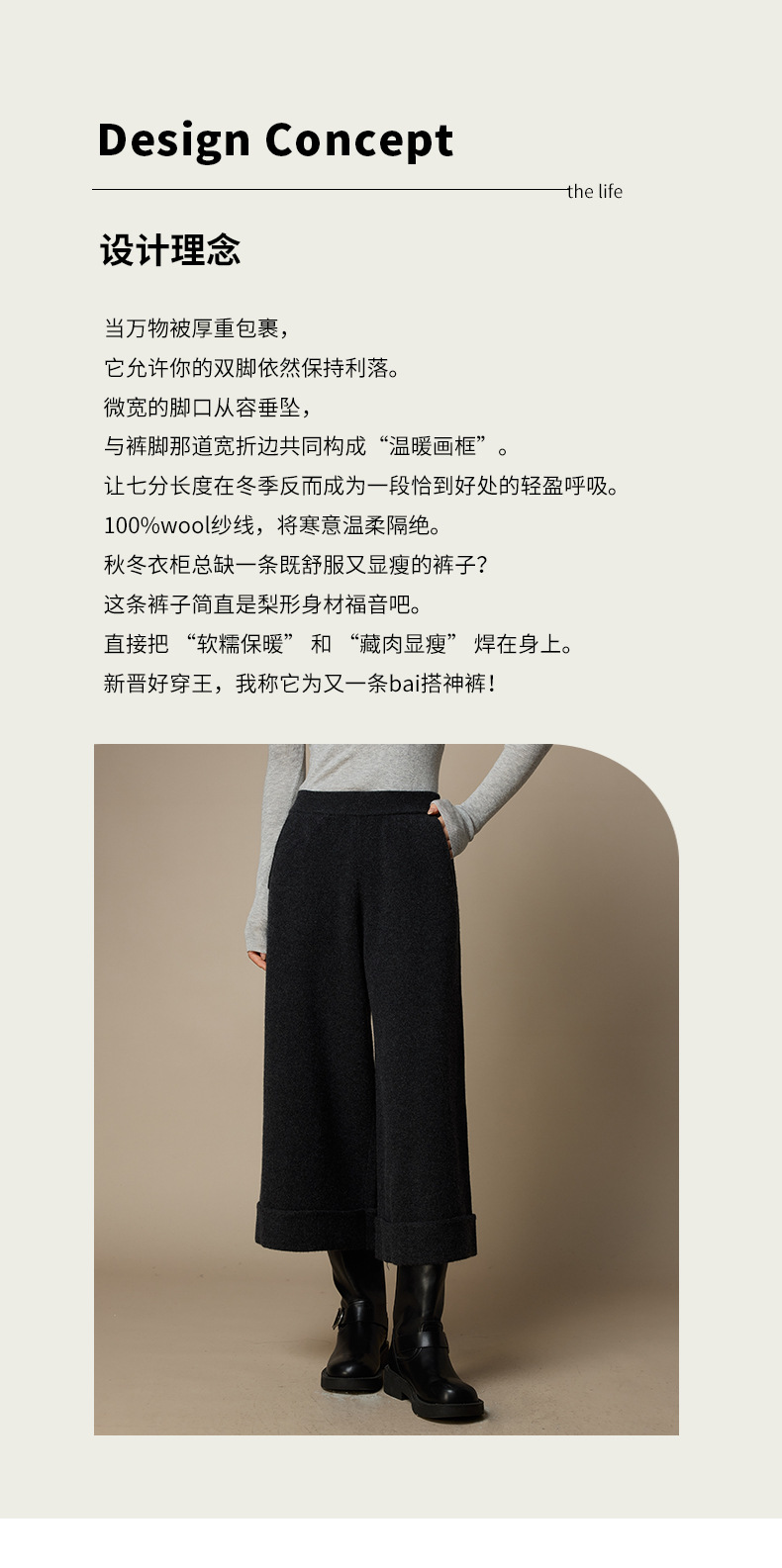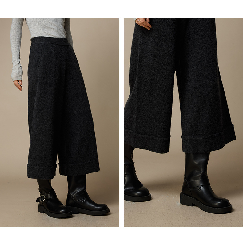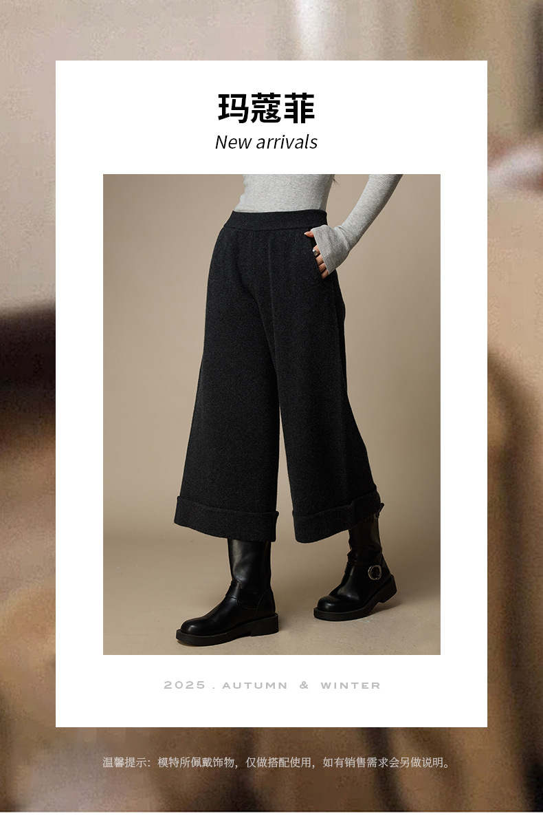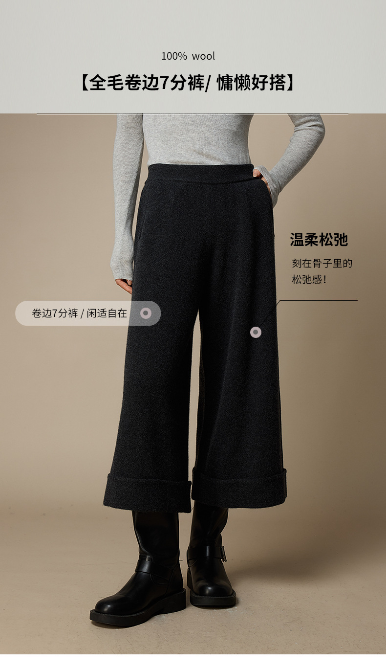 高级感100羊毛阔腿裤卷边直筒七分裤25新款冬季女装百搭厚款裤子
