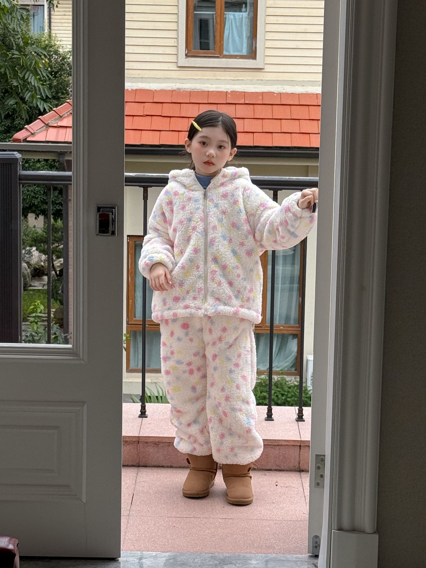 2025冬款女童彩色波点连帽睡衣睡裤羊羔绒加厚法兰绒家居服套装
