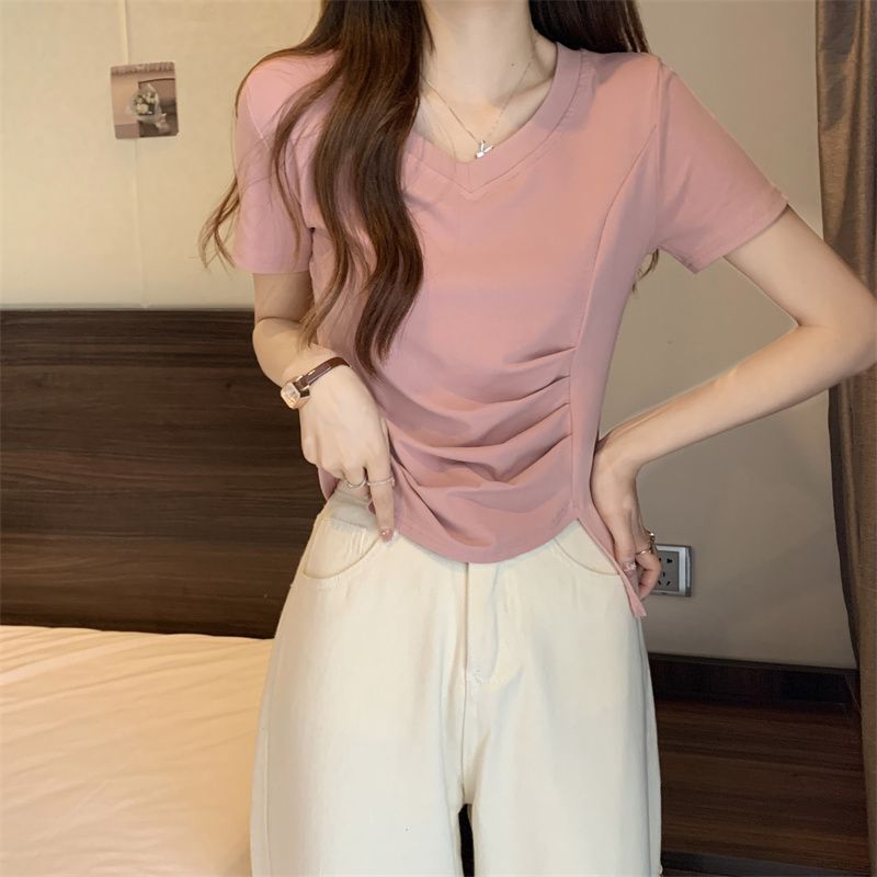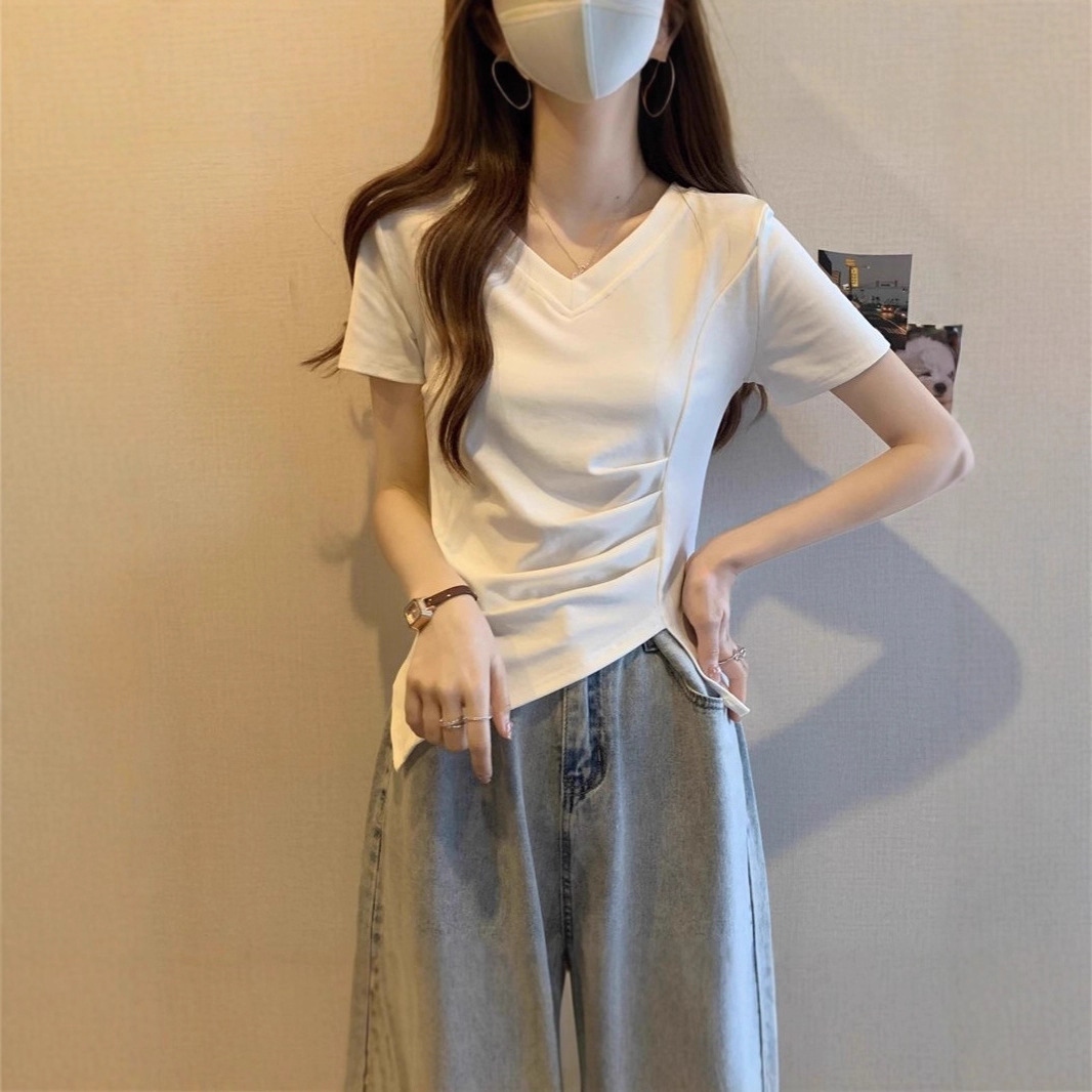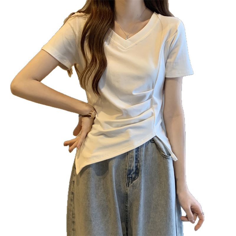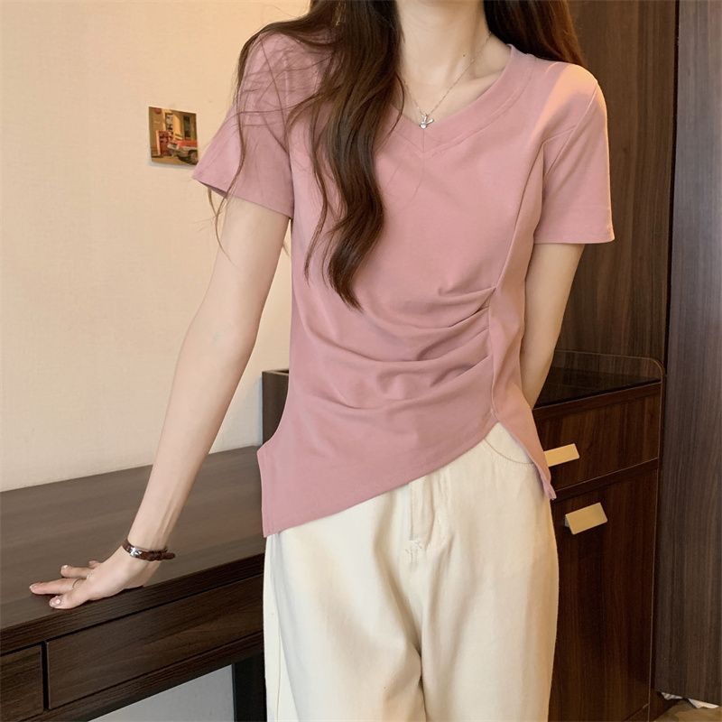 大码女装遮肚子正肩短袖t恤夏季2025新款胖mm设计感不规则v领上衣