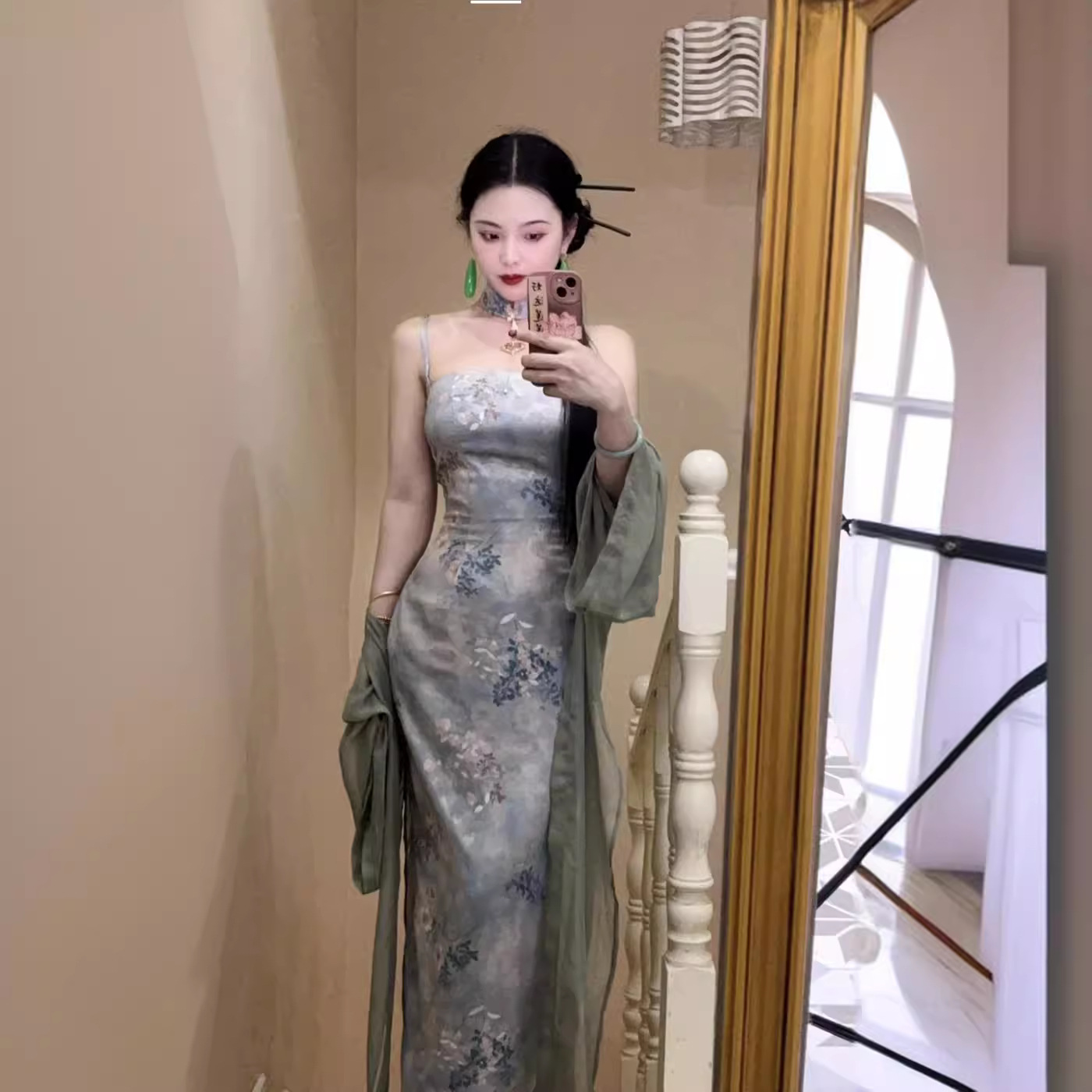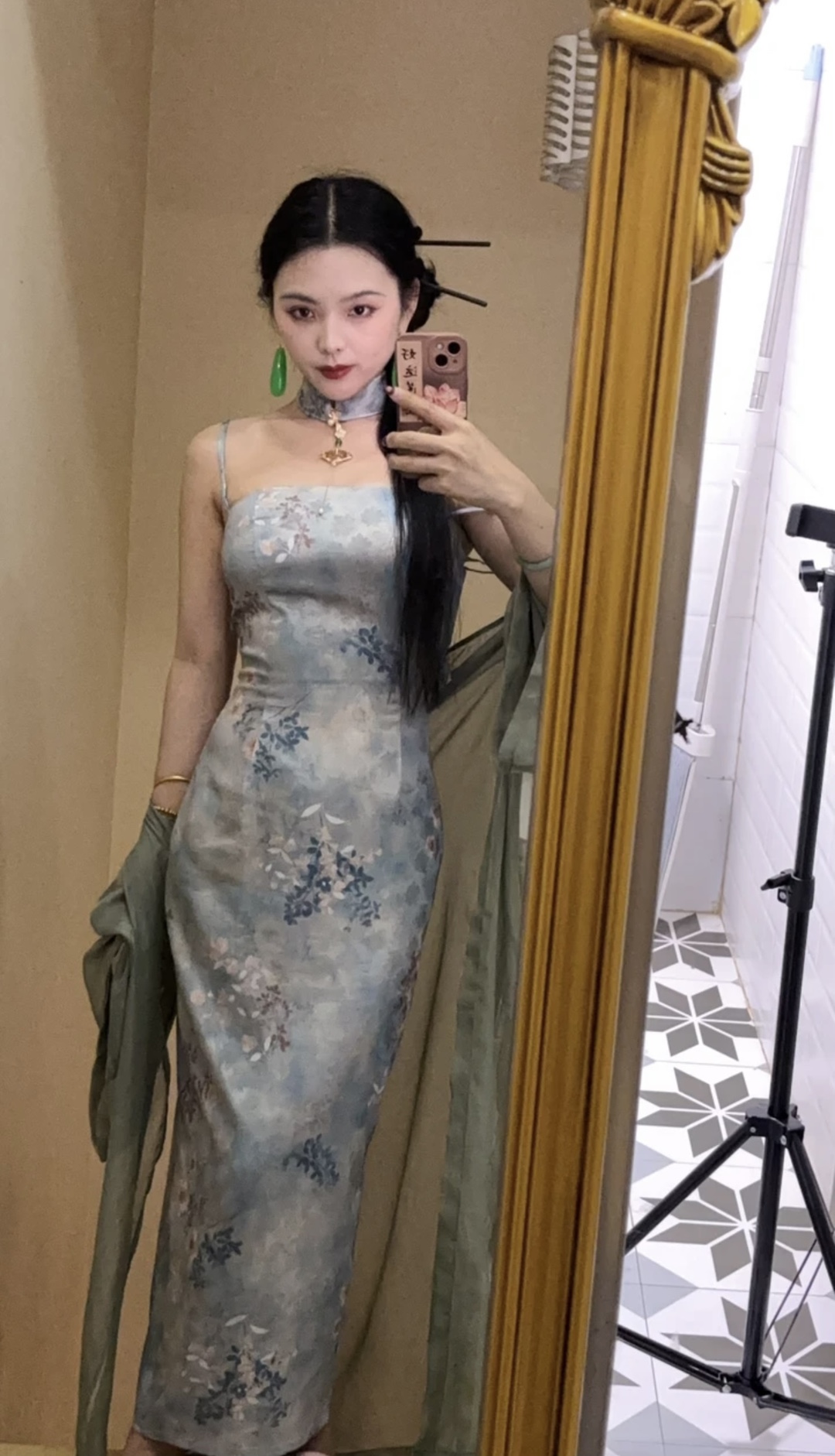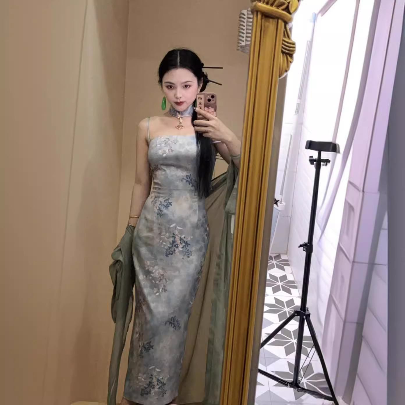 画报夫人 自制新中式国风素雅温柔清冷吊带连衣裙 蓝木桥吊带