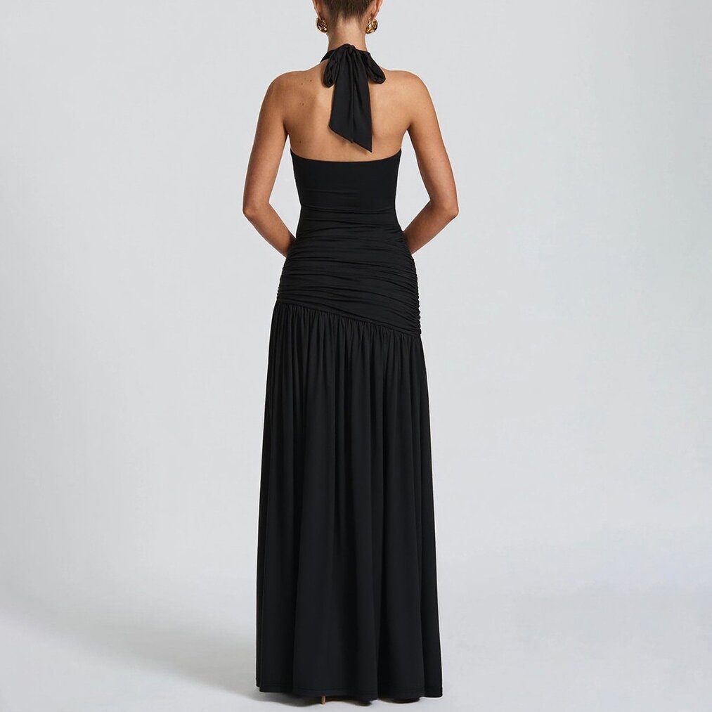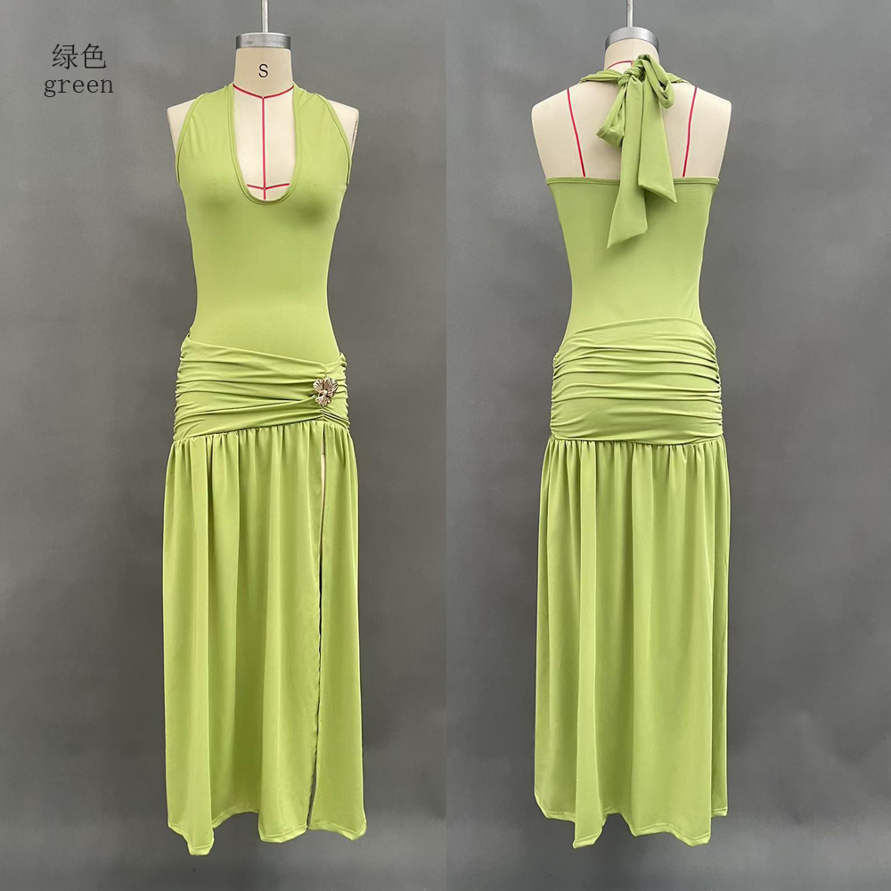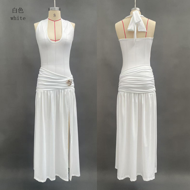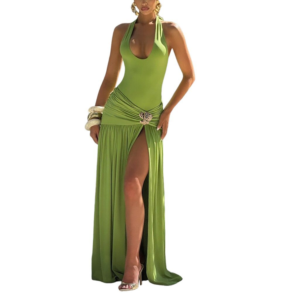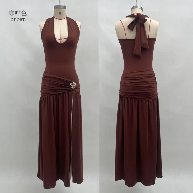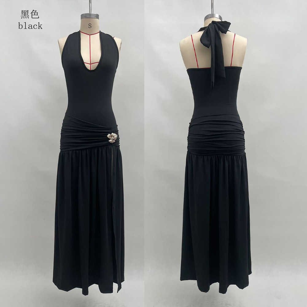 独立站跨境欧美女装夏季新款挂脖露背修身纯色开叉连衣裙性感长裙
