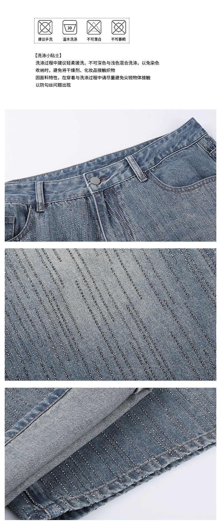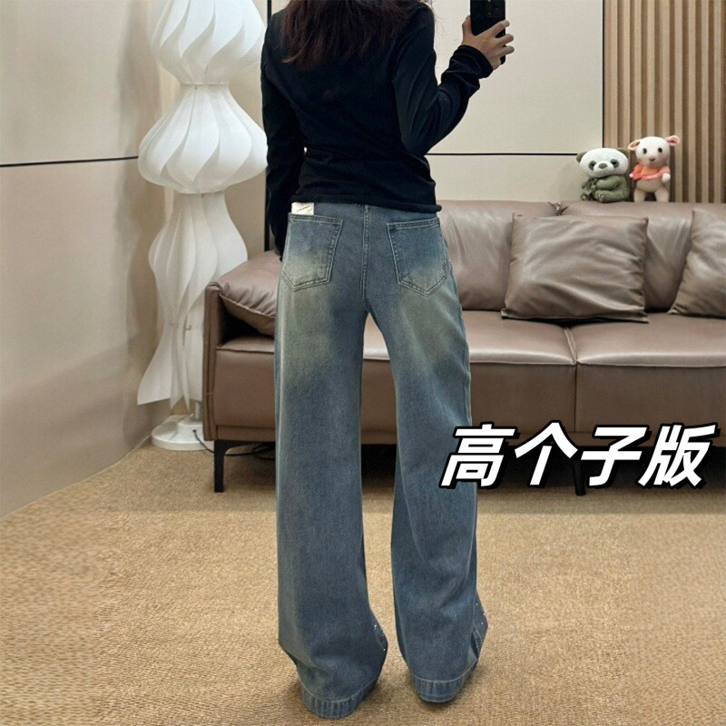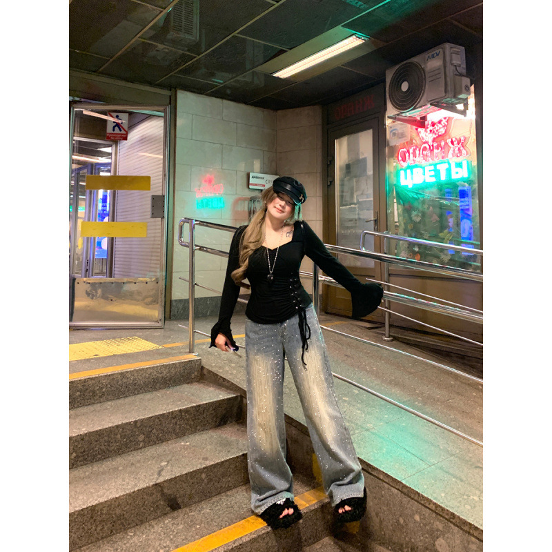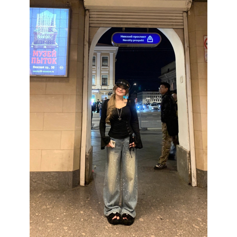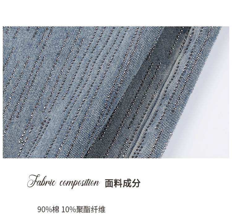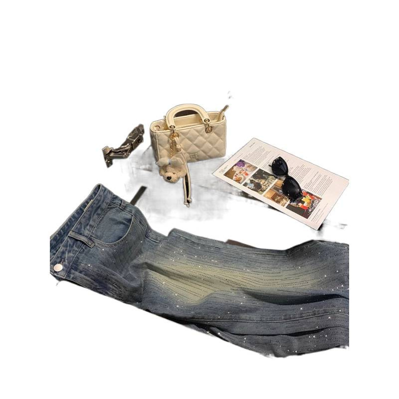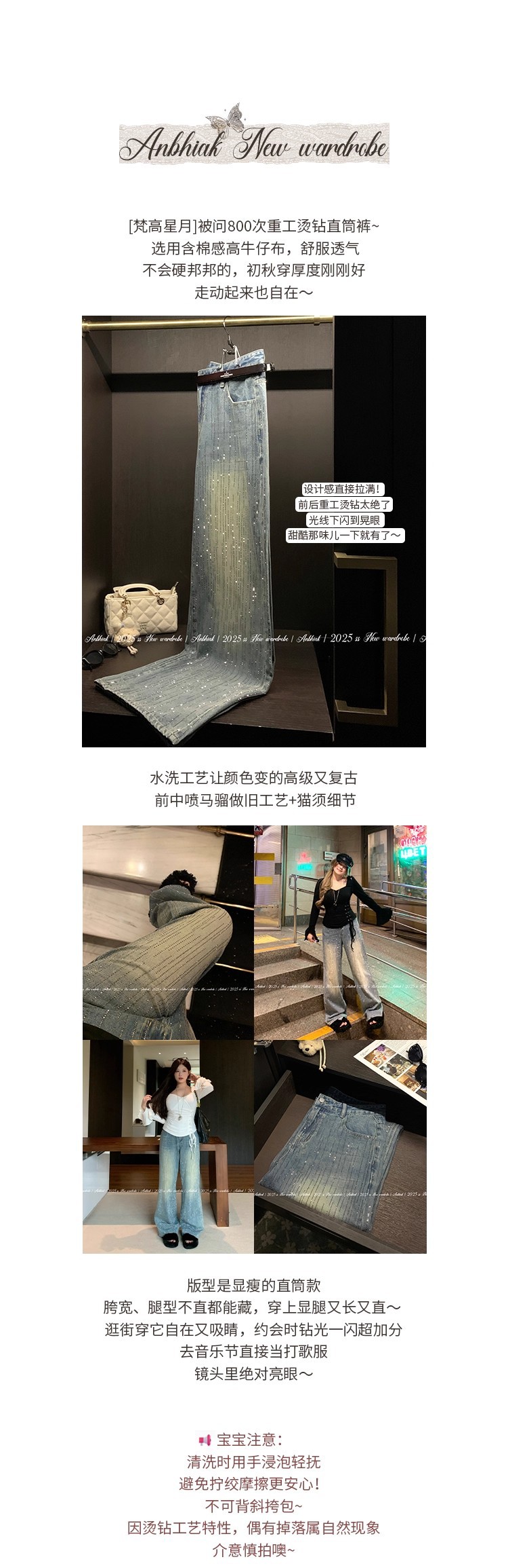 安妮不火梵高星月遮胯显腿长阔腿牛仔裤女微胖大码重工烫钻牛仔裤