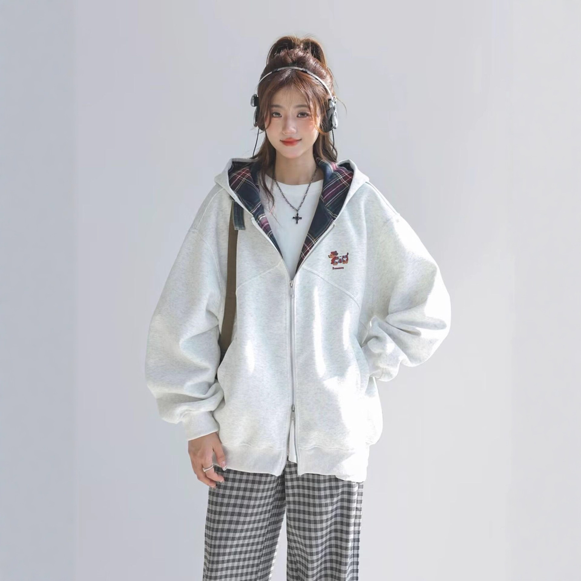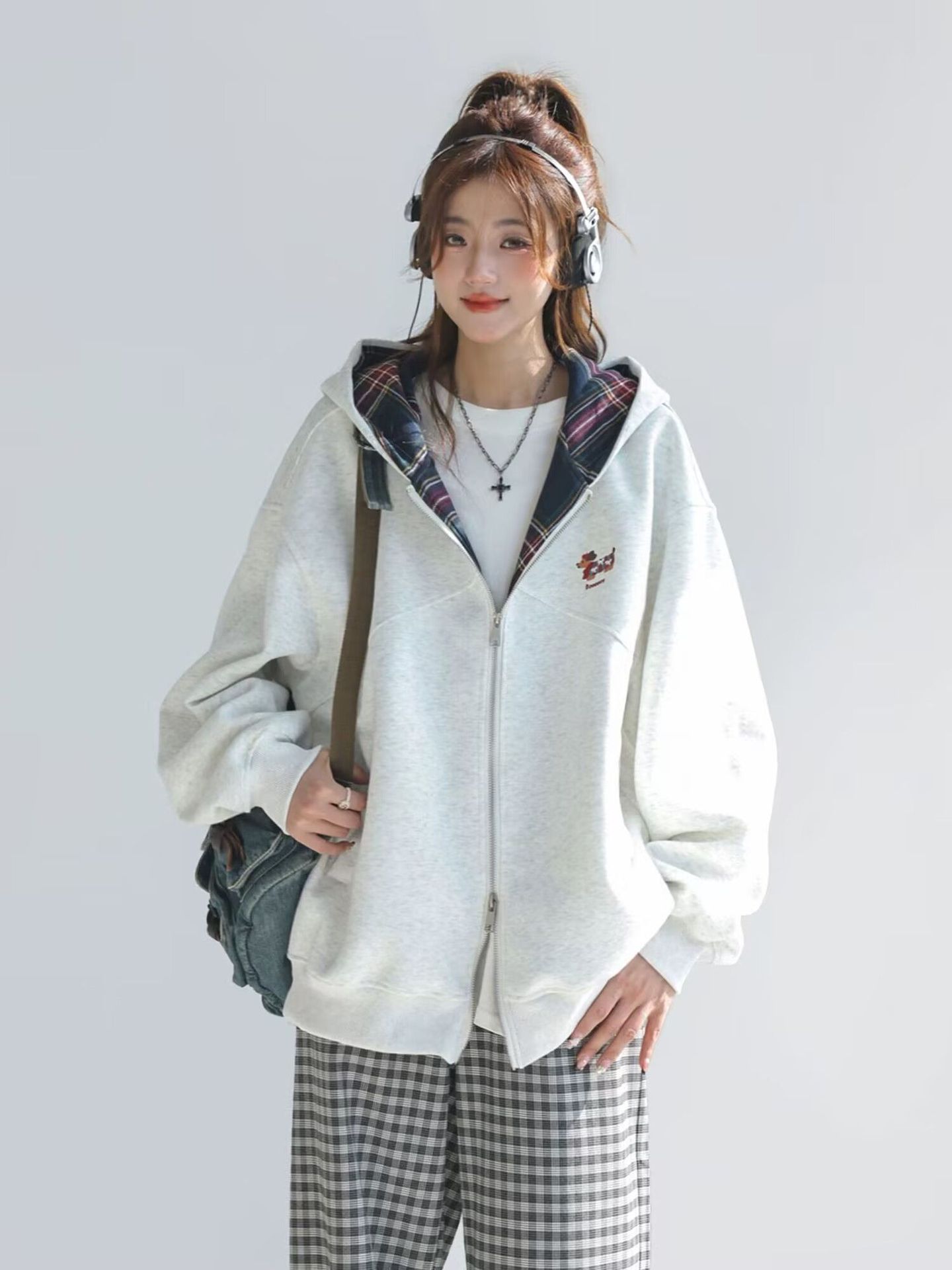 韩系格子长袖连帽外套女2025秋季新款学院风拼接刺绣宽松卫衣开衫
