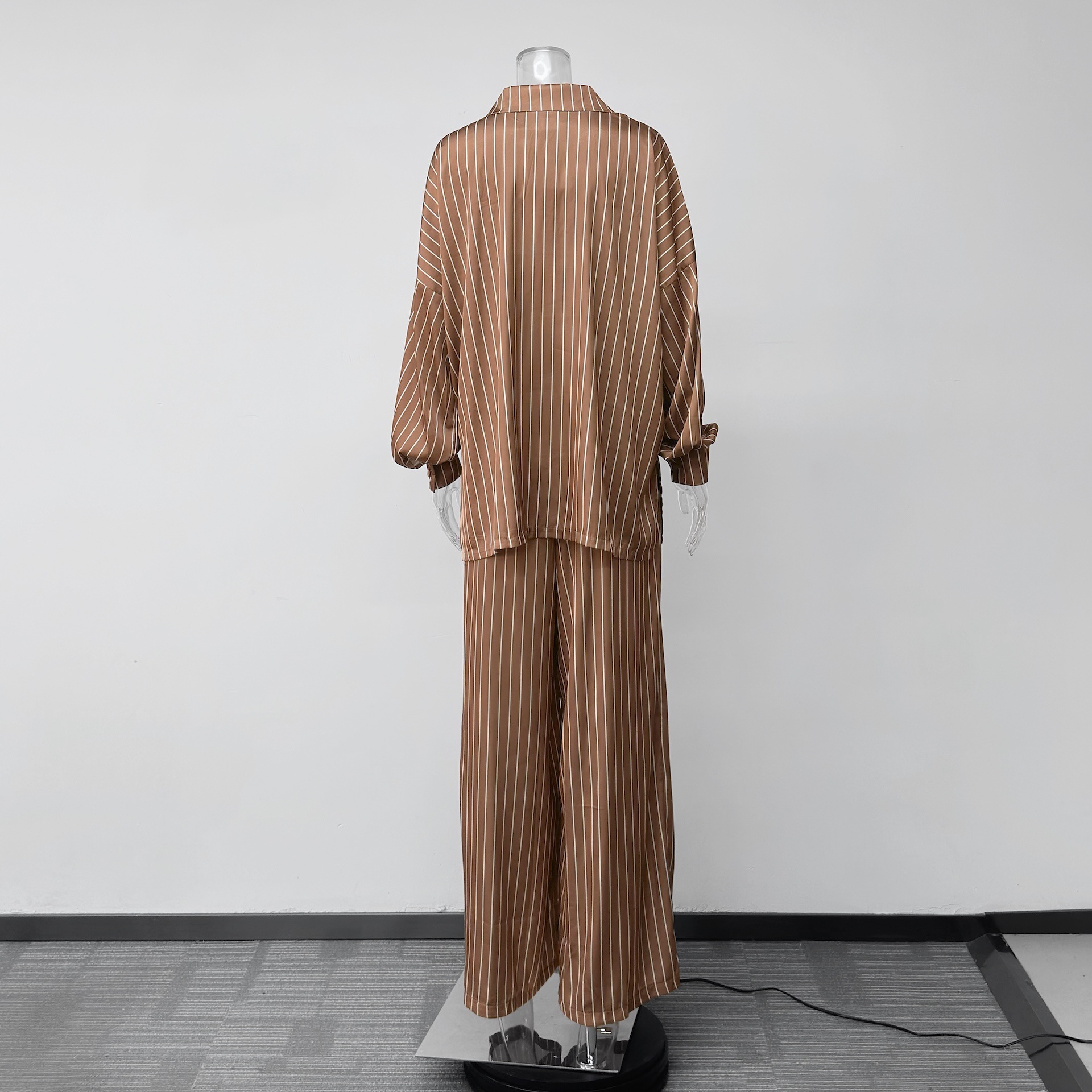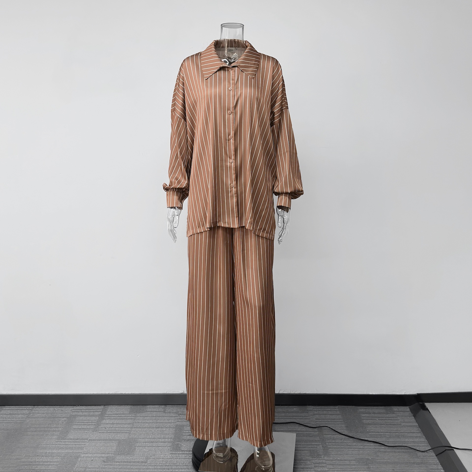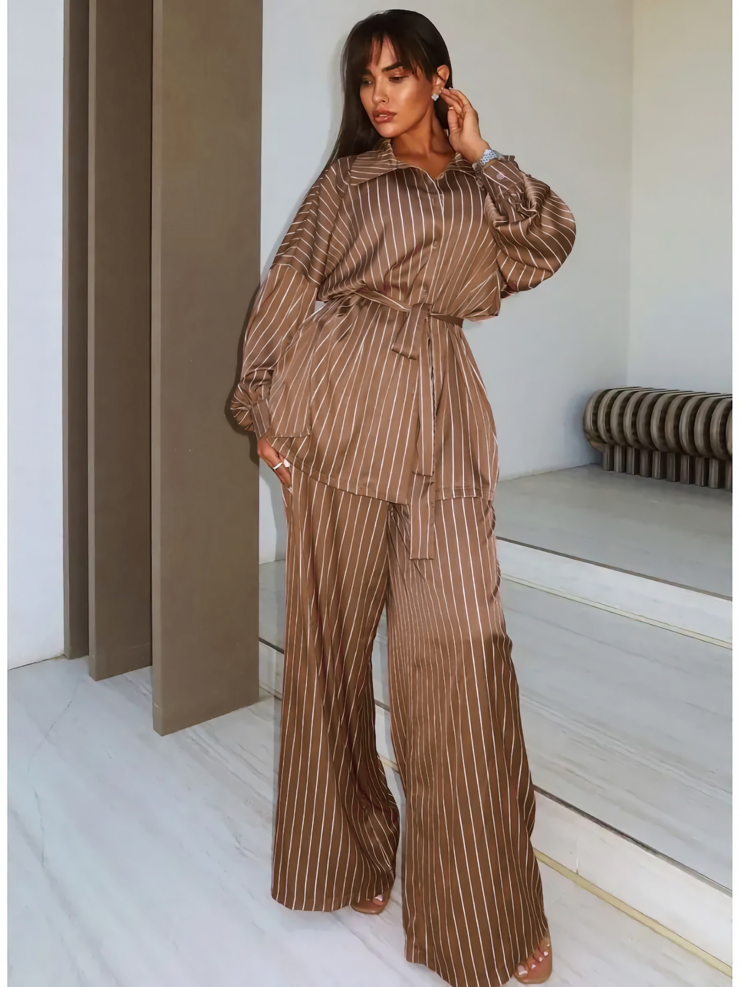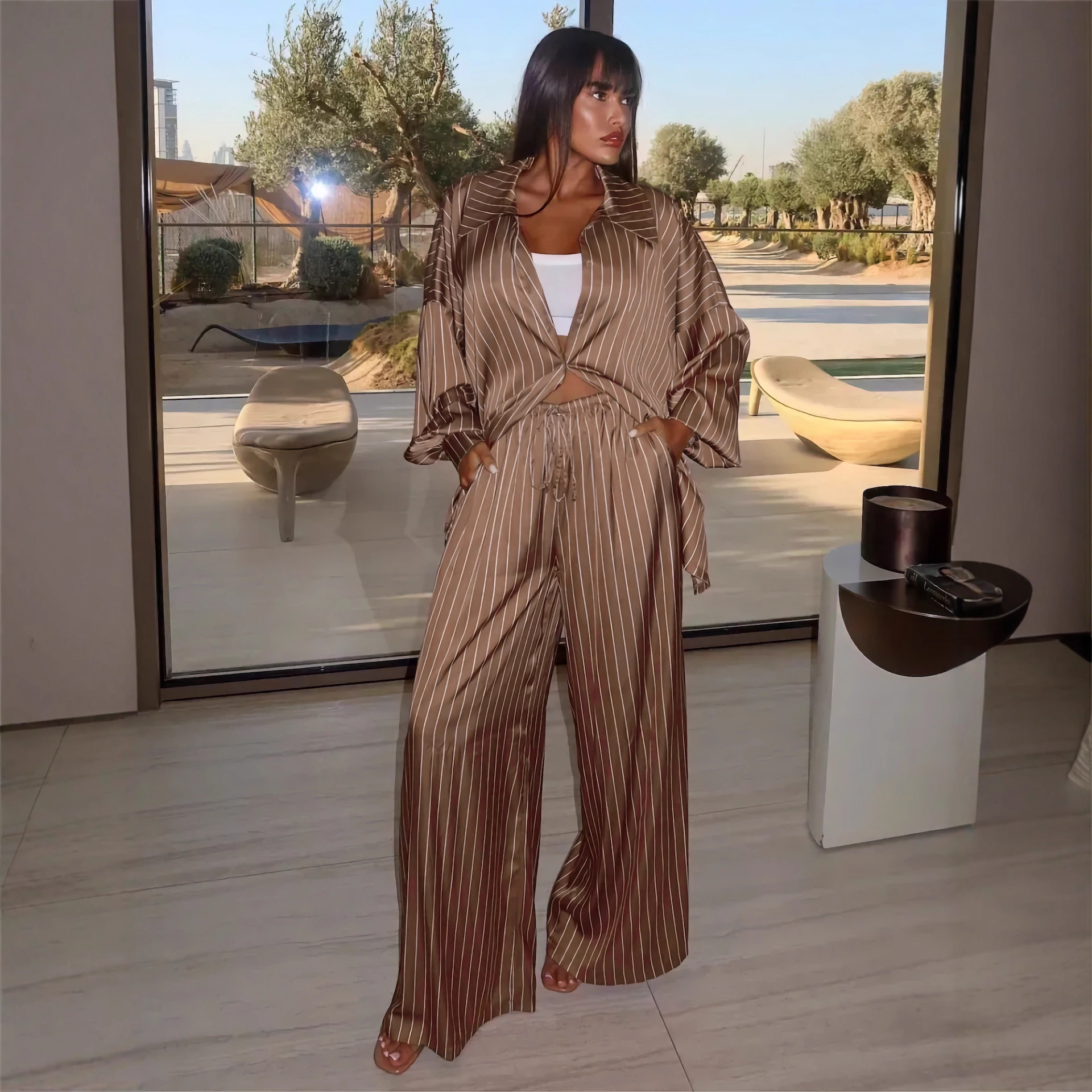 欧美亚马逊跨境2026新款时尚女装休闲家居舒适条纹开衫长裤套装女