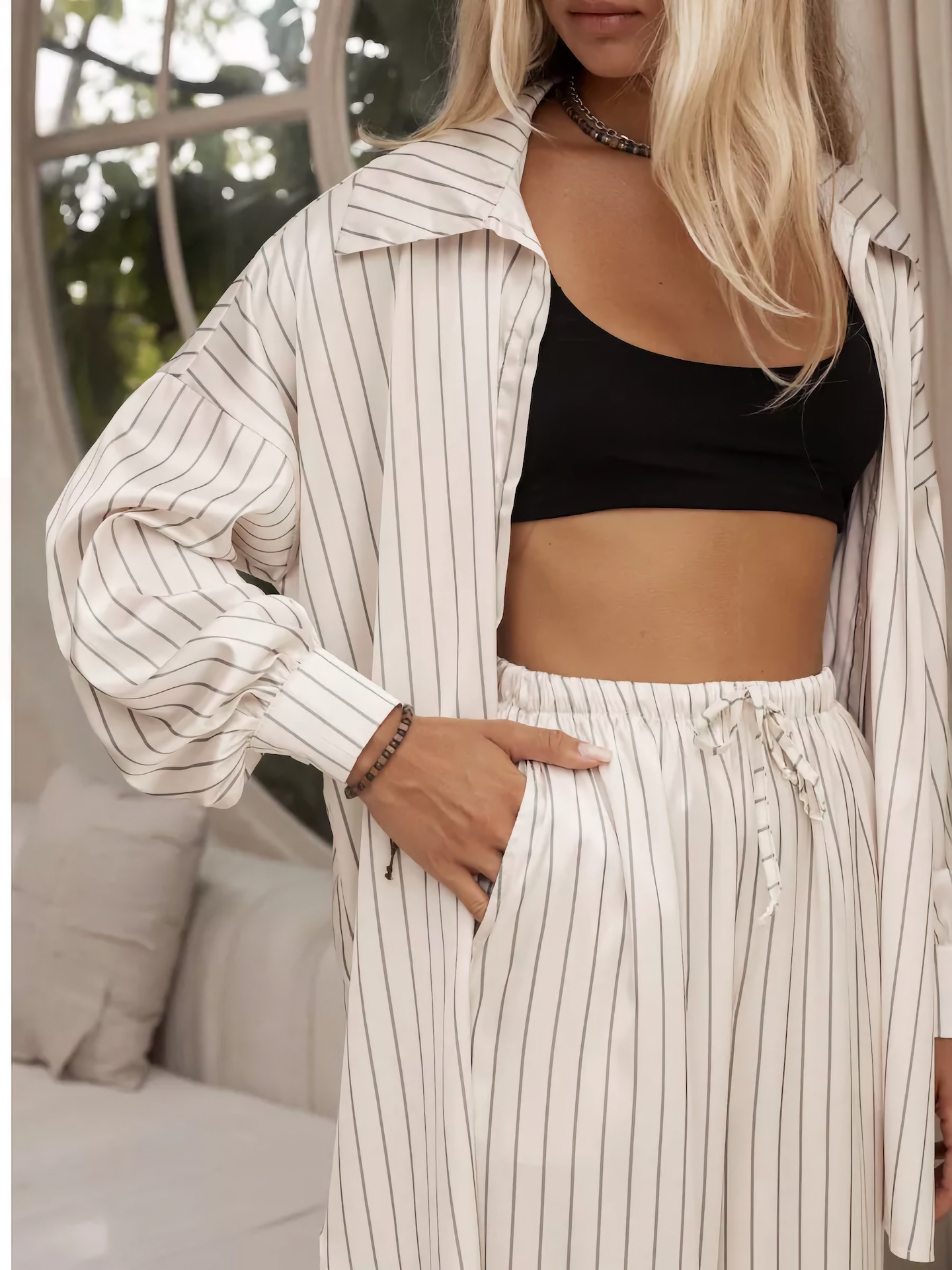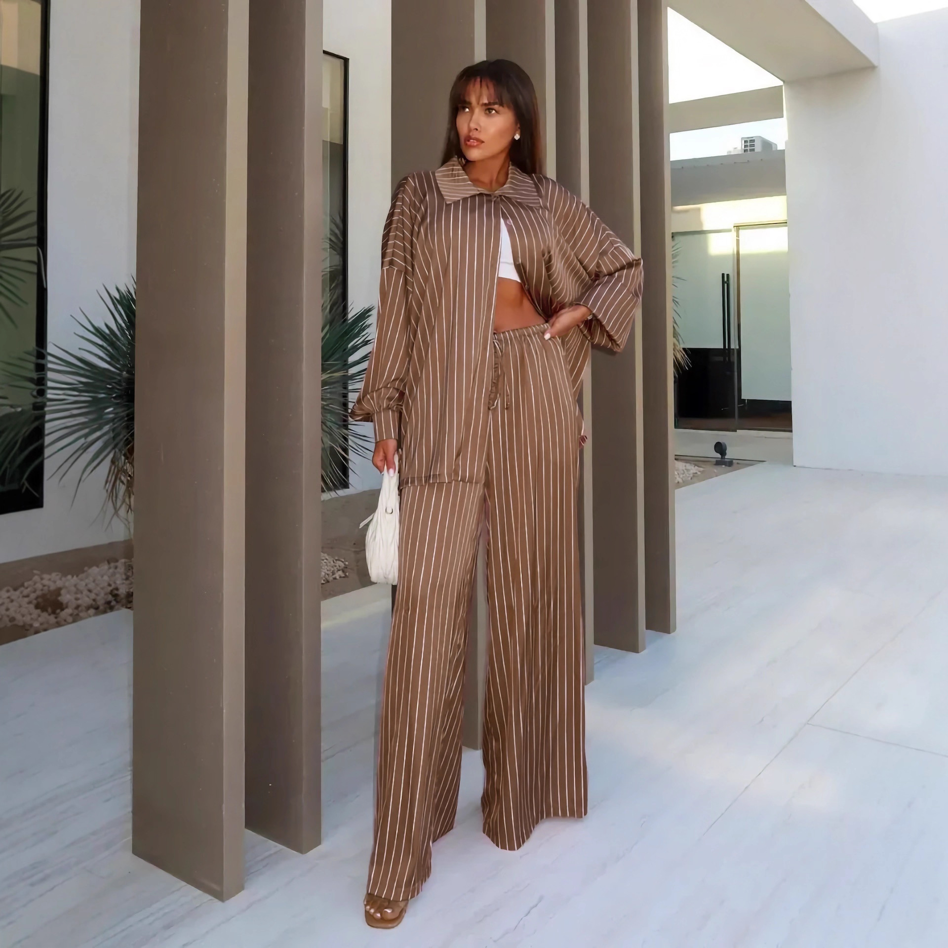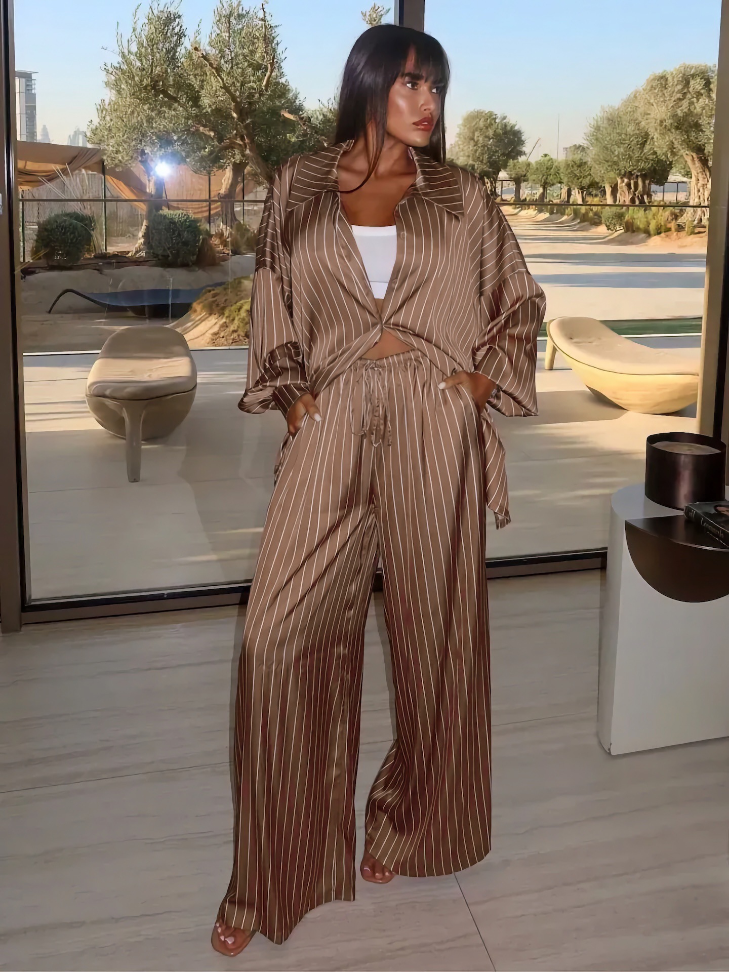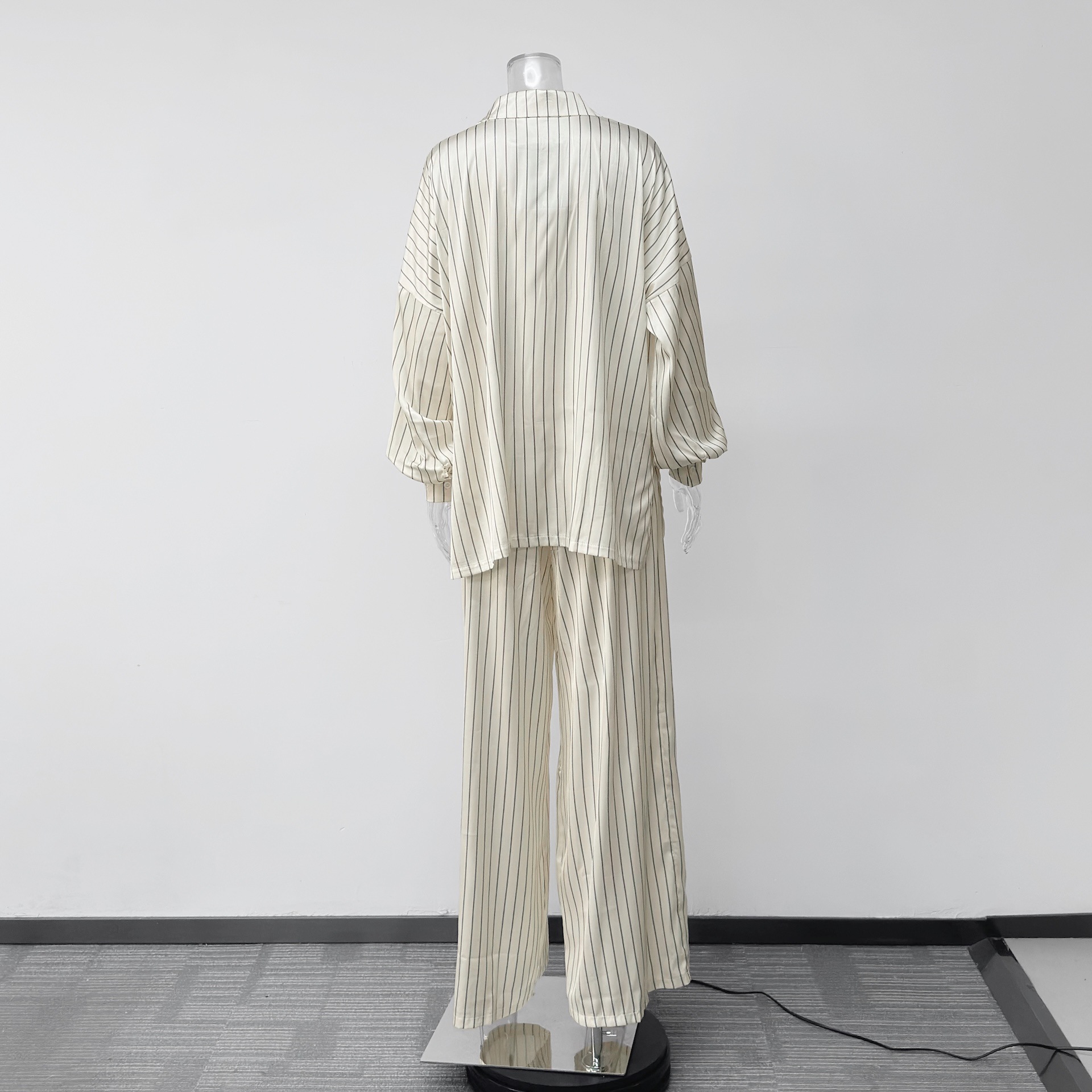 欧美亚马逊跨境2026新款时尚女装休闲家居舒适条纹开衫长裤套装女