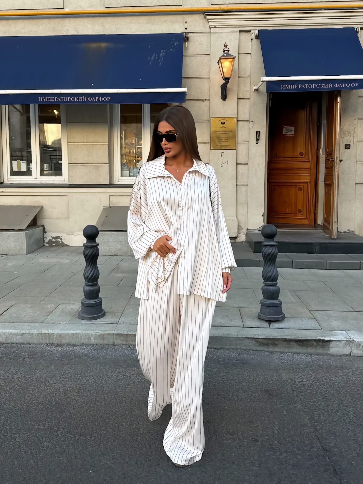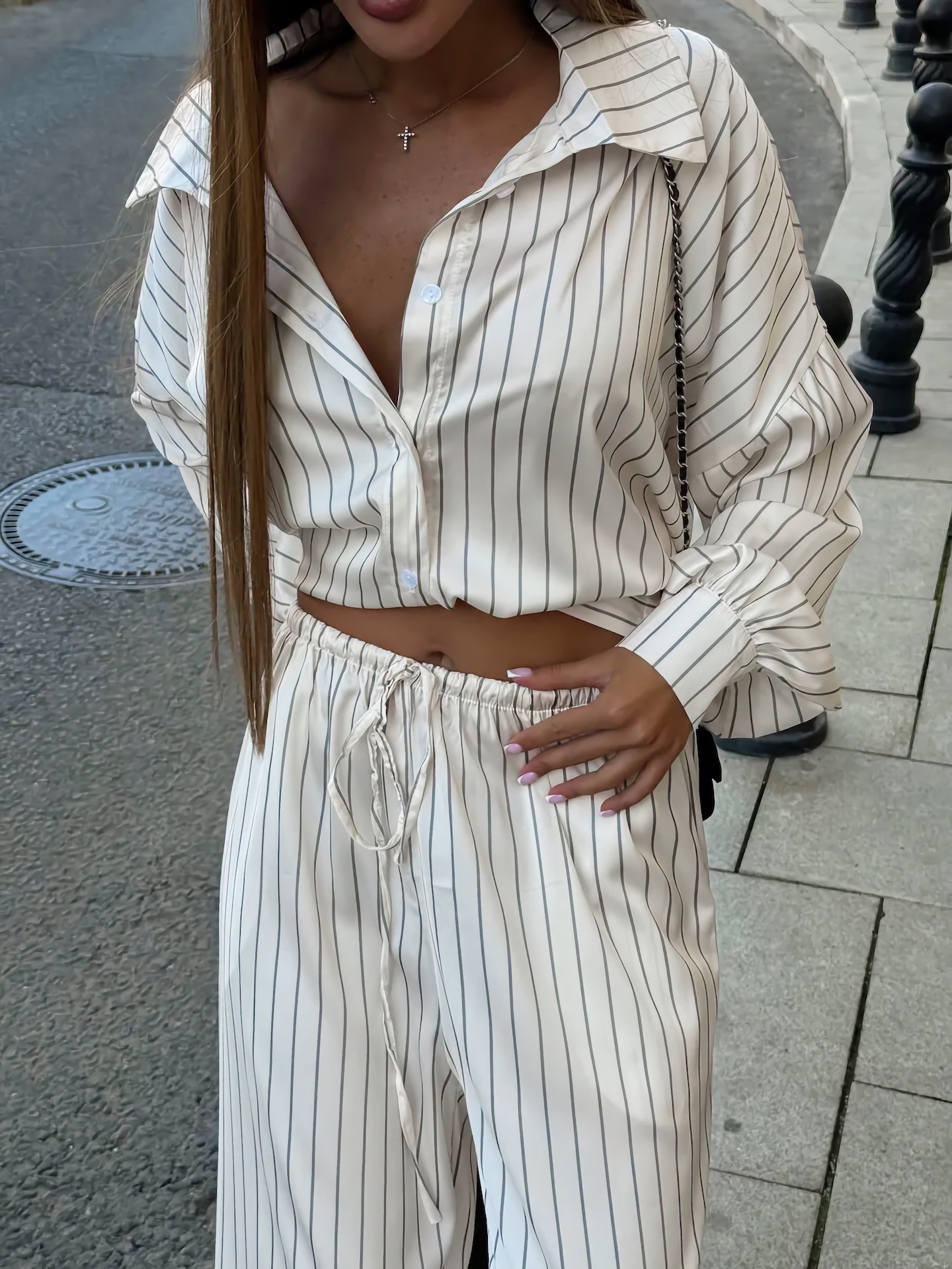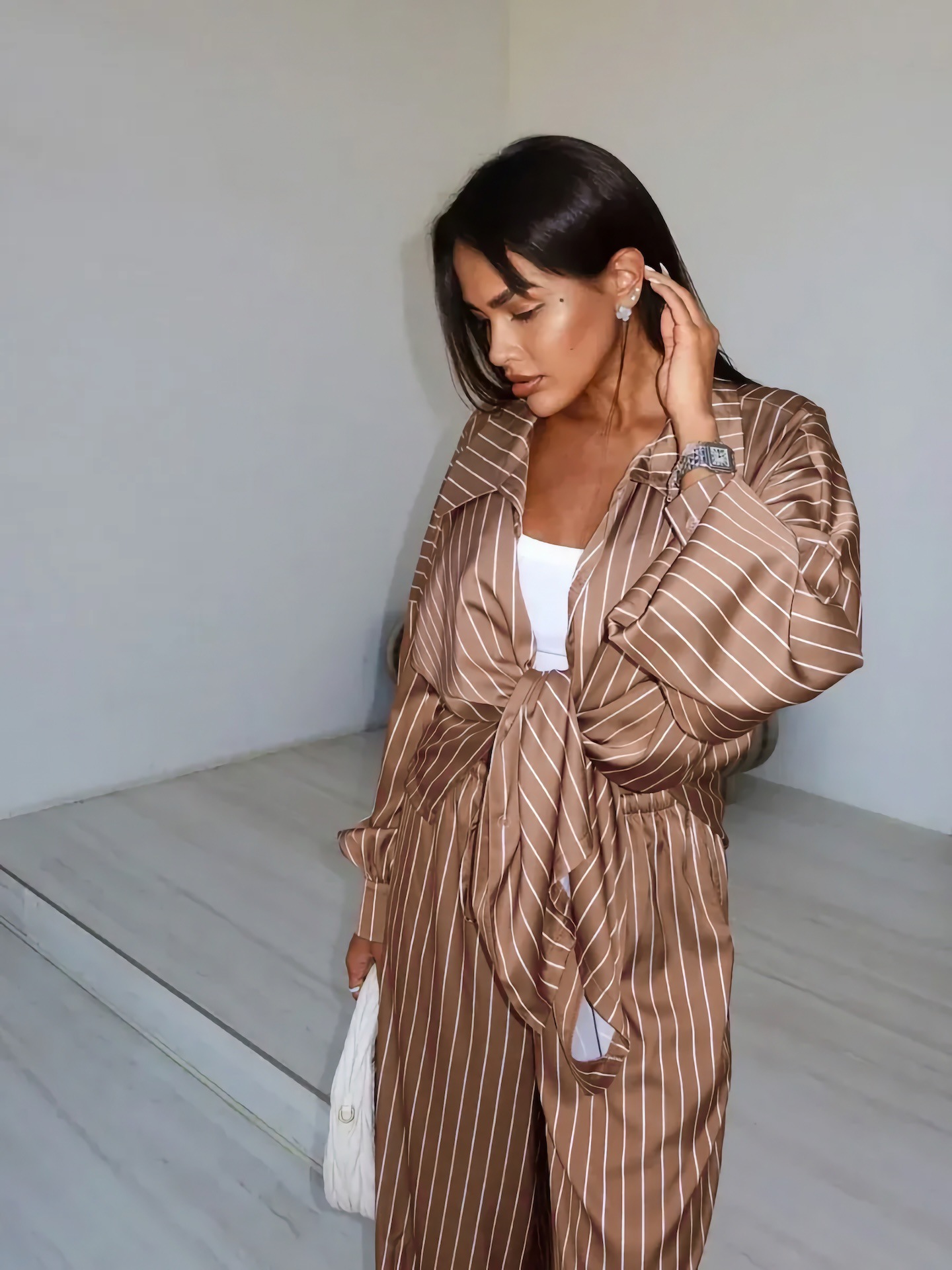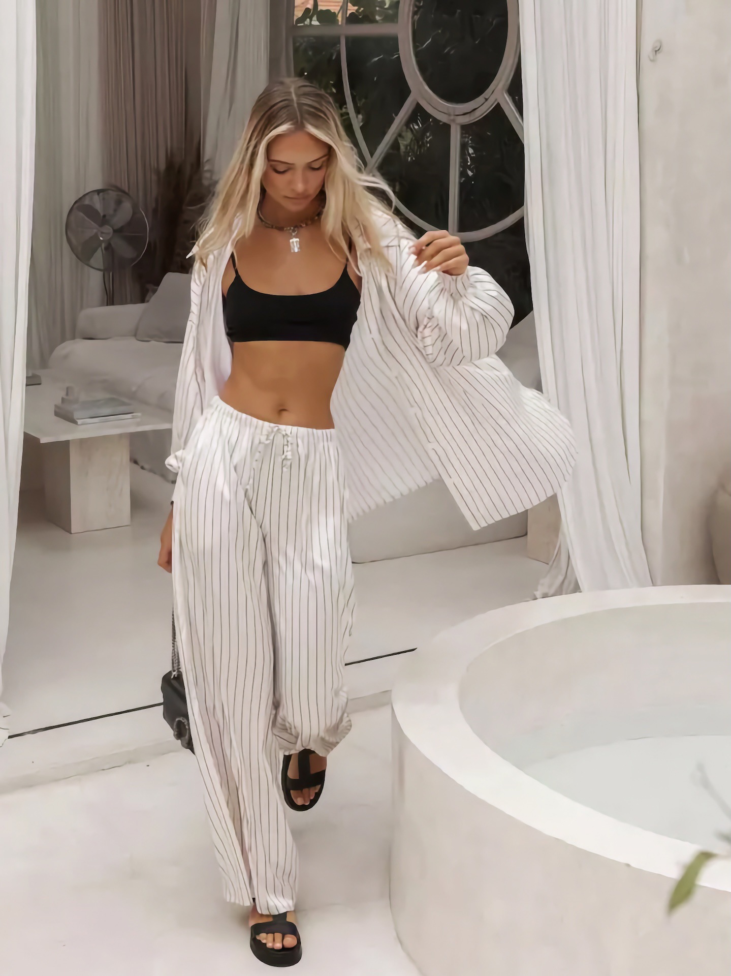 欧美亚马逊跨境2026新款时尚女装休闲家居舒适条纹开衫长裤套装女