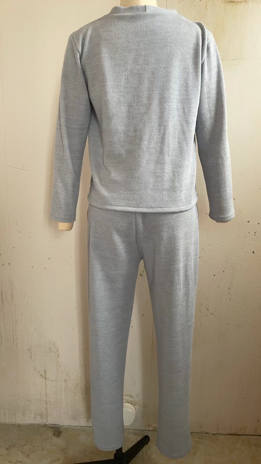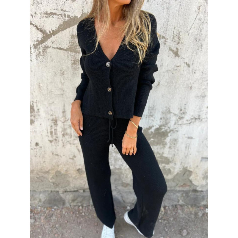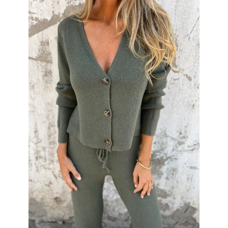 2025亚马逊跨境新款毛衣套装欧美长袖排扣V领针织开襟衫系绳长裤