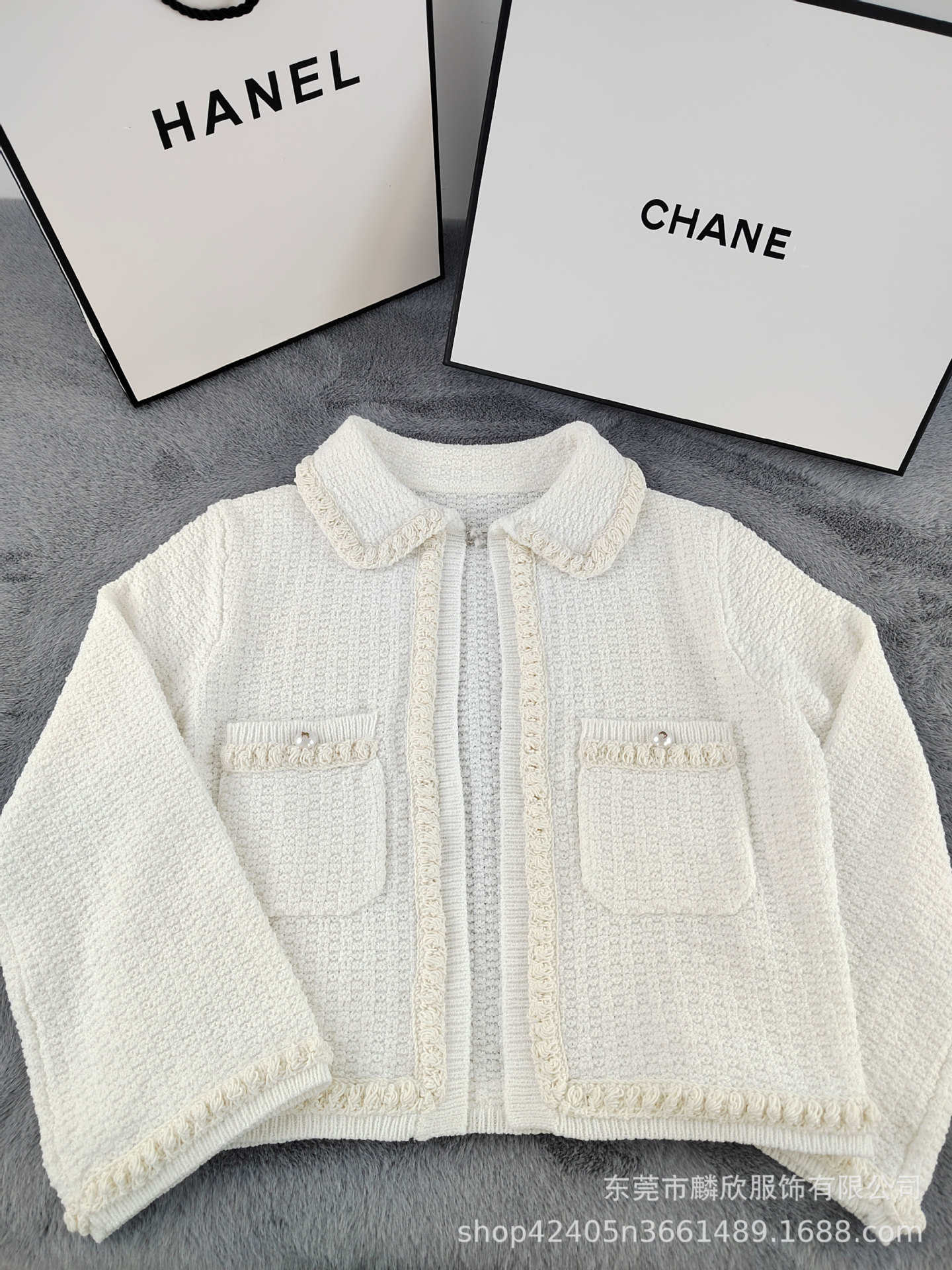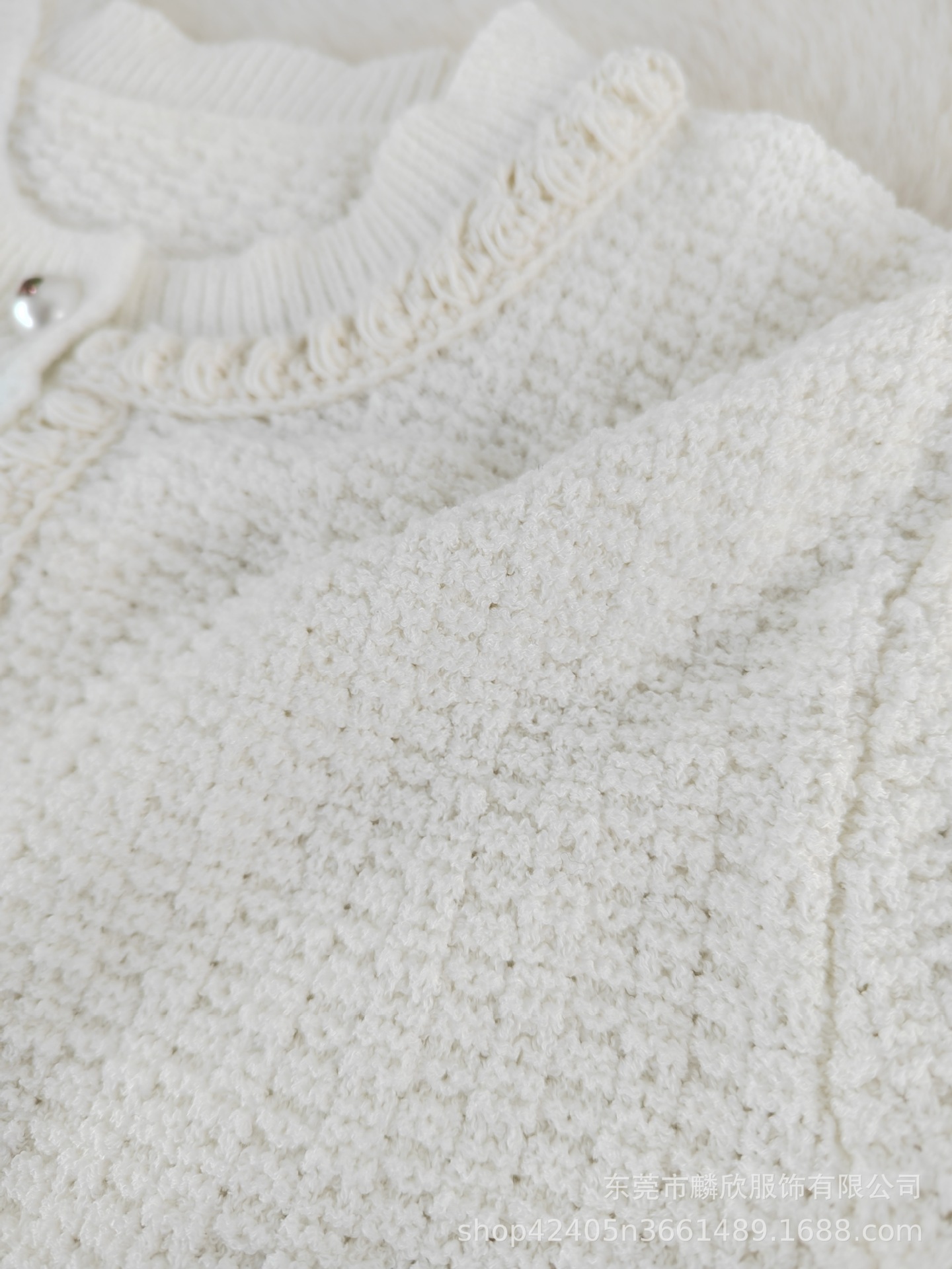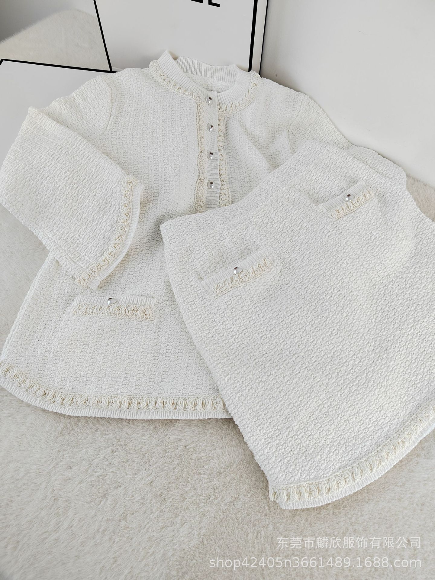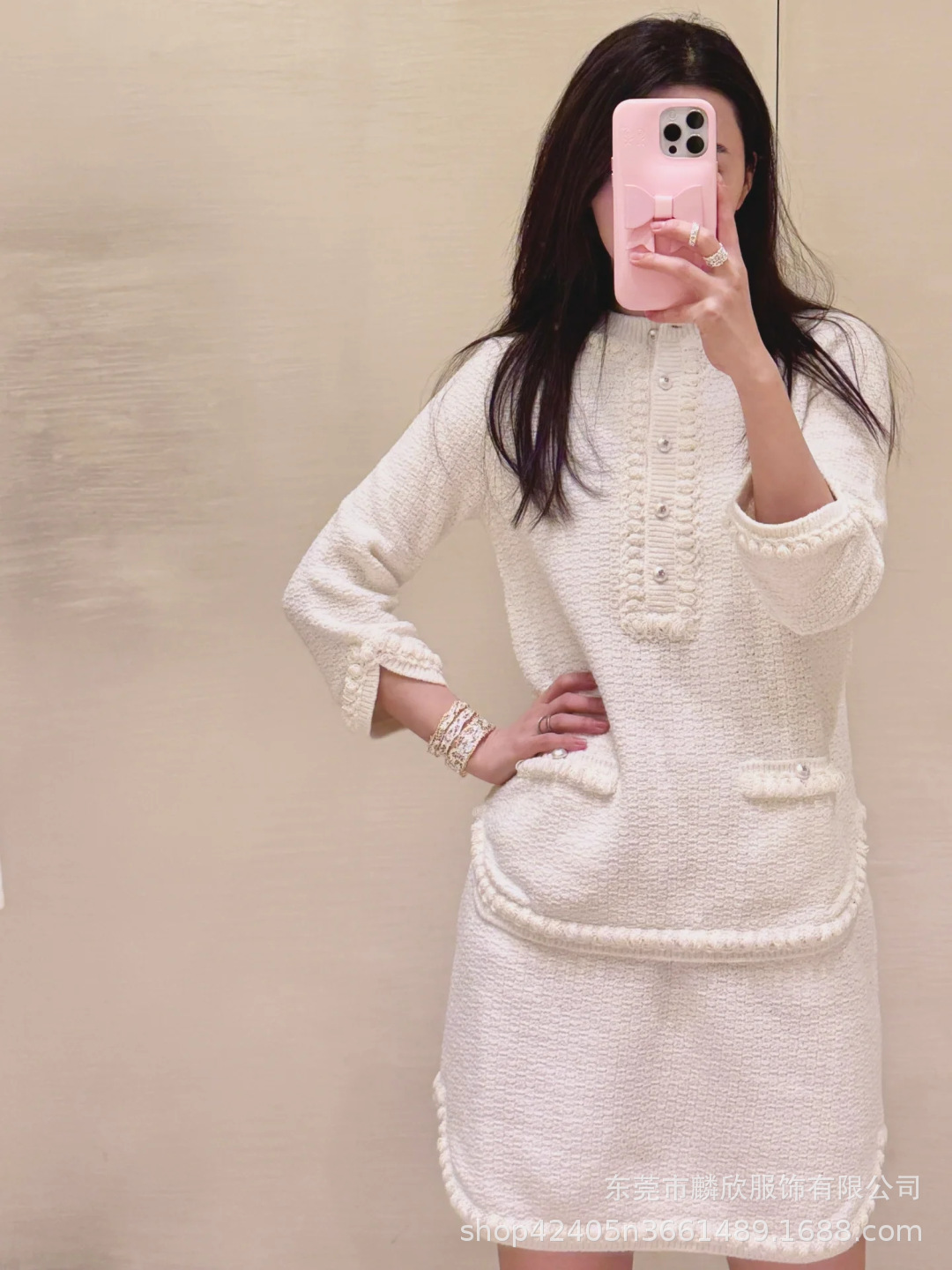 早春新款小香风珍珠扣圆领重工珠链条装饰白色短款外套上衣半裙