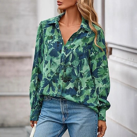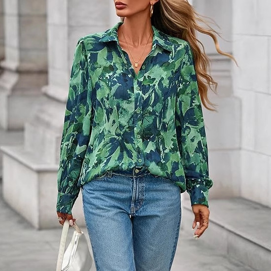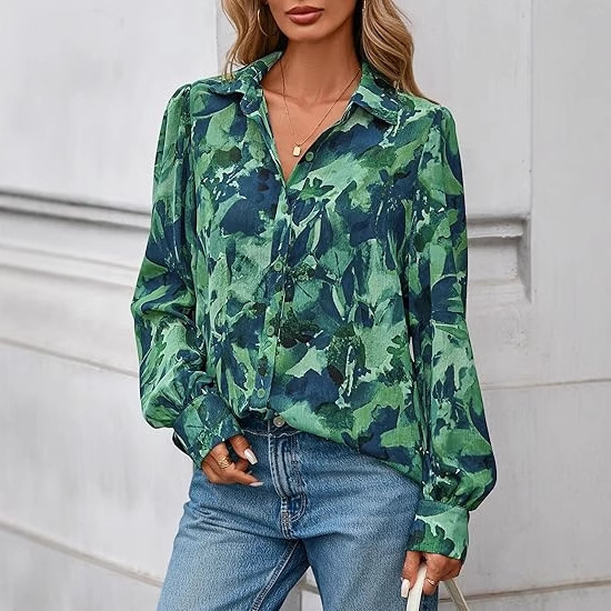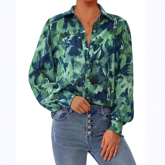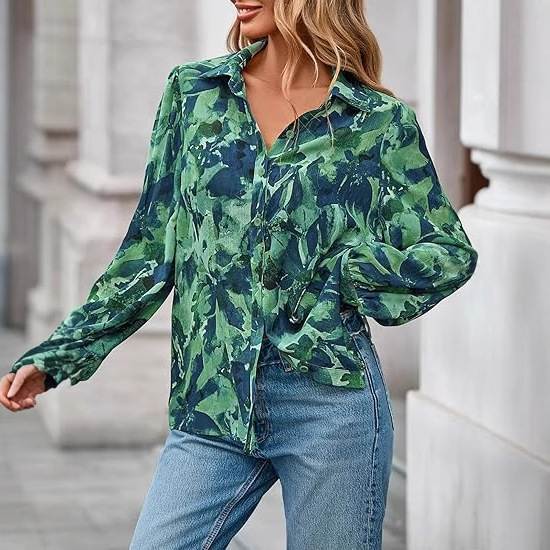 2025秋冬跨境新款彩色印花翻领宽松上衣 女式修身大码长袖衬衫