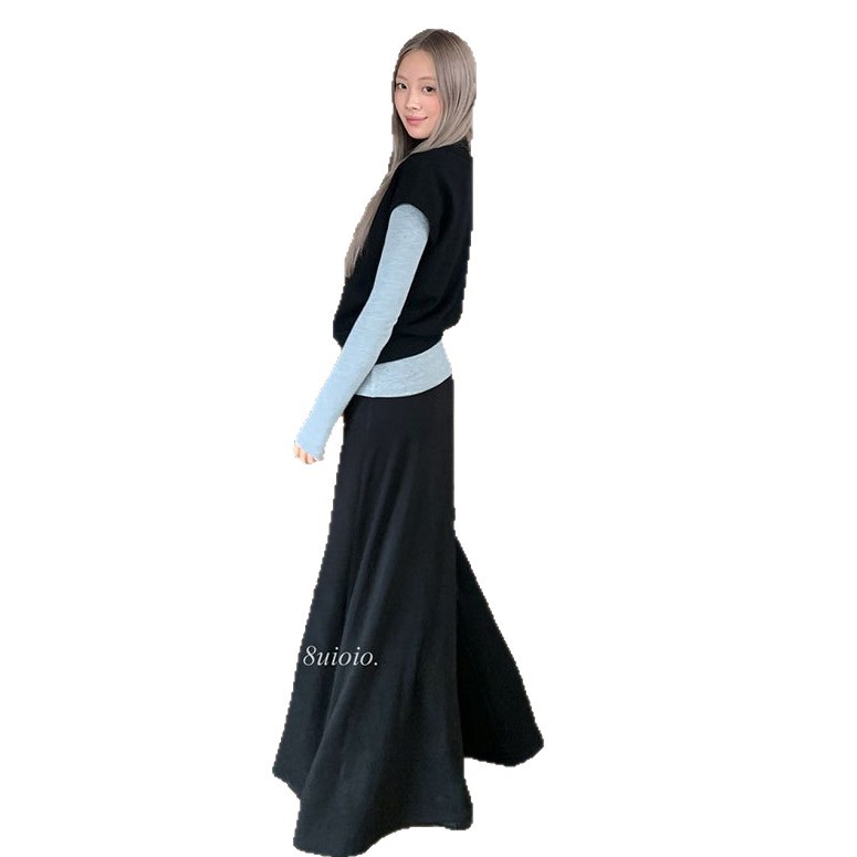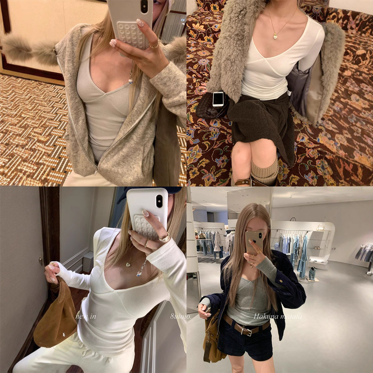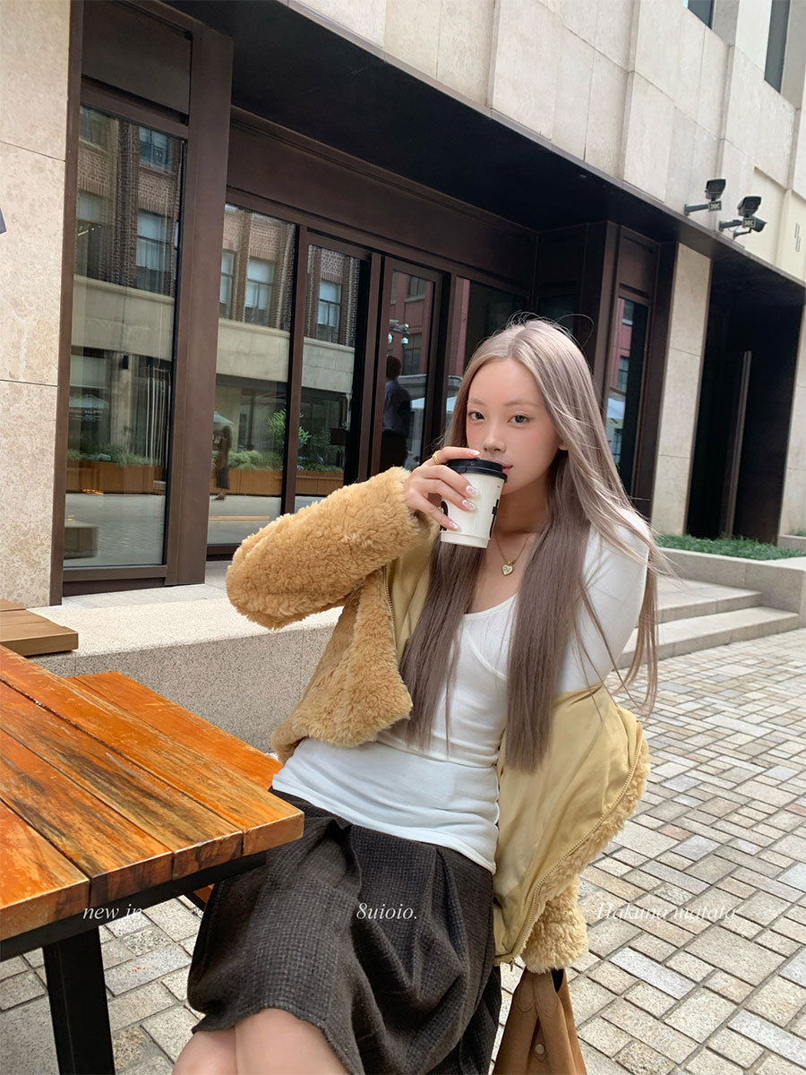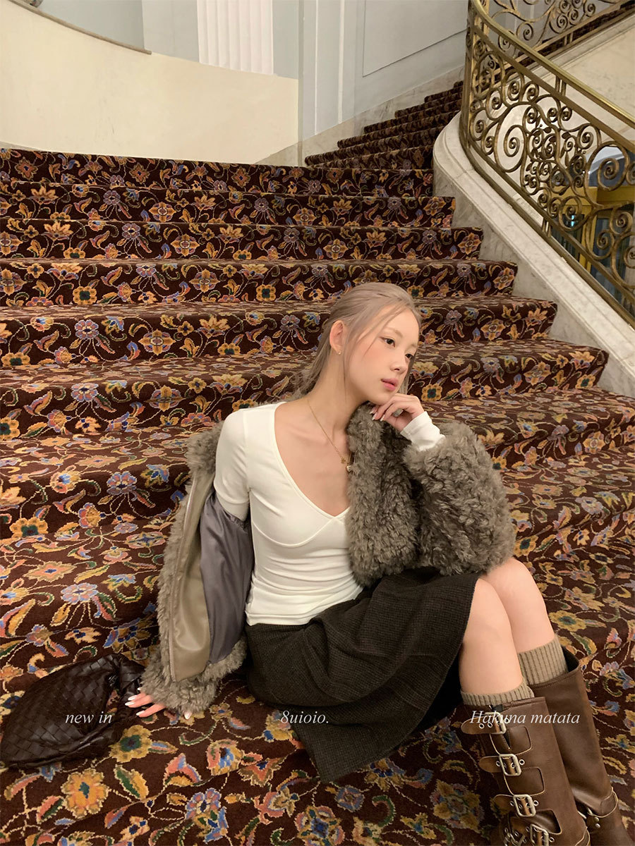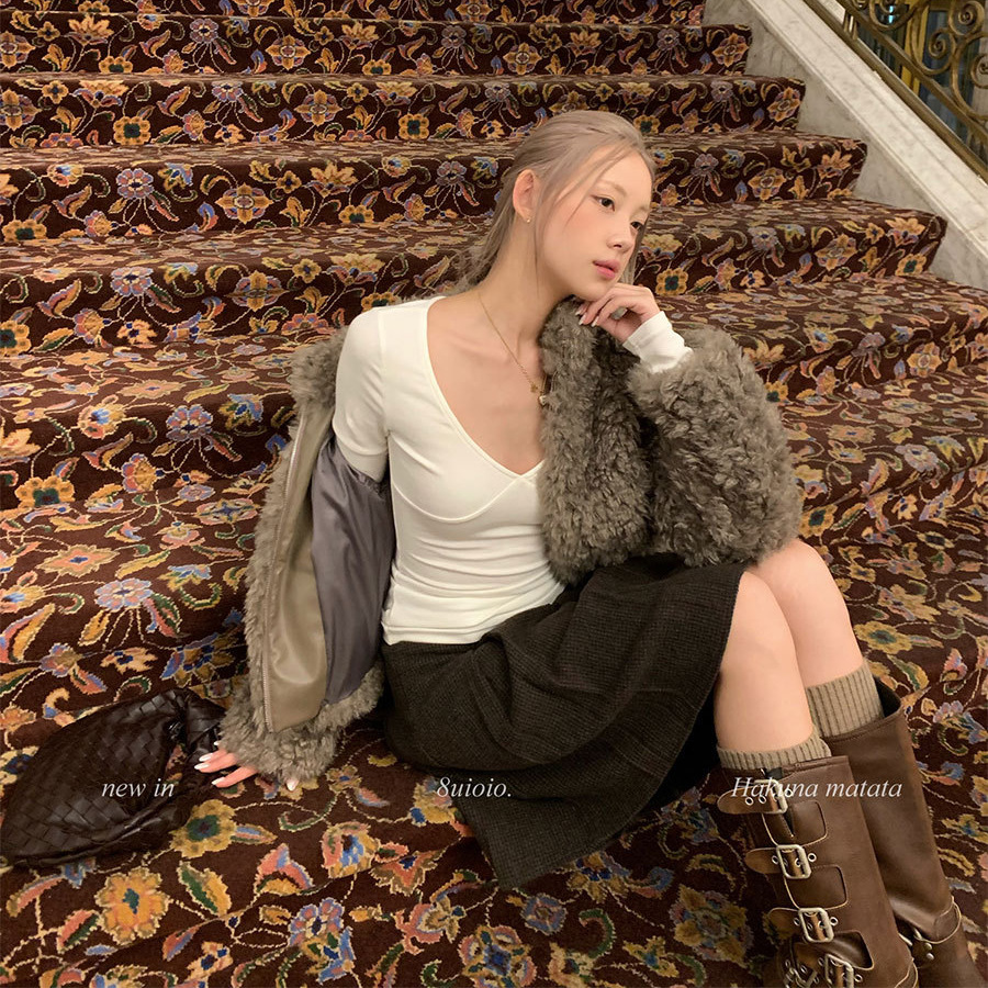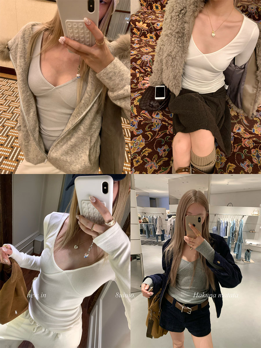 8uioio 特调奶昔 白色v领t恤女2025秋冬新款长袖修身内搭打底上衣