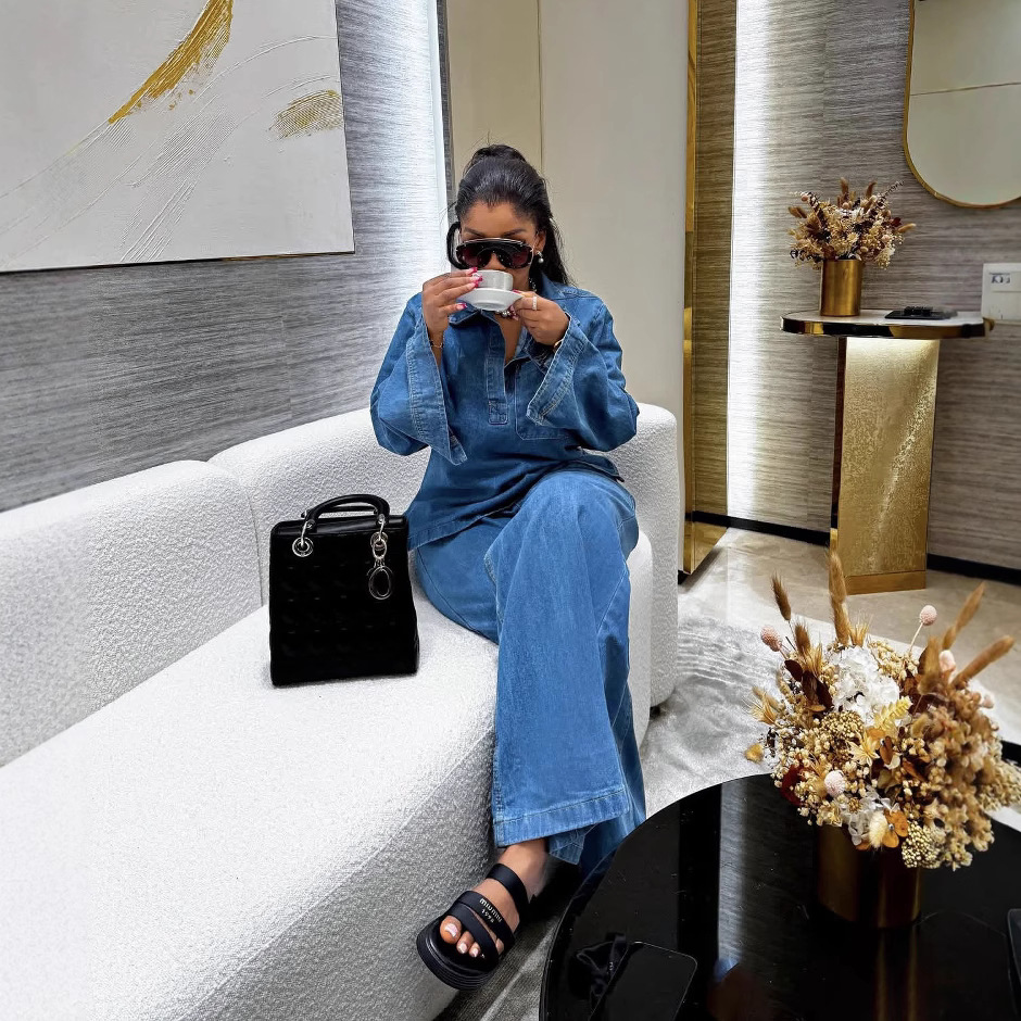 跨境欧美新款女装牛仔套装长袖翻领口袋上衣 系带直筒长裤两件套