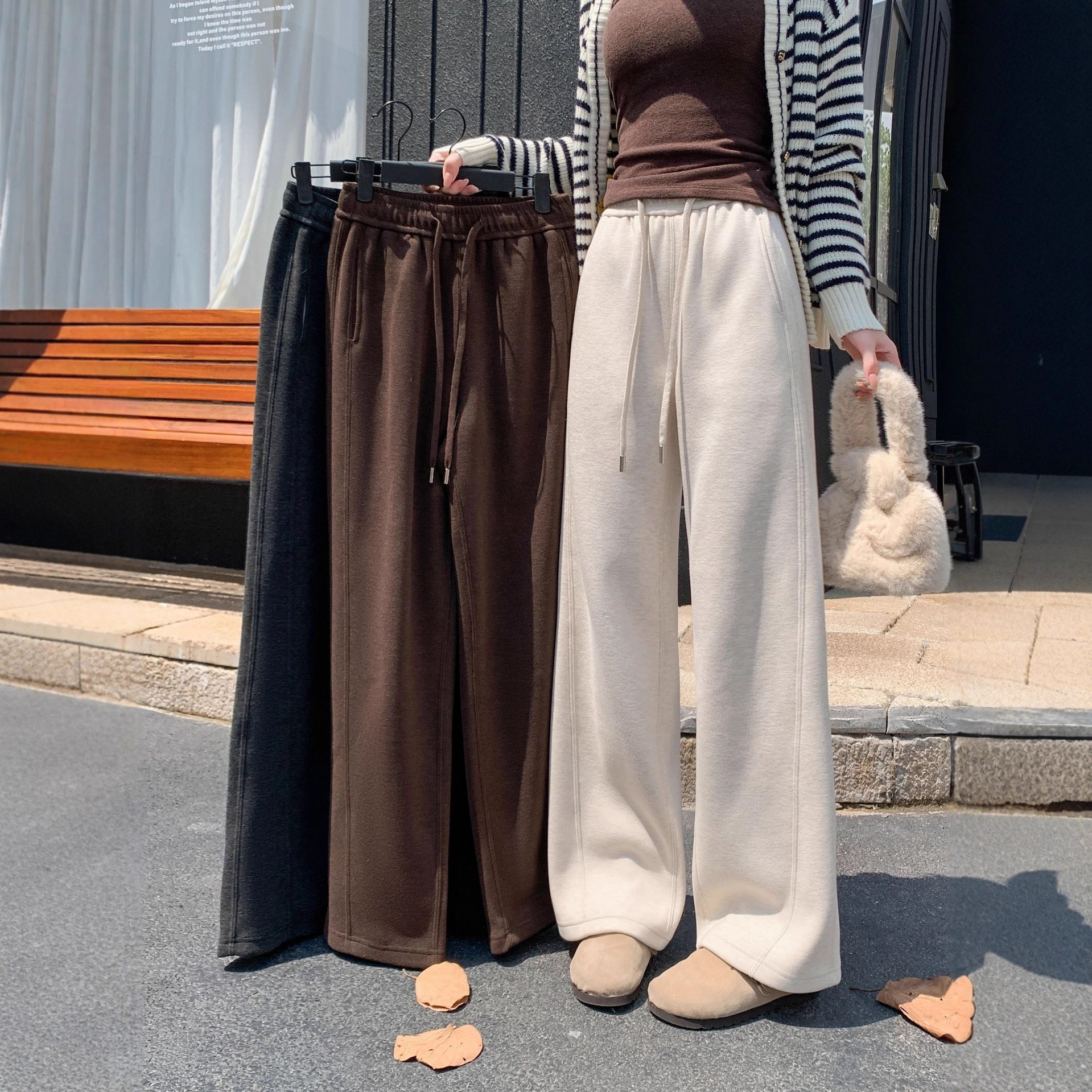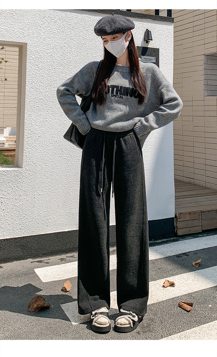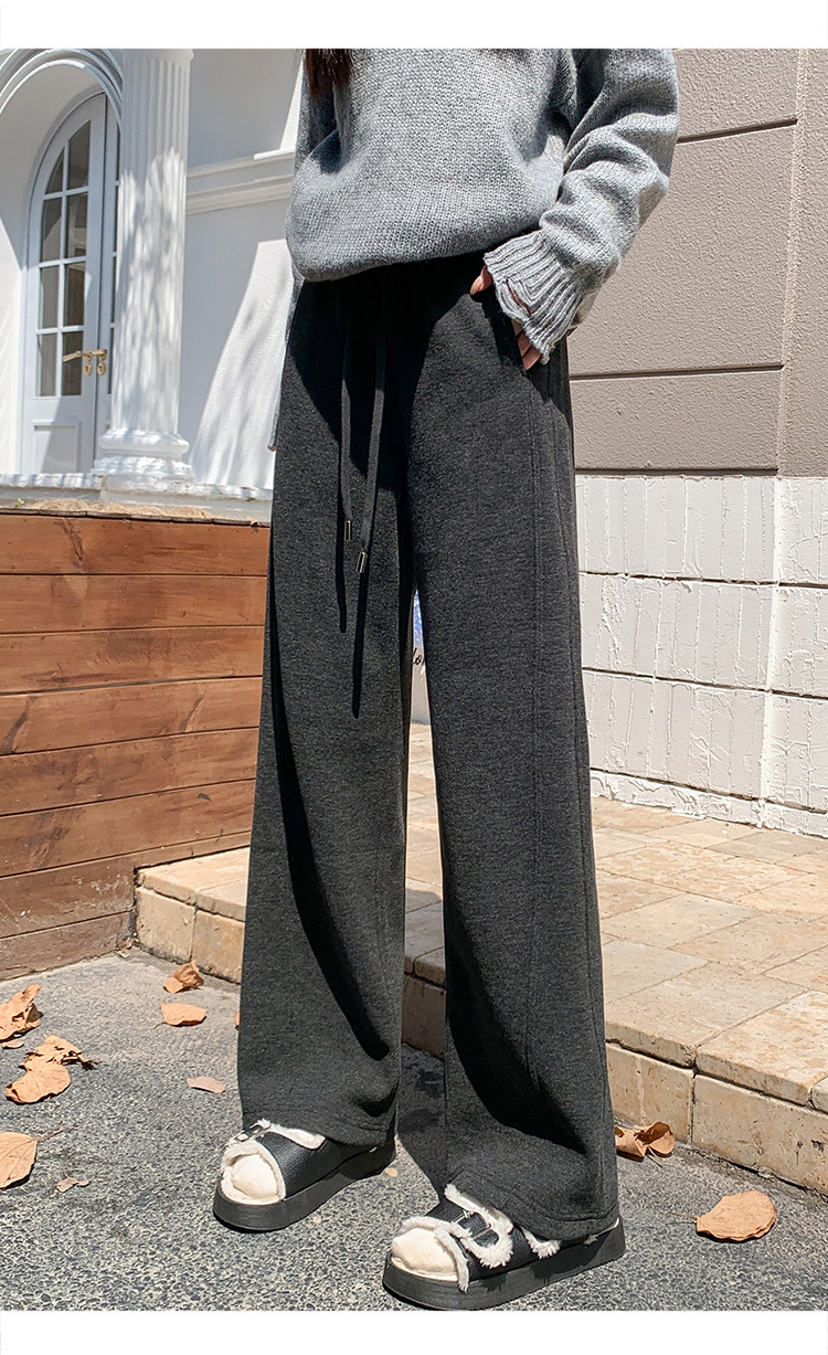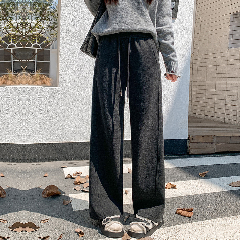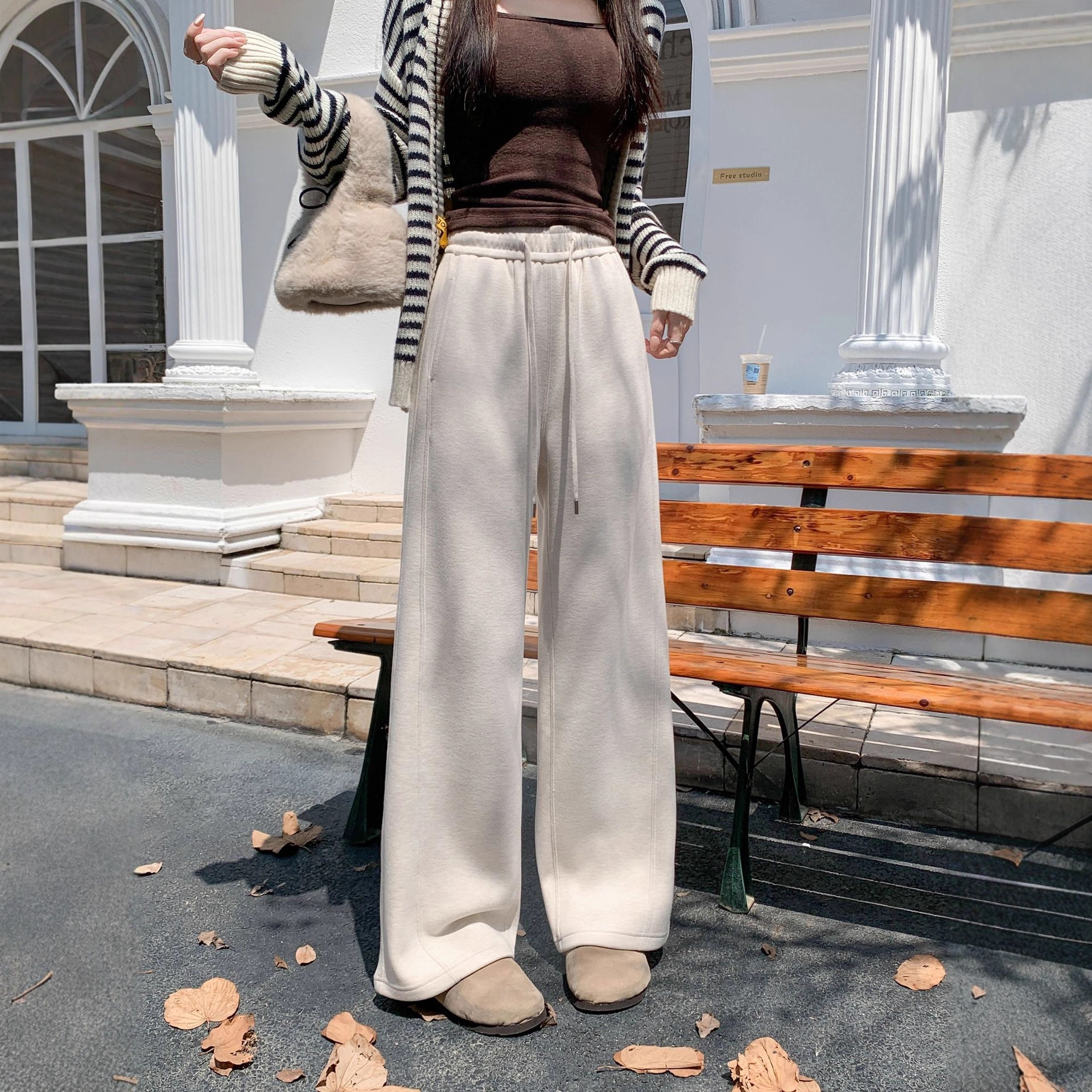 秋冬加绒醋酸羊绒灰色阔腿休闲裤女宽松bf慵懒风坠感长裤拖地软糯