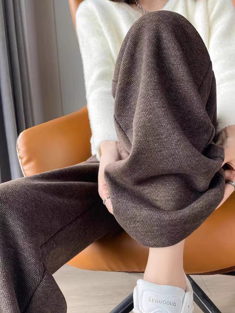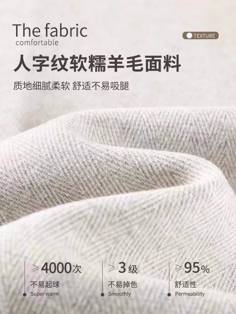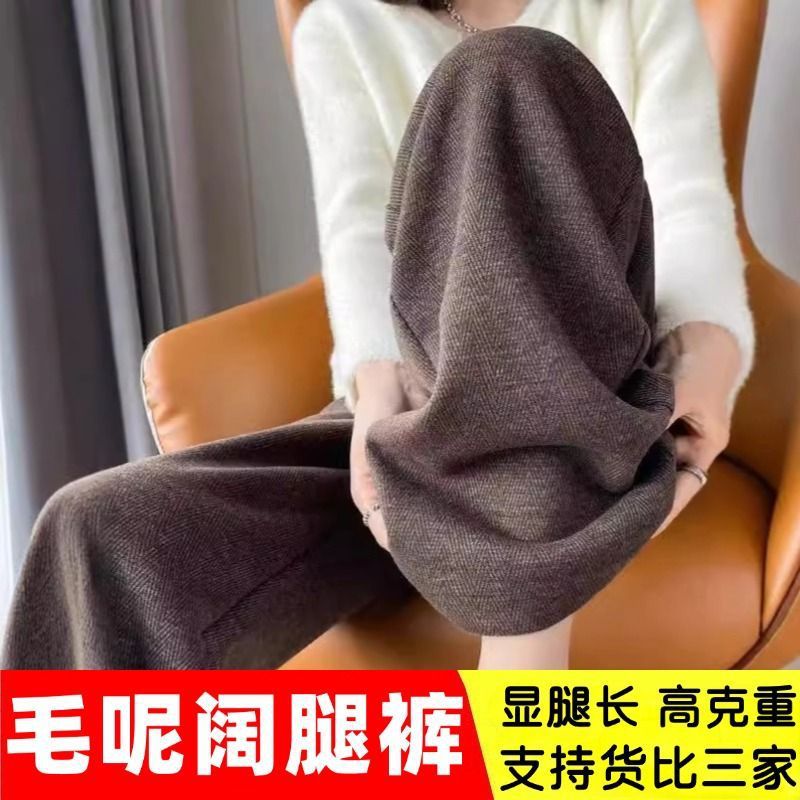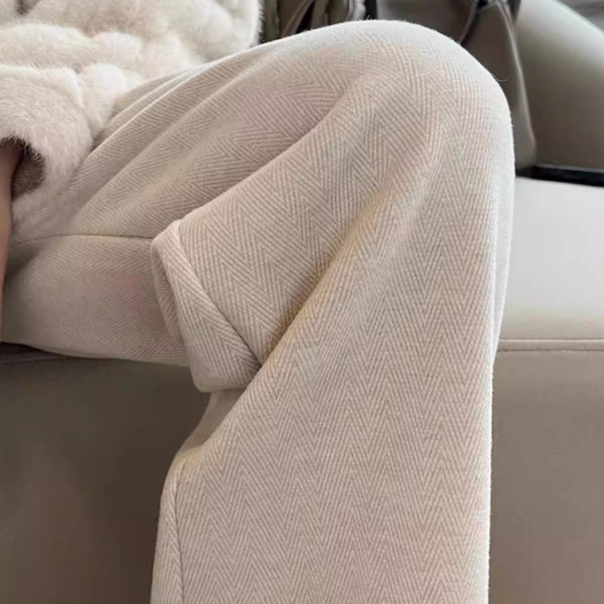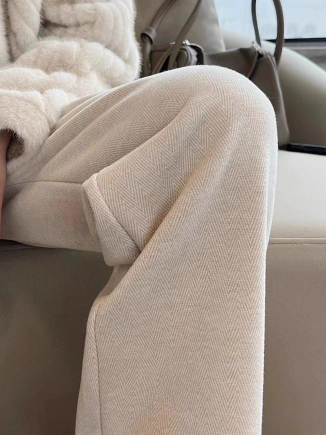 鄂尔多斯市100正品高档羊毛呢加绒阔腿裤女人字纹宽松垂感休闲裤