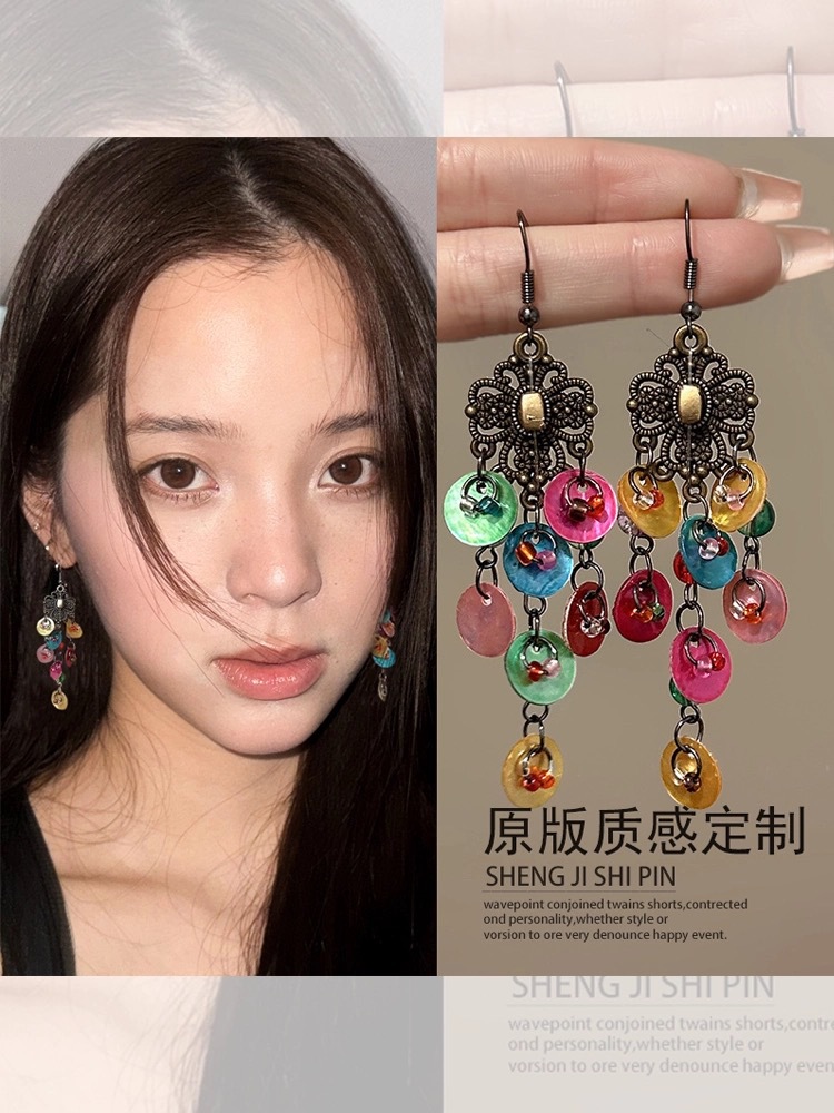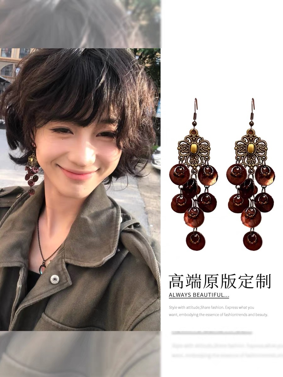 民族风红色串珠流苏波西米亚耳环云南旅游度假风小众耳夹羽毛耳饰