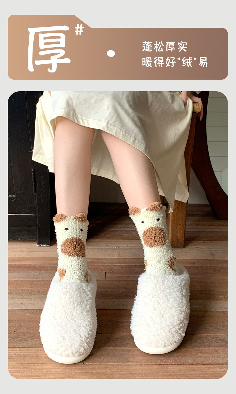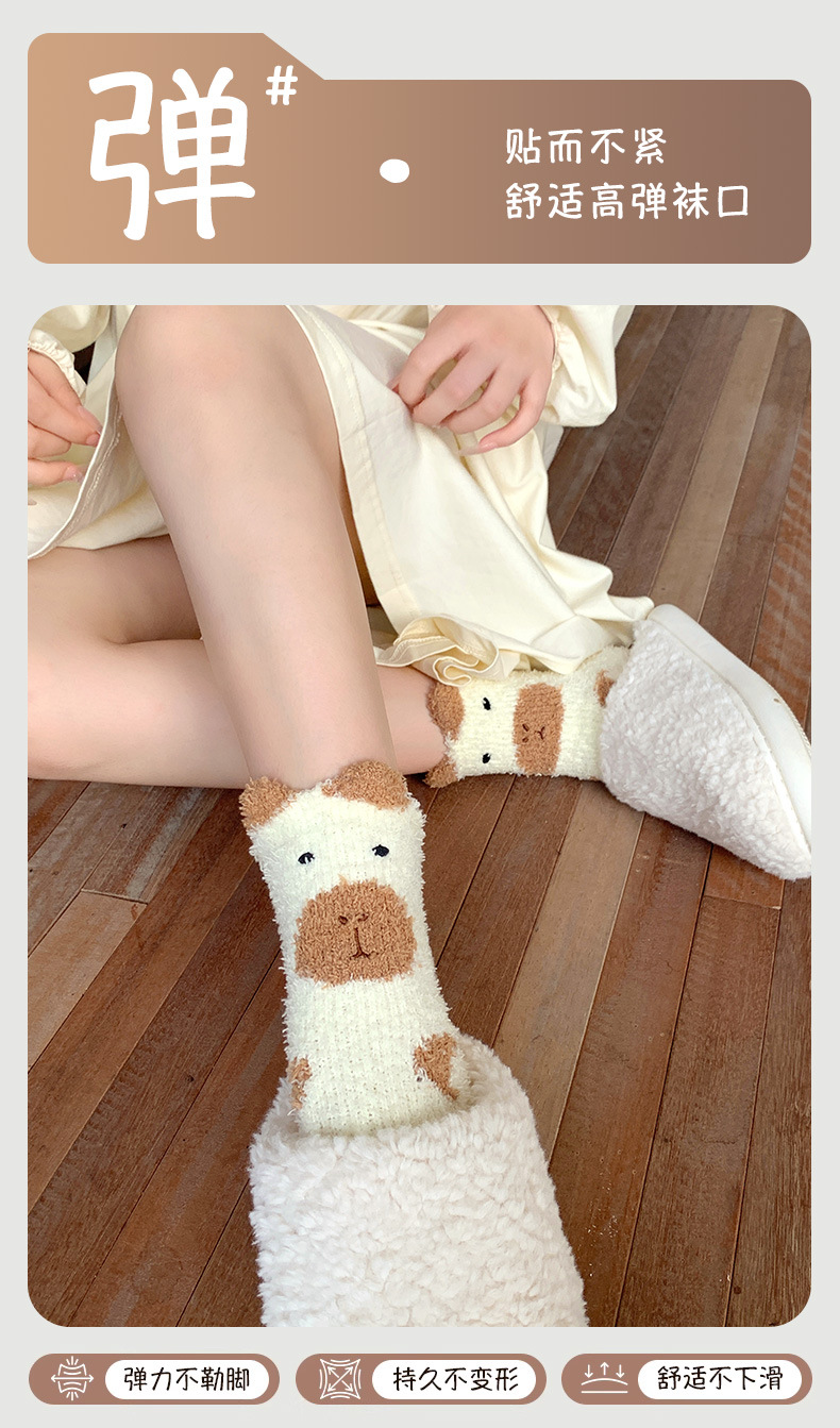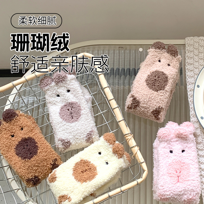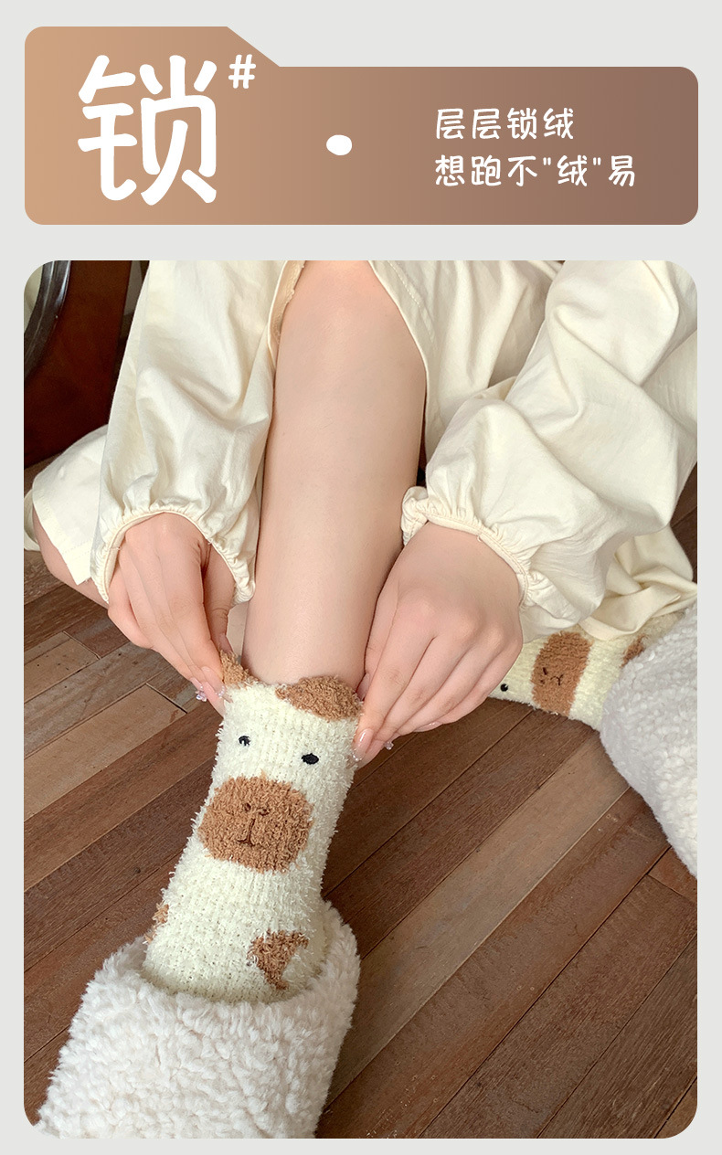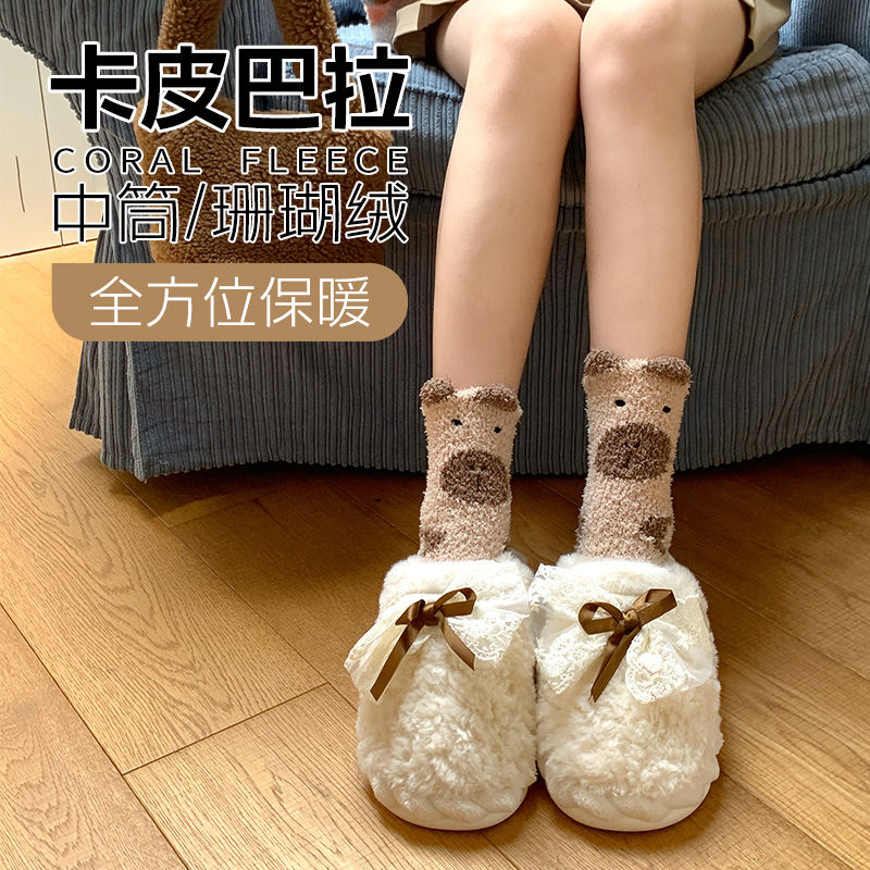 珊瑚绒袜子女卡皮巴拉中筒袜冬季加厚保暖毛茸卡通袜子韩版睡眠袜