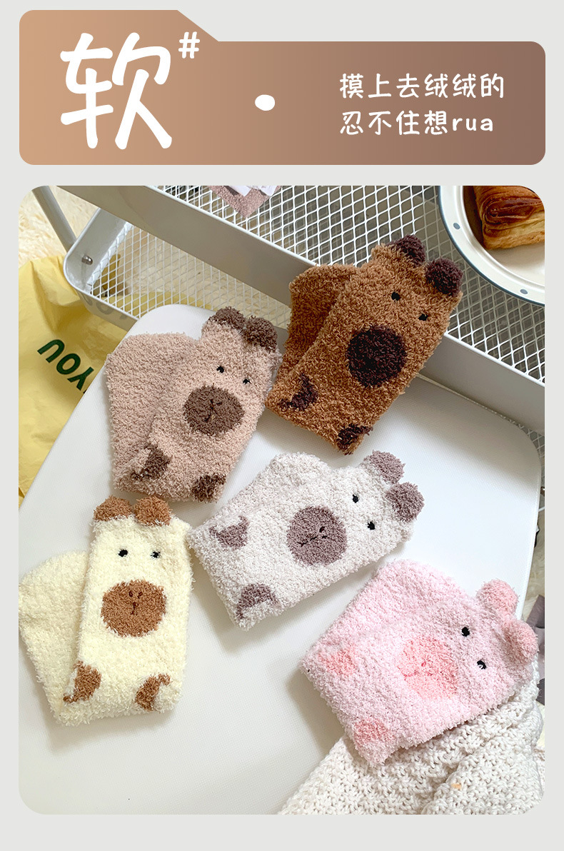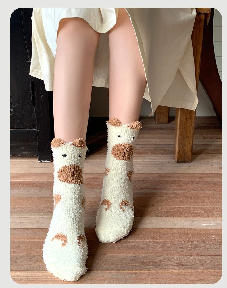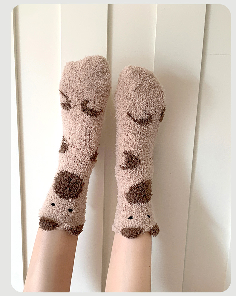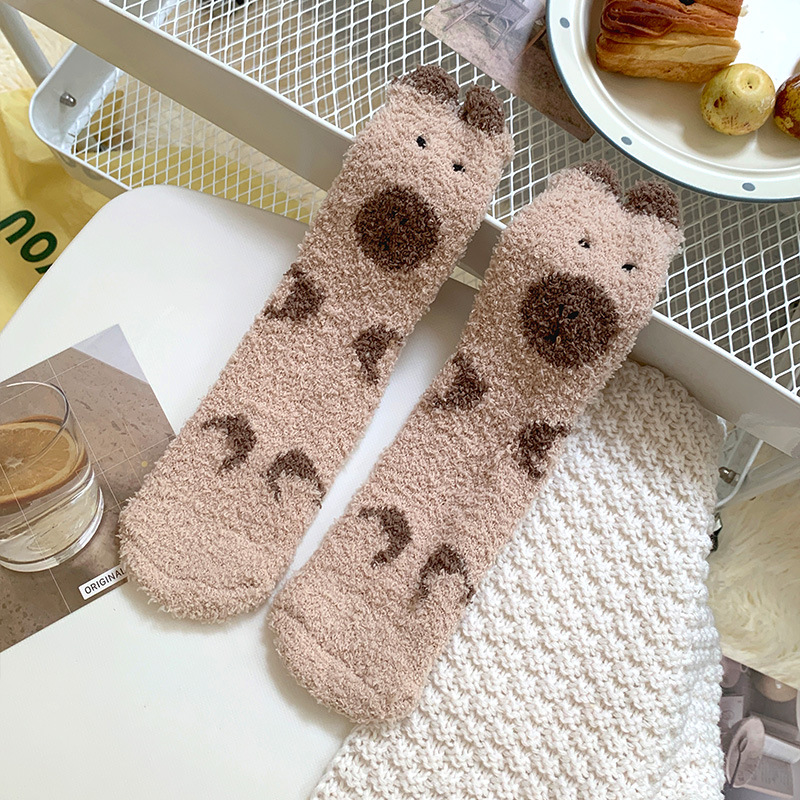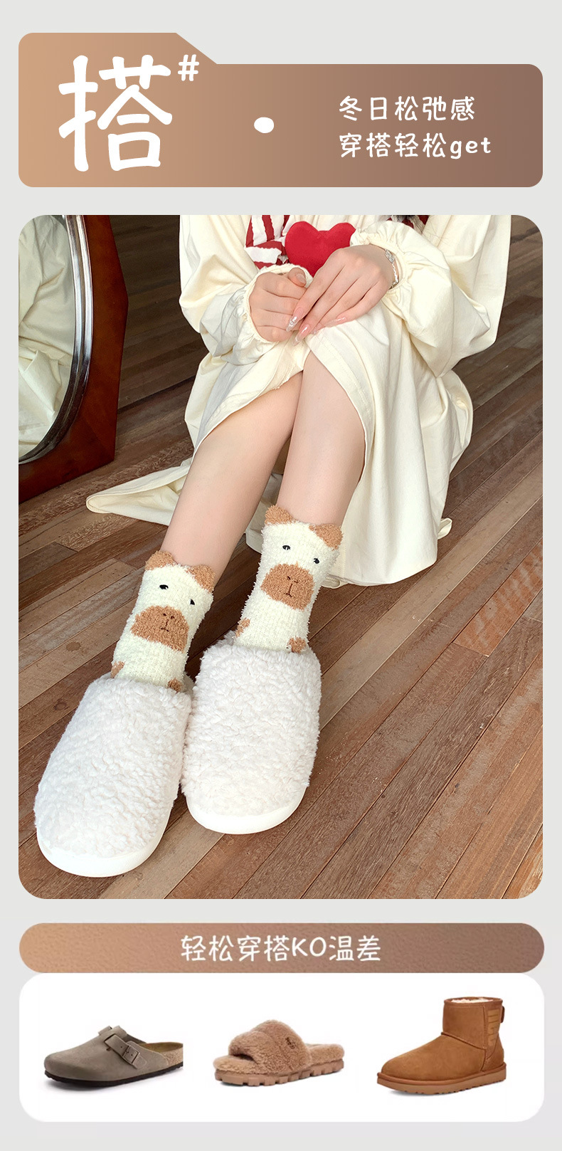 珊瑚绒袜子女卡皮巴拉中筒袜冬季加厚保暖毛茸卡通袜子韩版睡眠袜